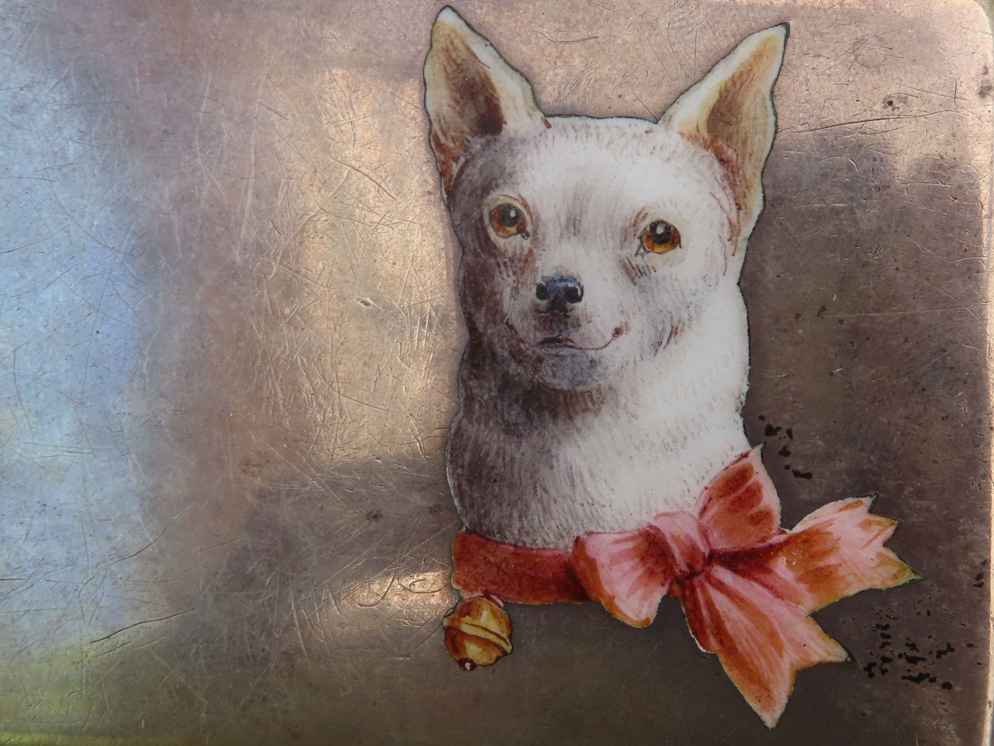 白チワワ(おそらく?)のエナメル画が描かれています。