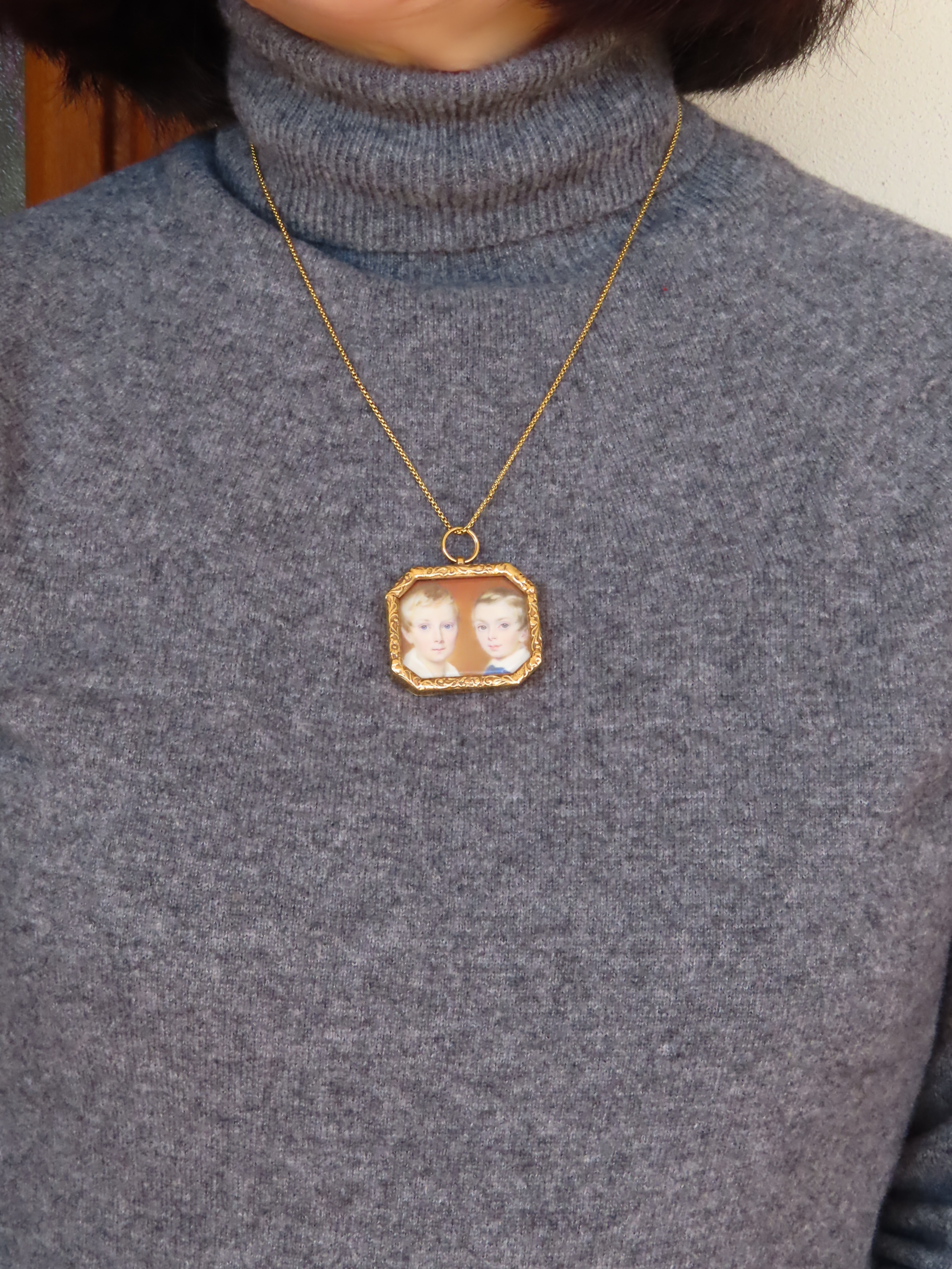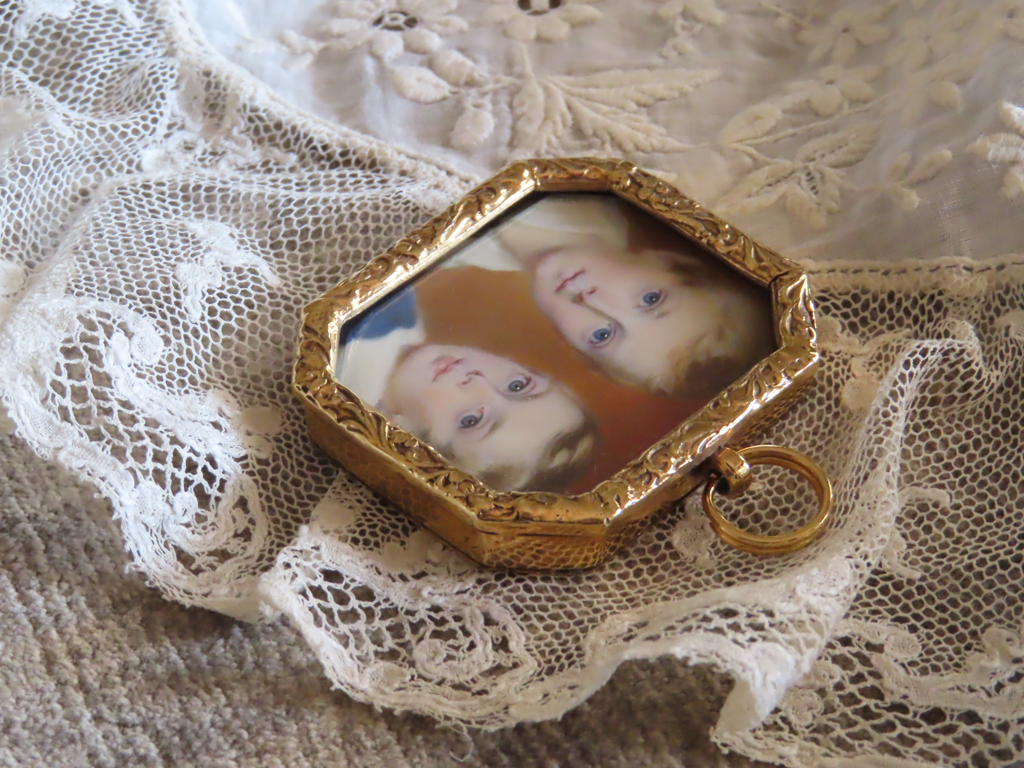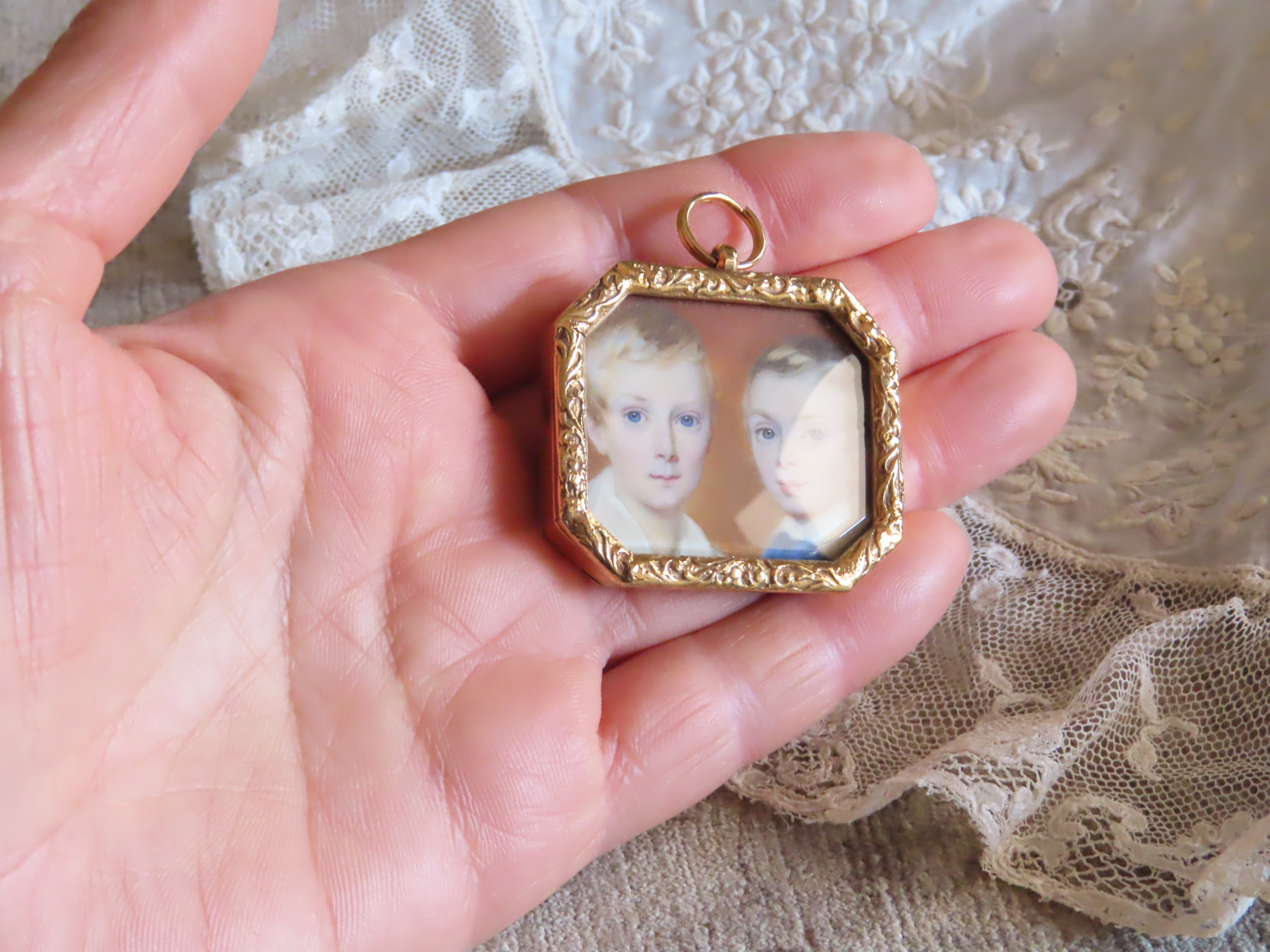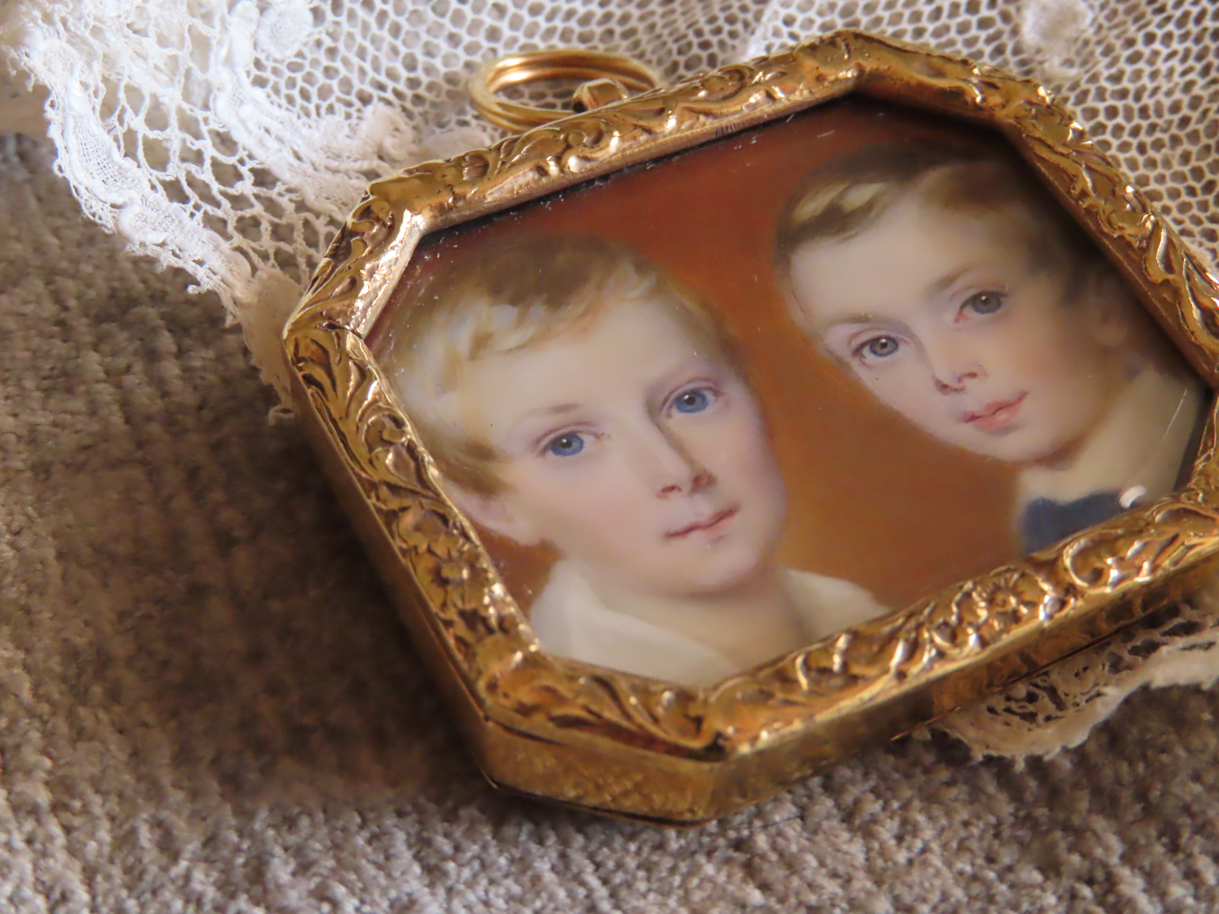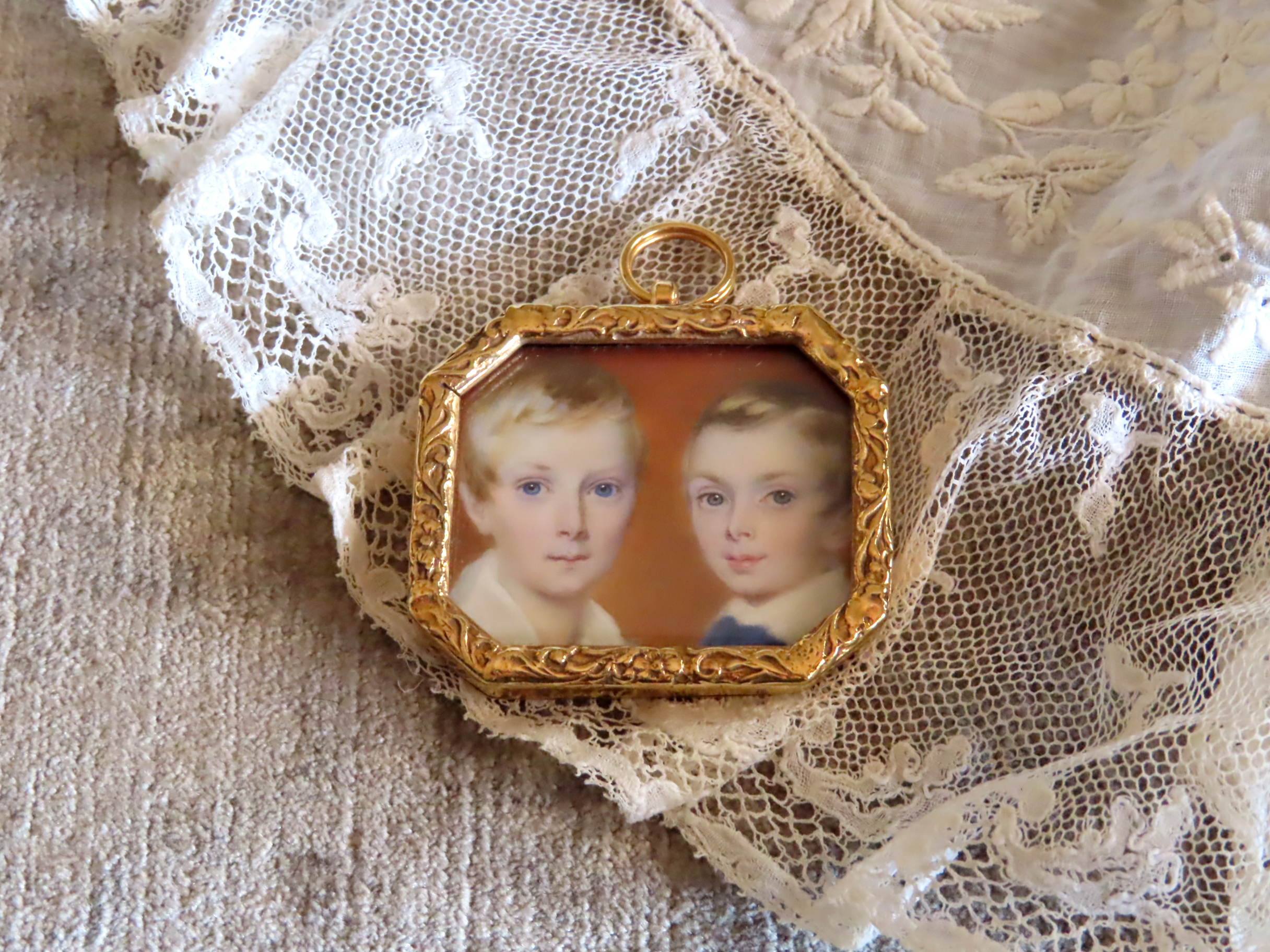 1830-40年頃の、象牙の薄板の上に描かれた、ふたりの少年の肖像画ブローチです。