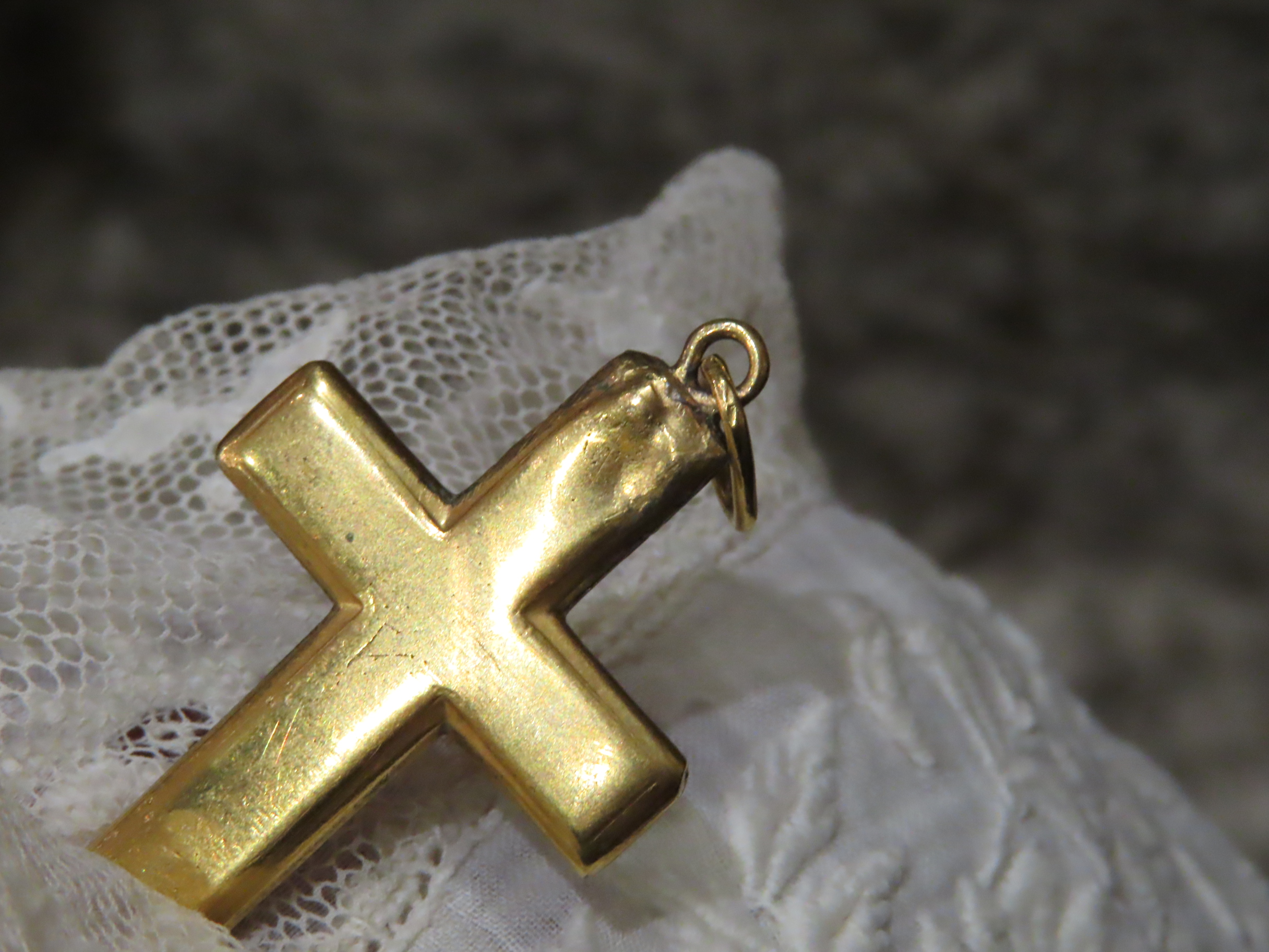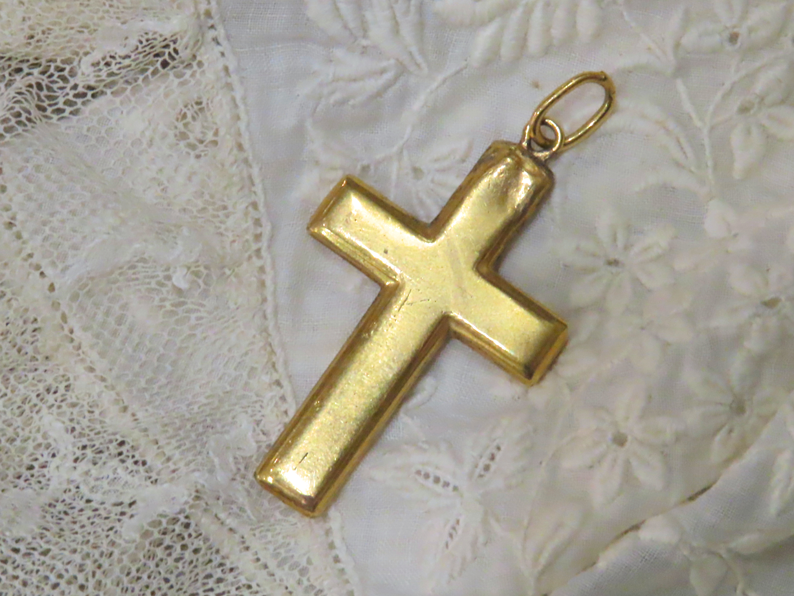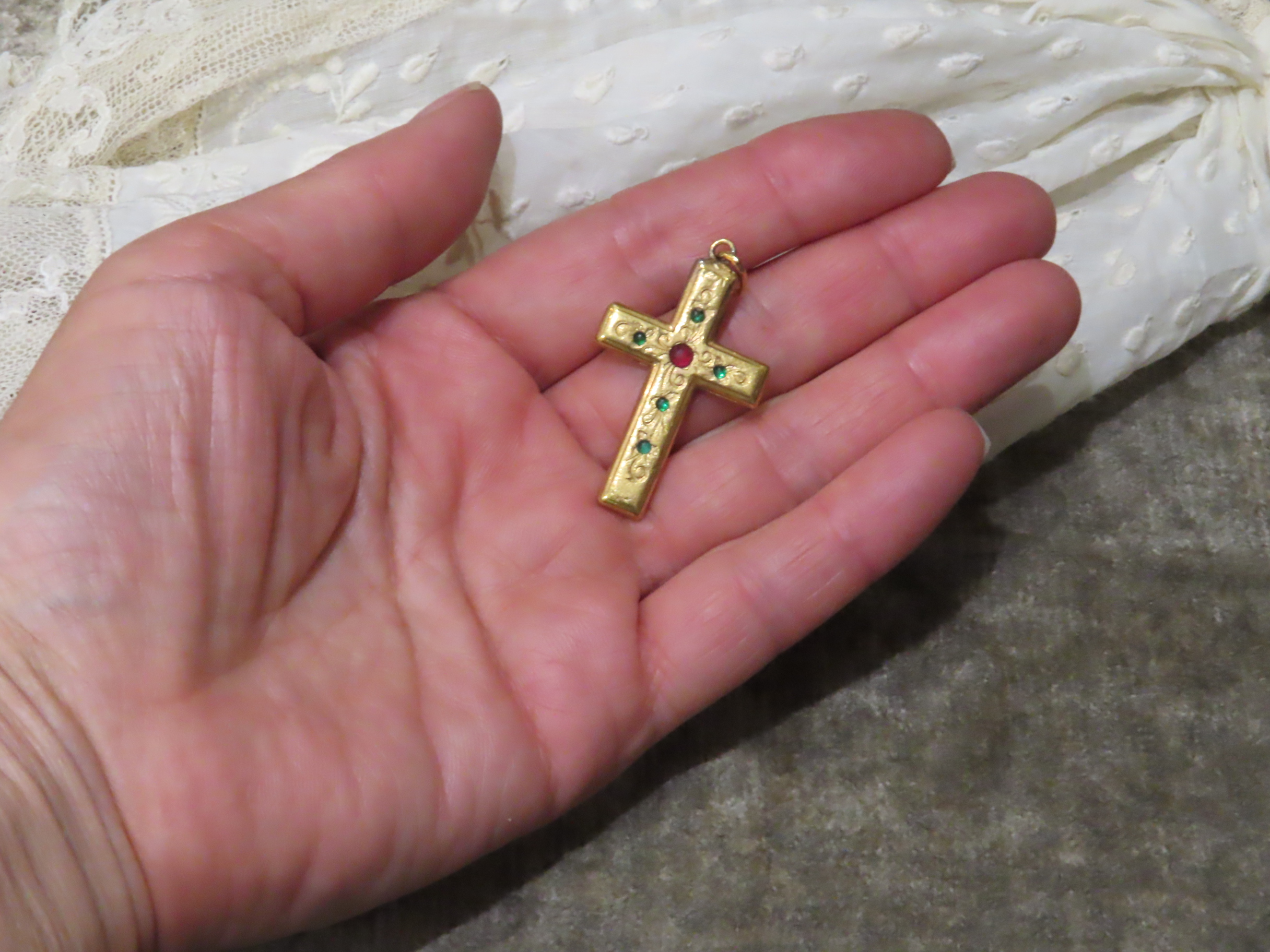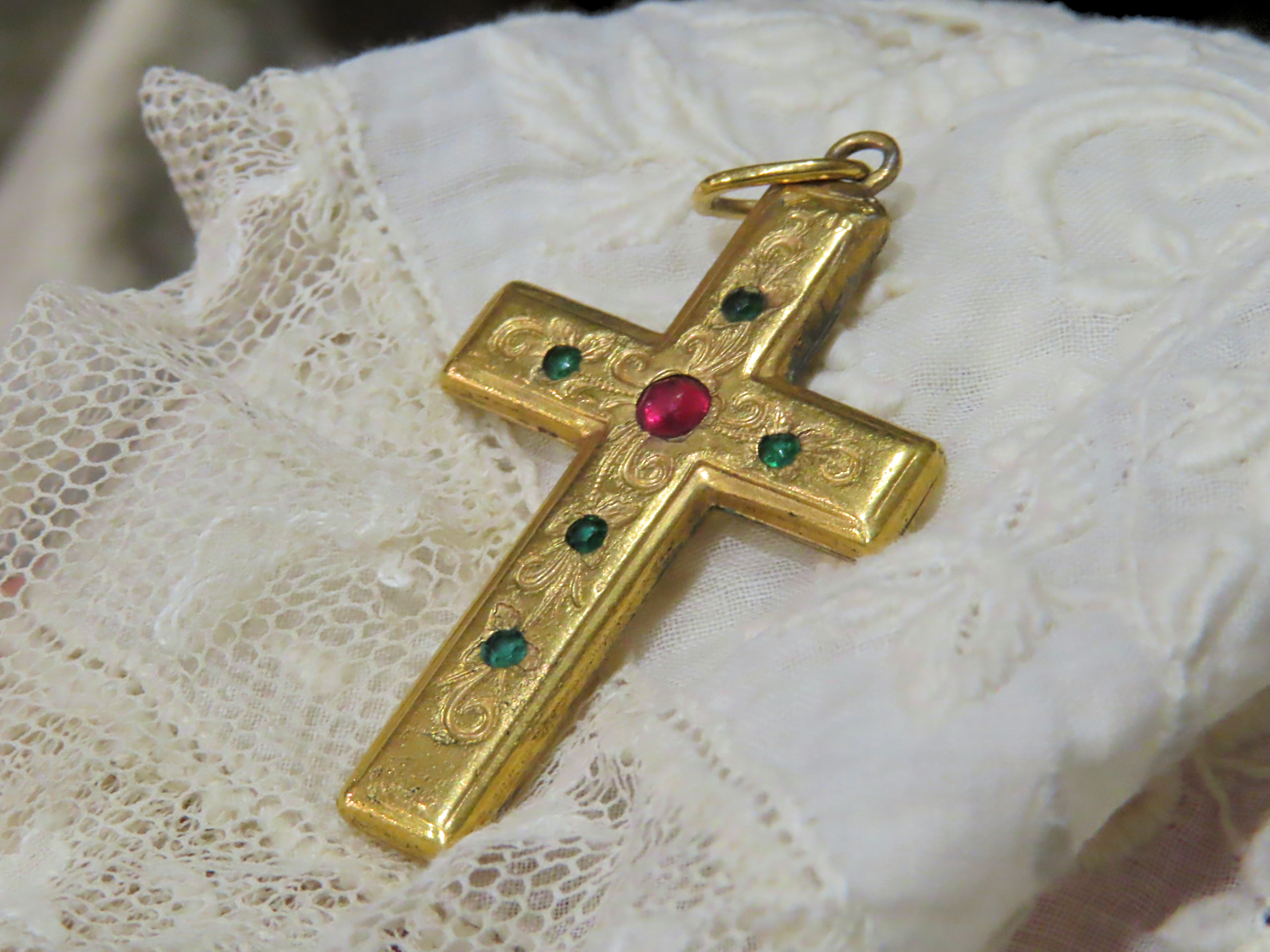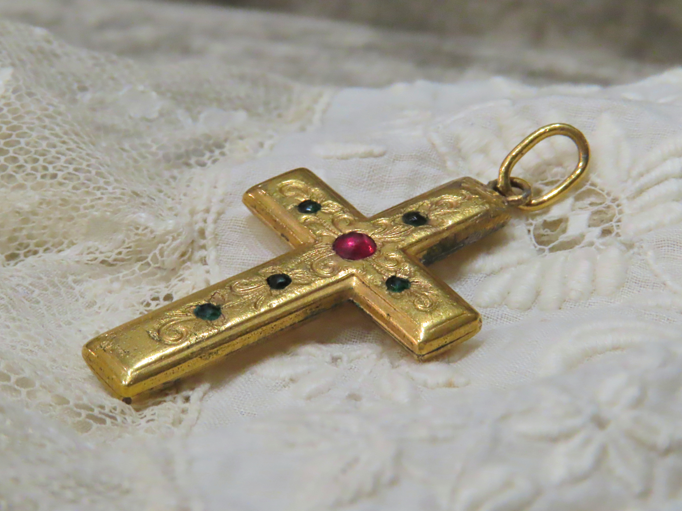 小さなクロスながら、ルビーとエメラルドのコントラストが美しく、手彫りの模様の陰影も魅力あるお品物。
