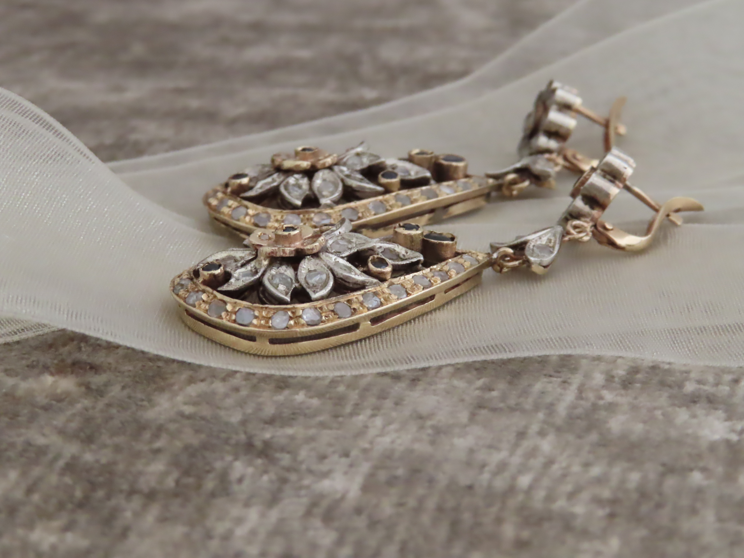 ドロップの周りのダイヤはフラットカット、その他は、スリーファセットローズカット、ラフカット、フラットカットです。
