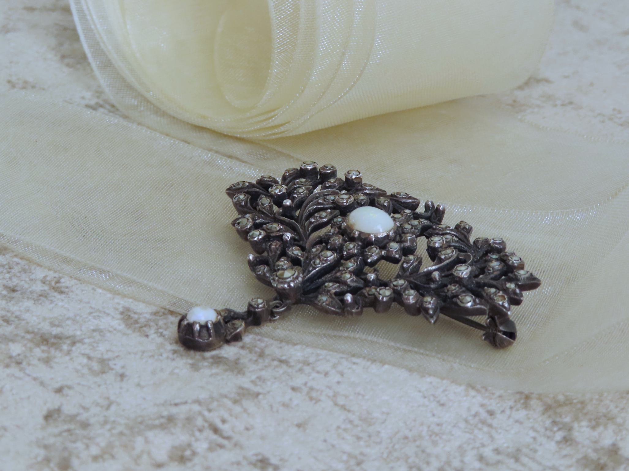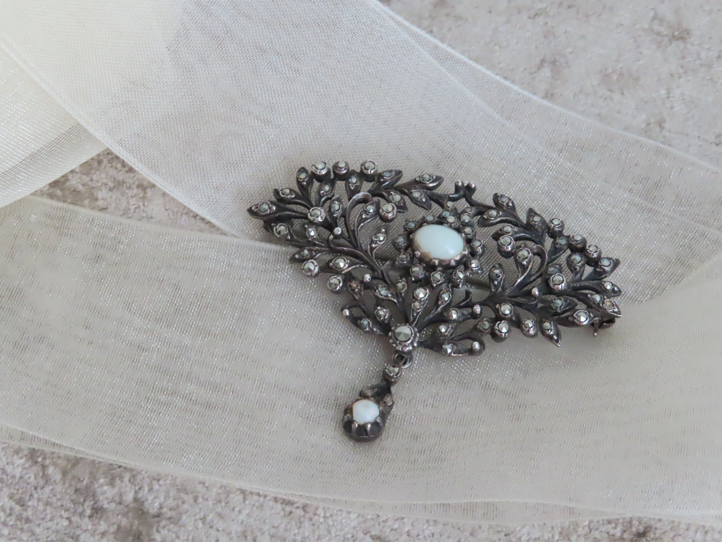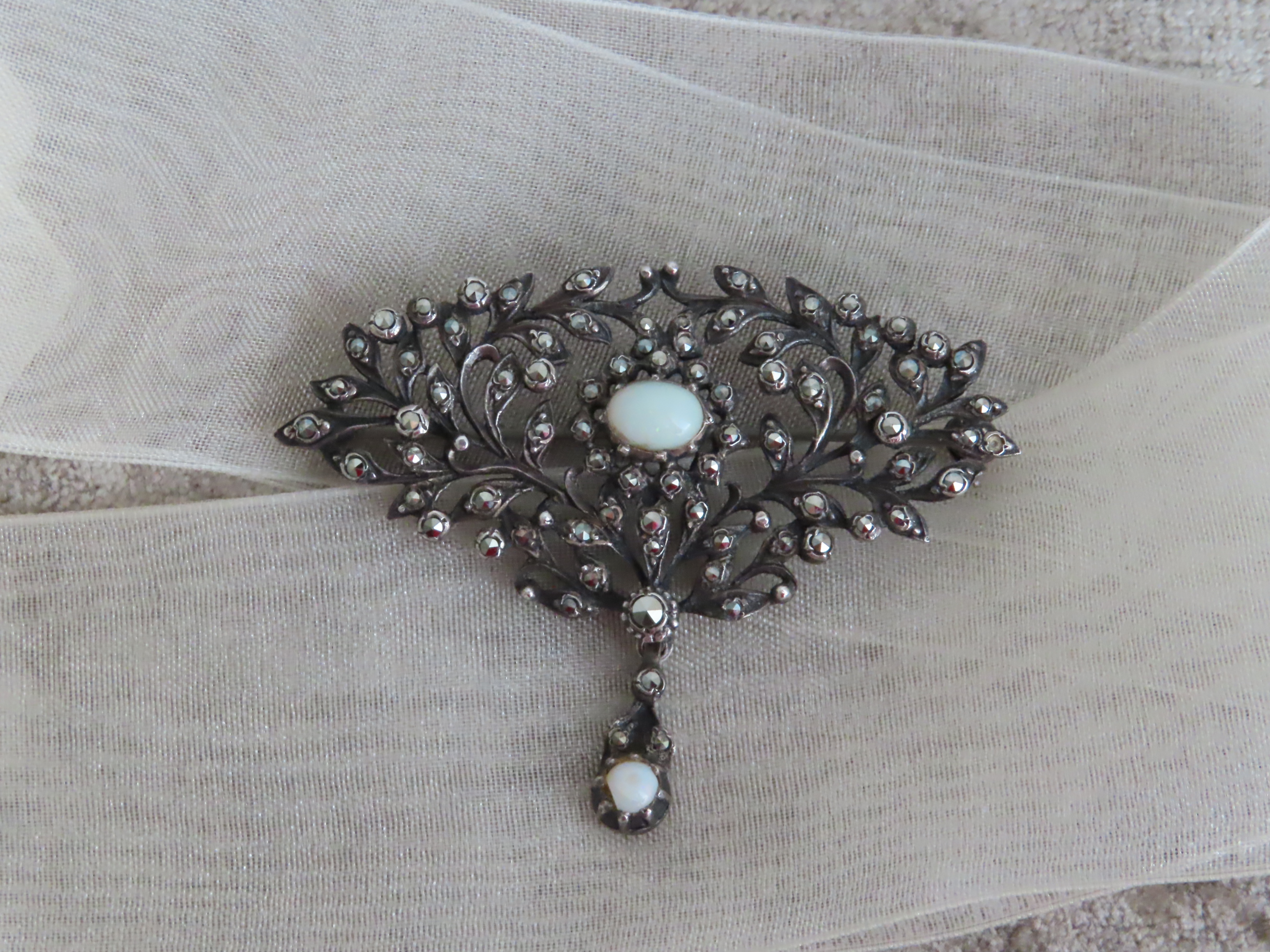 透け感が軽やかで、渋く光る銀台とマルカジットの中の、明るい月のようなオパールが印象的なブローチです。