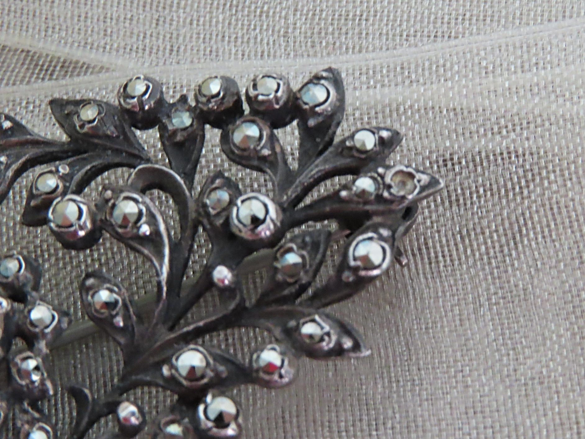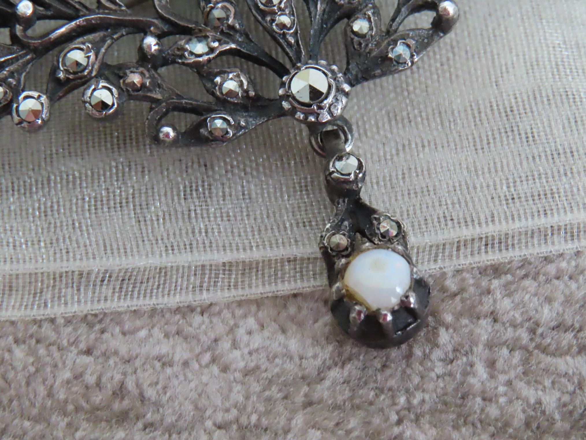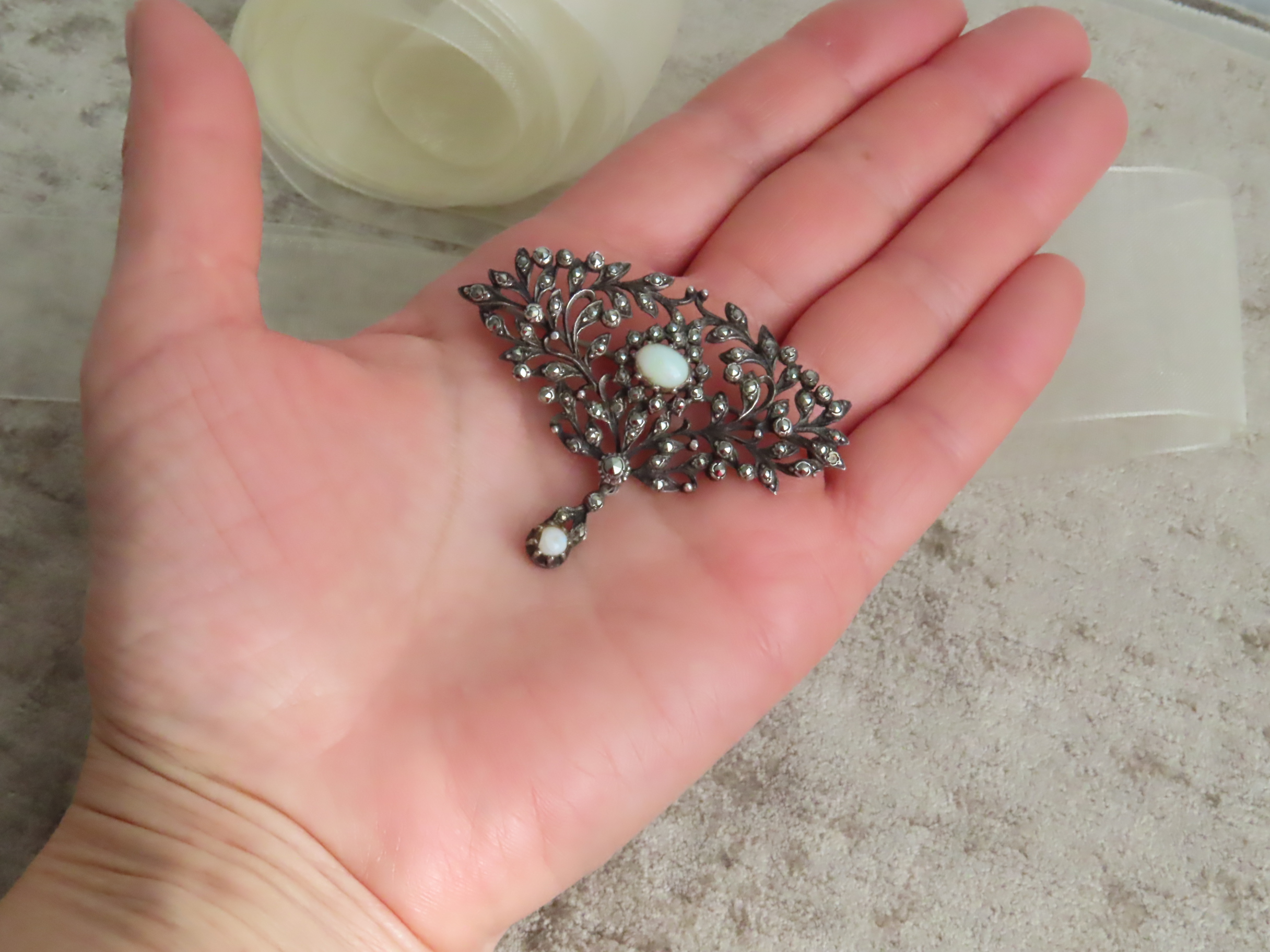 透け感が軽やかで、渋く光る銀台とマルカジットの中の、明るい月のようなオパールが印象的なブローチです。