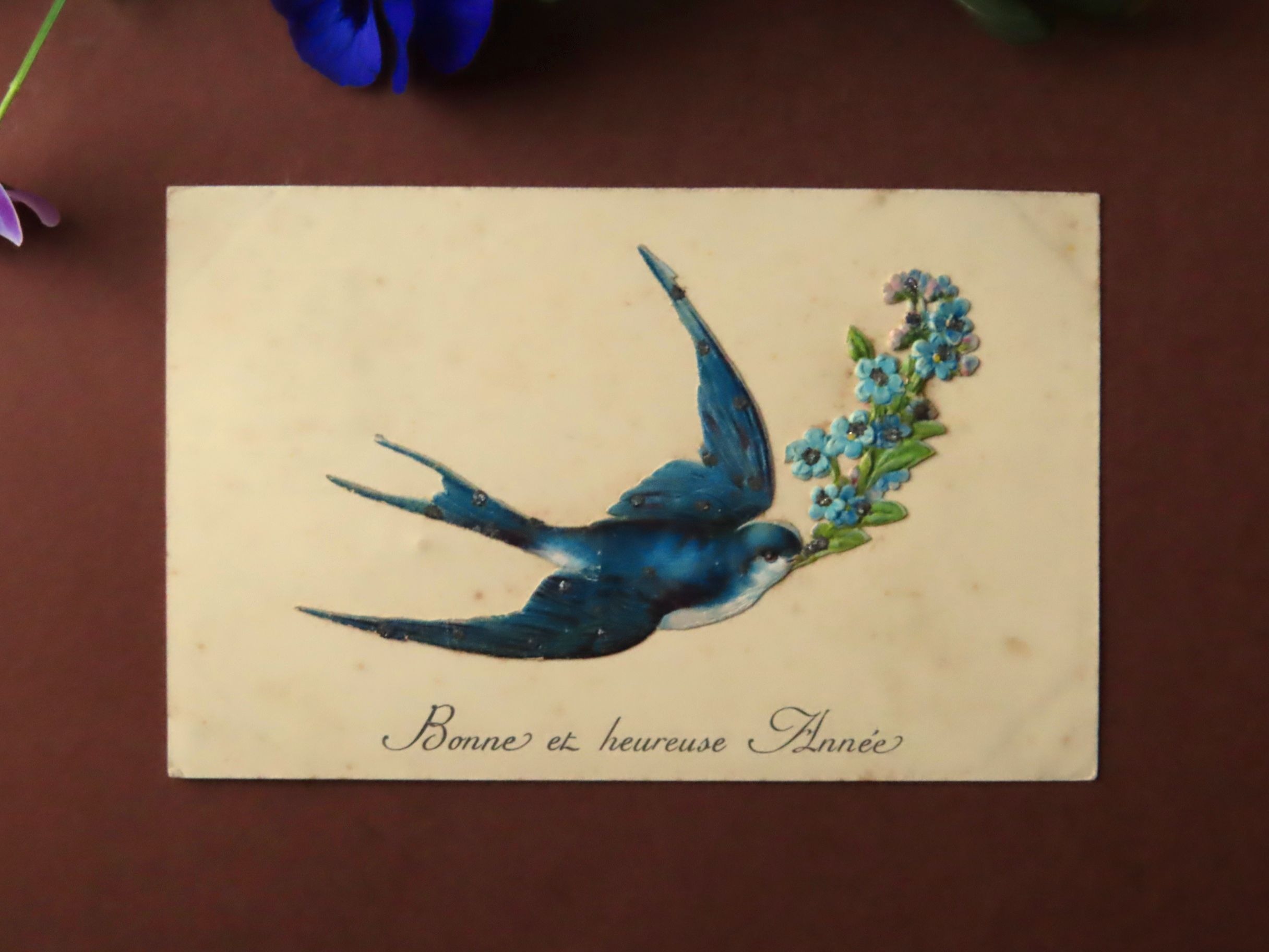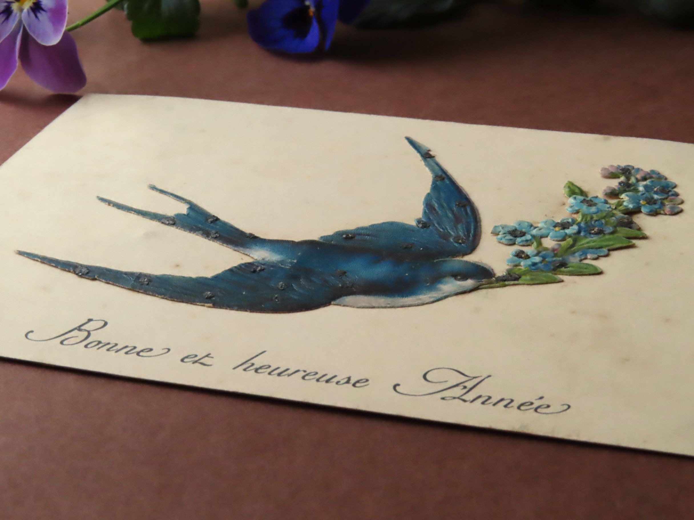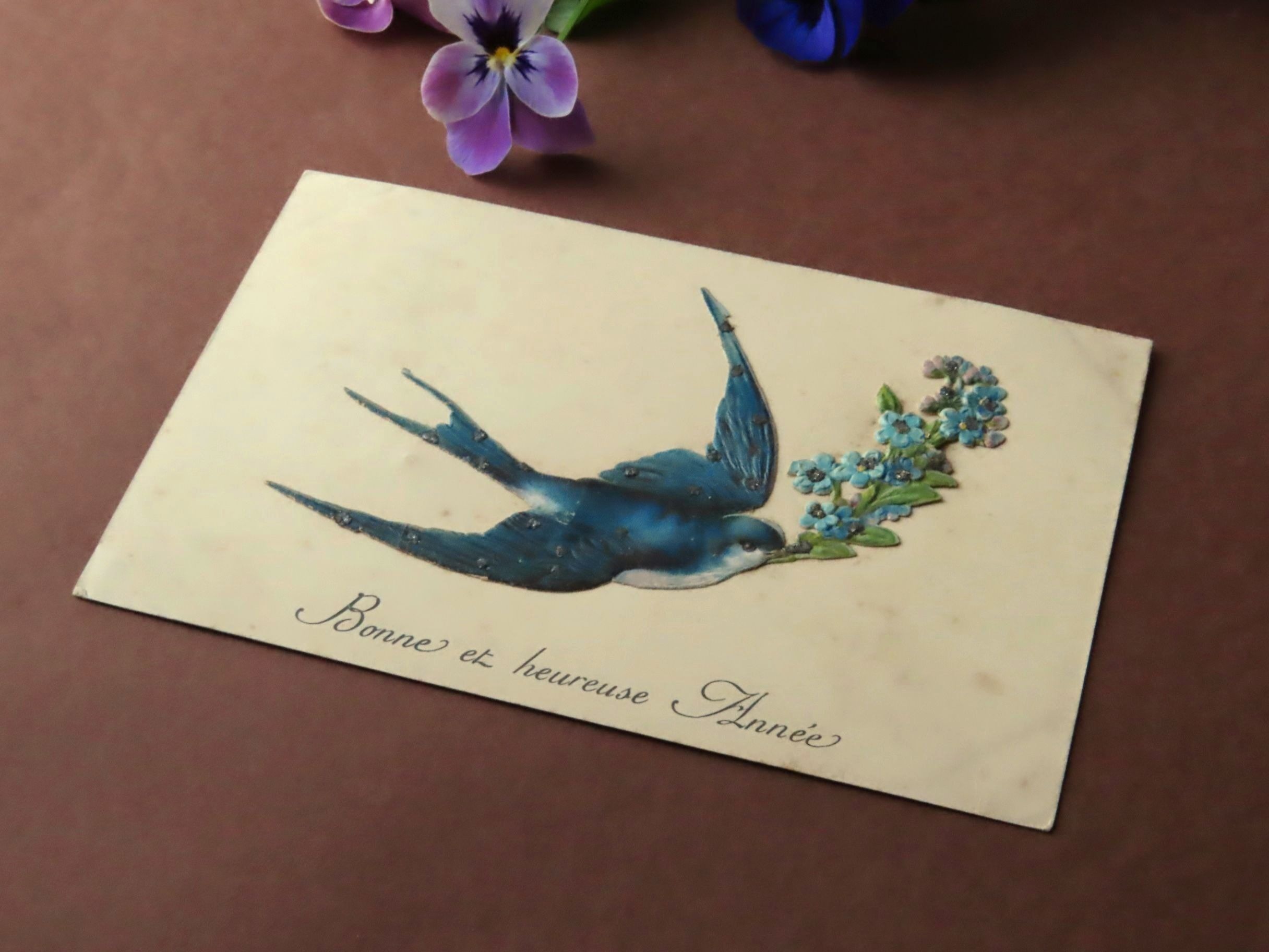 ツバメと勿忘草は、切り抜かれてカードに貼られています。