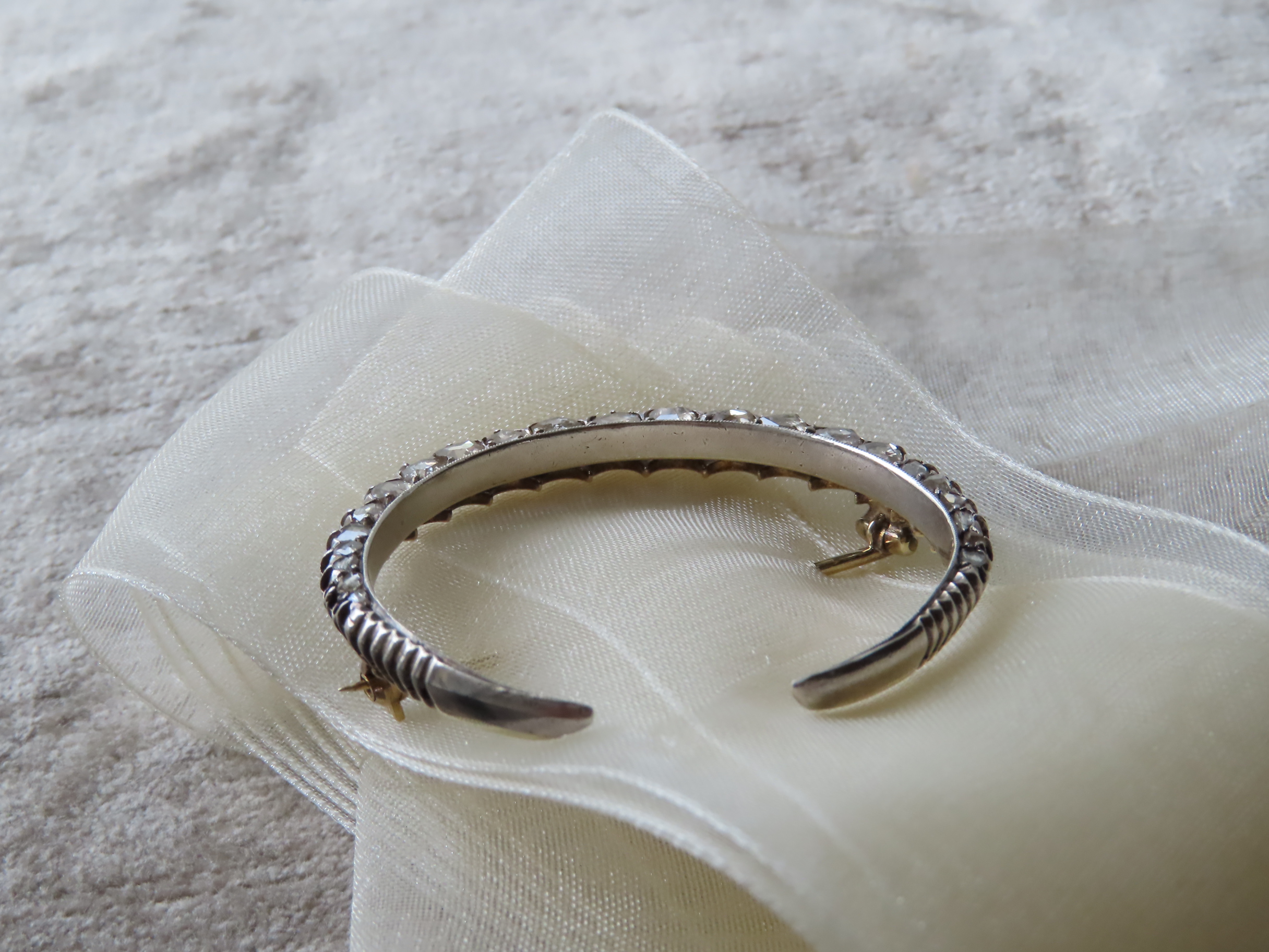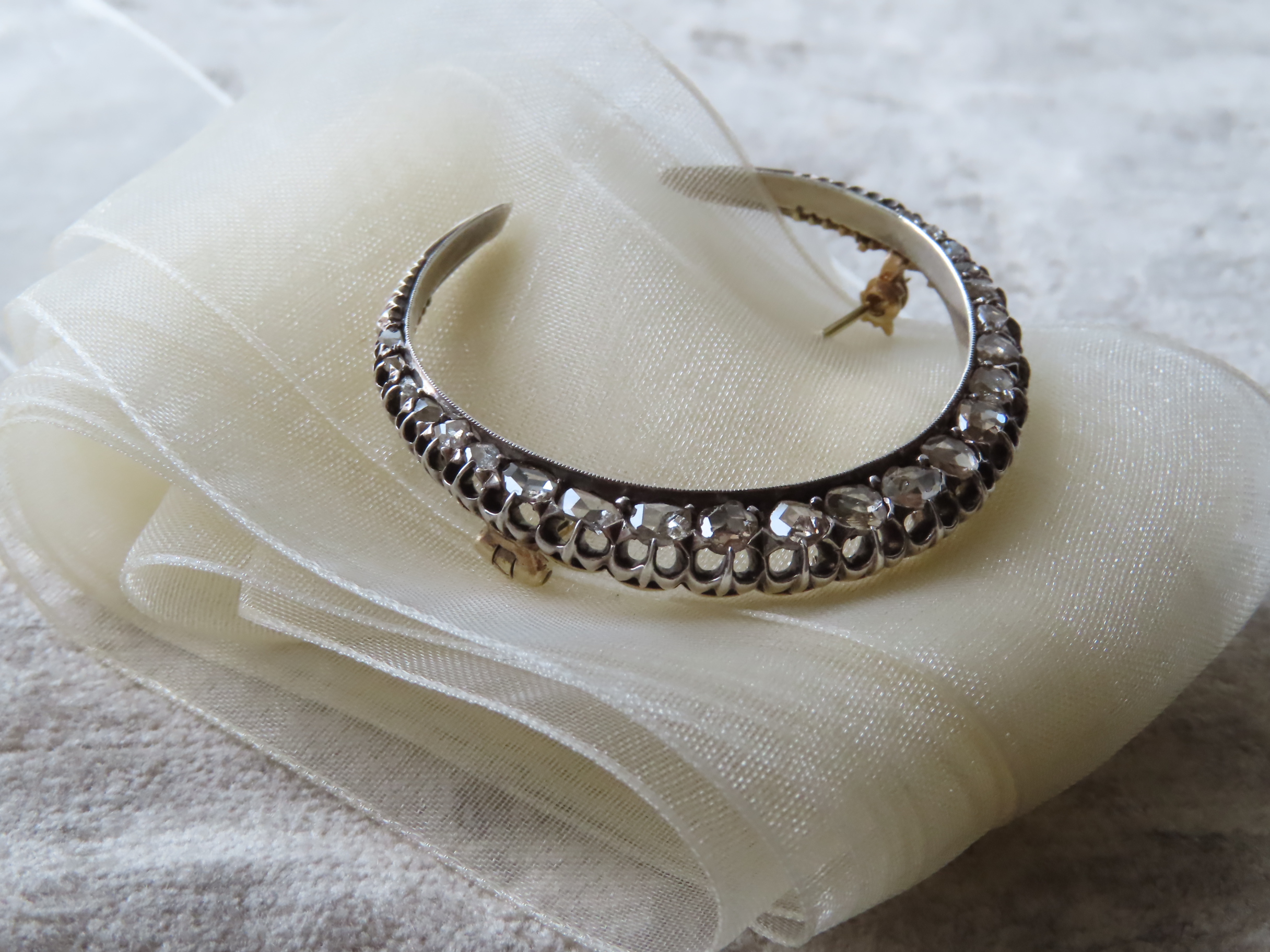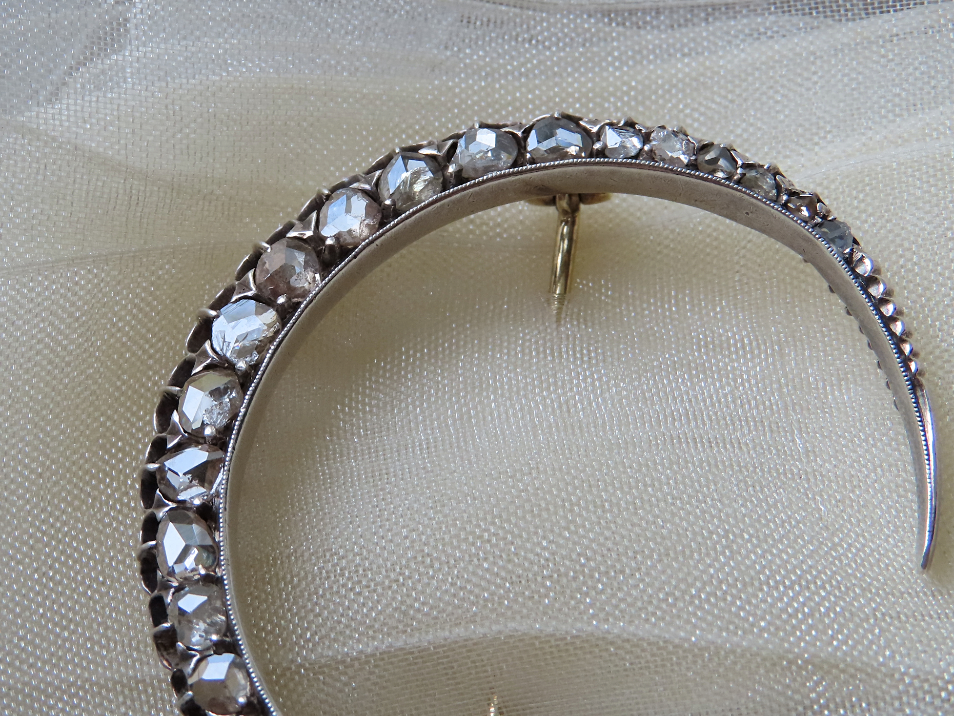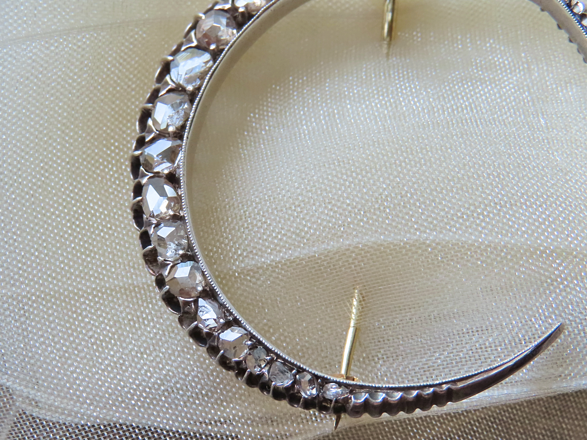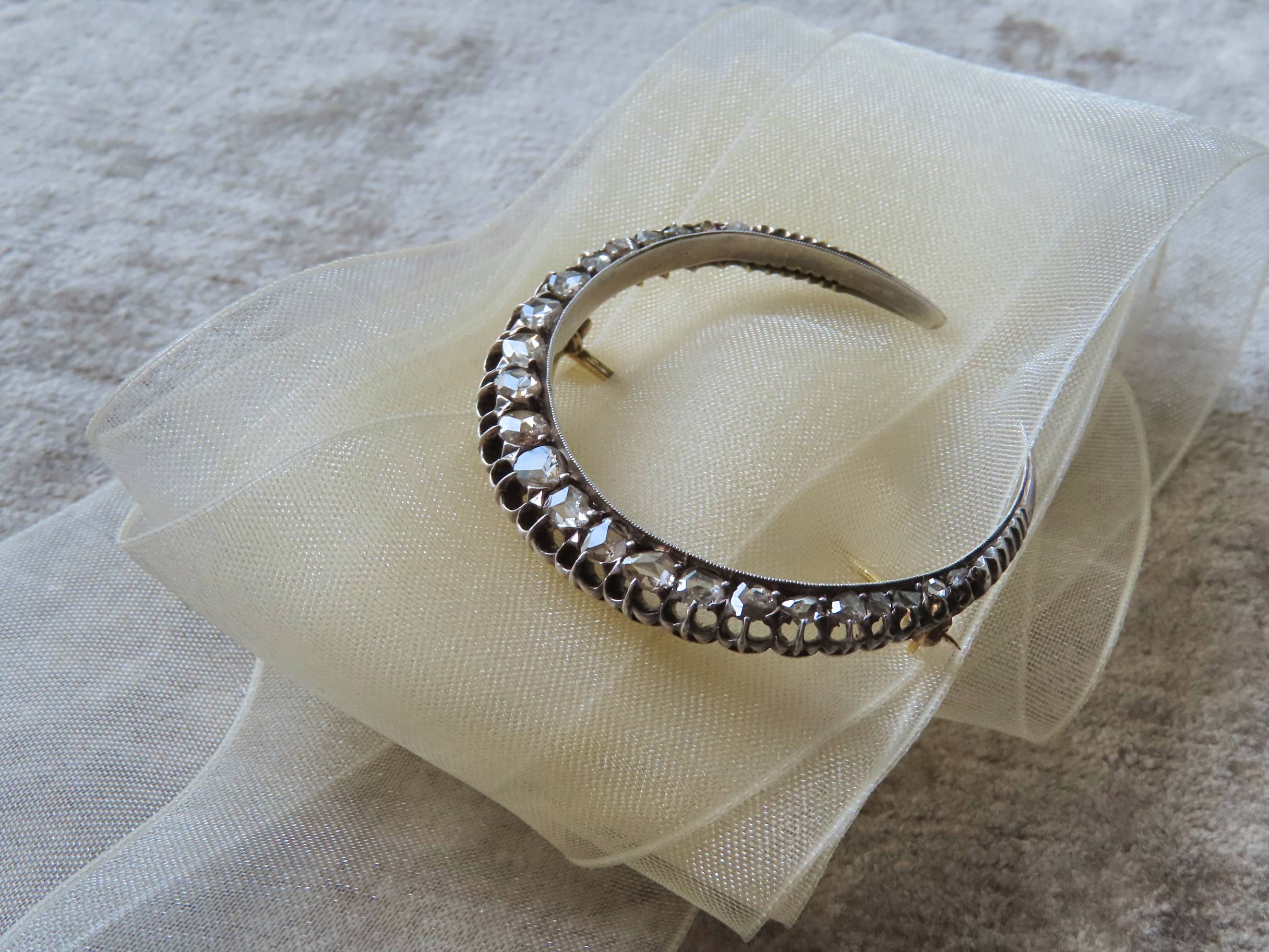 | 1900-10年の、ローズカットダイヤモンドの三日月ブローチです。 イタリア、もしくはフランスのもの。 先ず目を惹くのは、アンティークダイヤのごつごつと白く透明な力強い輝き。 その透明感が、冬の冷たい月のよう。 そして、ぐーっと円に近いフォルムと十分な大きさです。 |