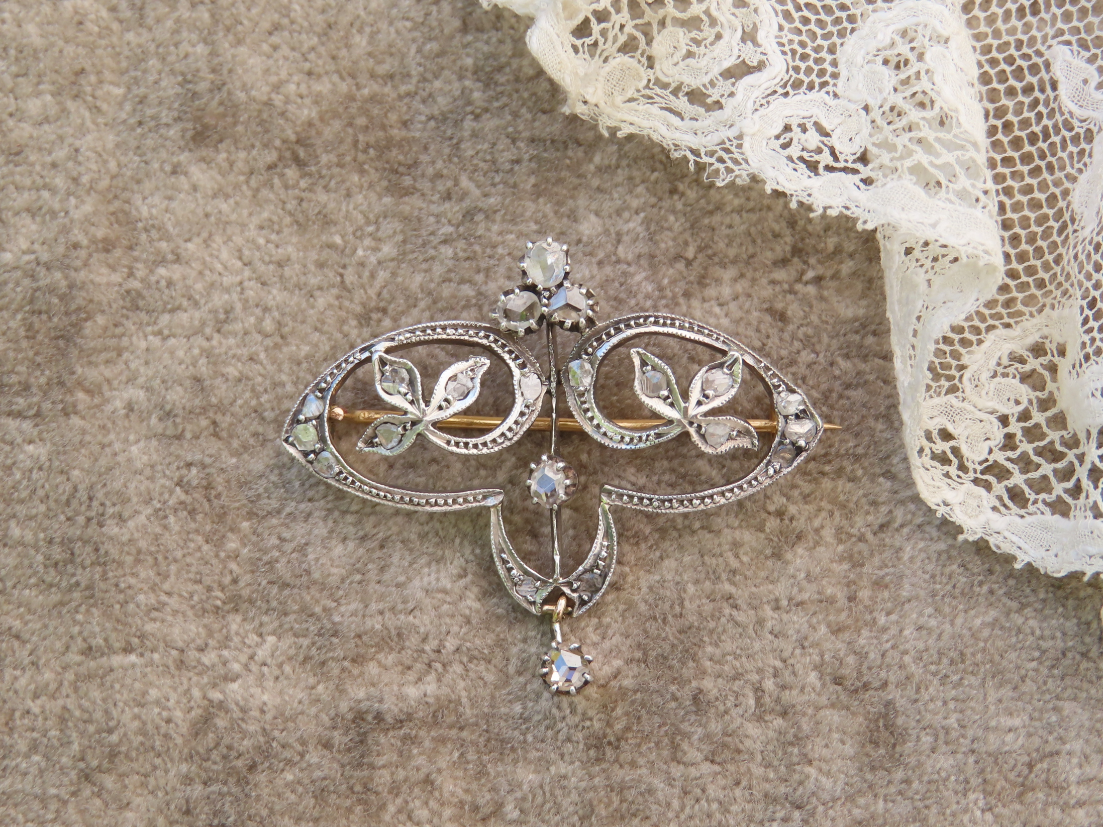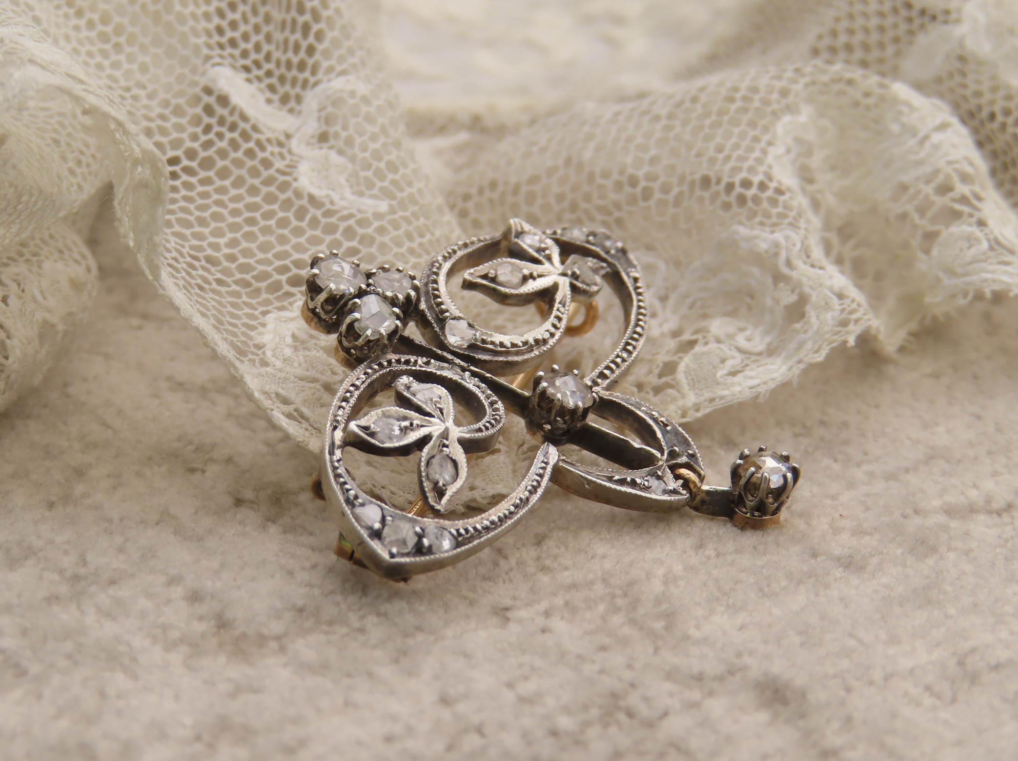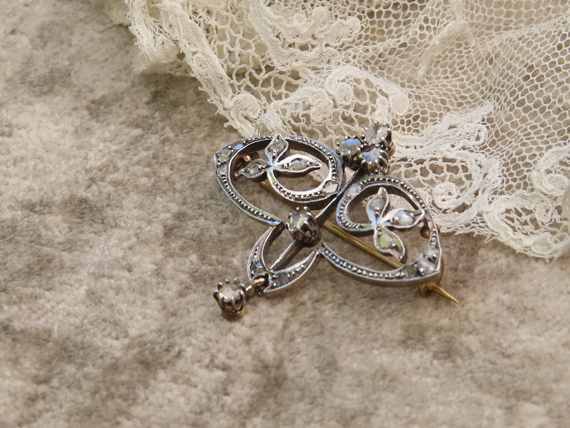 | 中央とその下のダイヤモンドは、ローズカットダイヤモンド。上のクローバー型はスリーファセット。周りはラフカット。 ダイヤの留めてある台は銀です。 ※向かって左側の3枚の葉の1個のダイヤにちいさなカケがありますが、全く目立たないと思います。 ※カーソルを画像に置くと、反対側からの写真がご覧になれます。 |