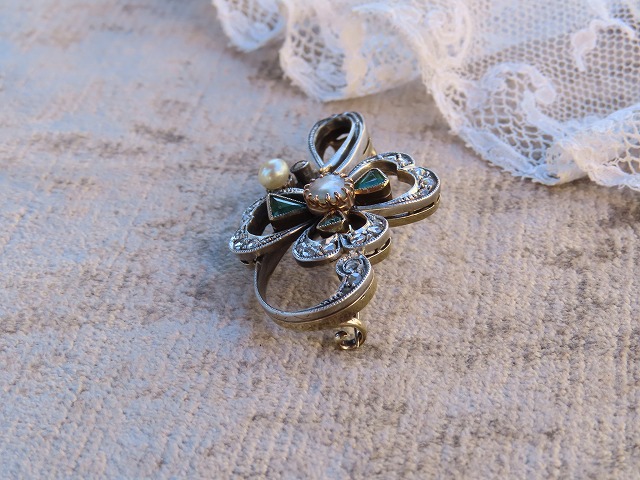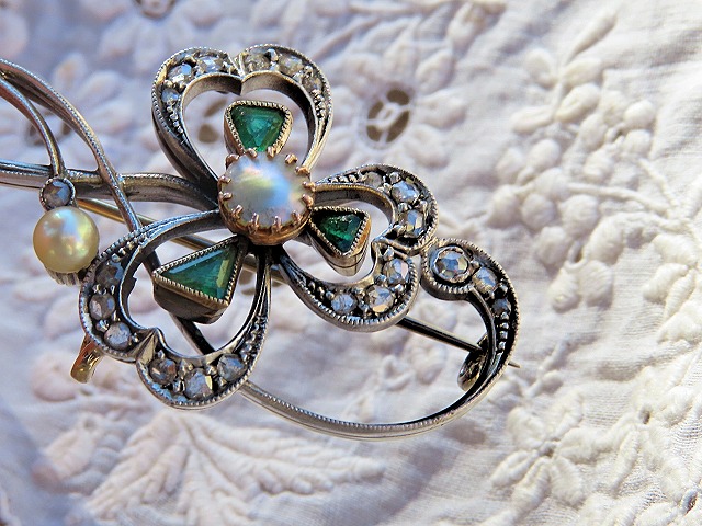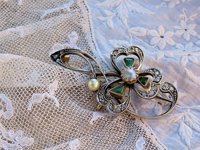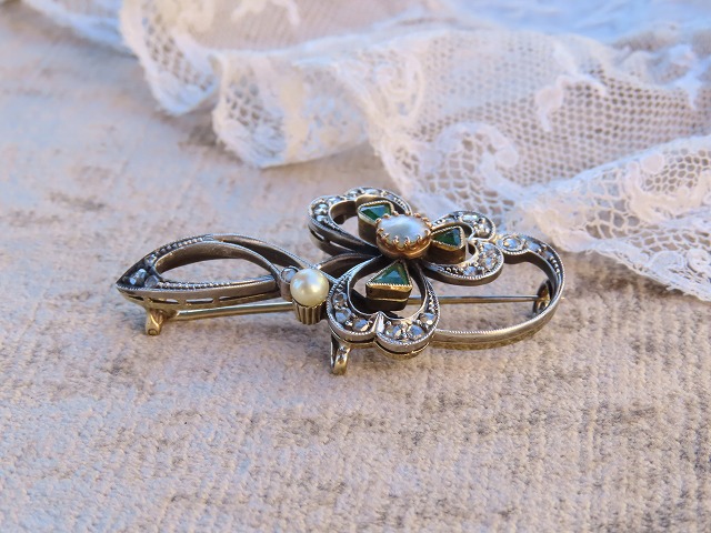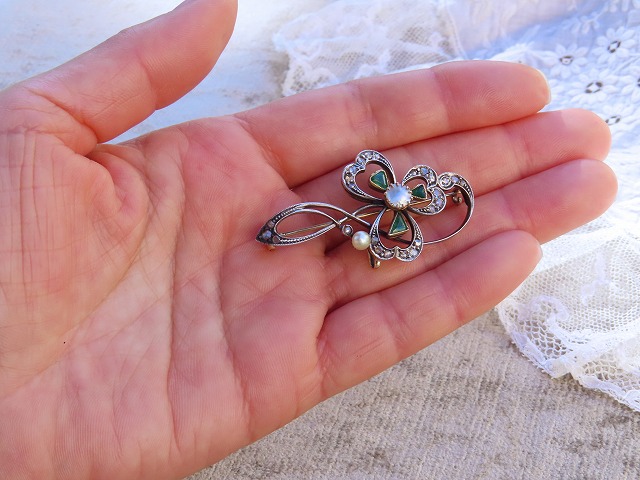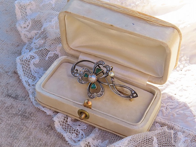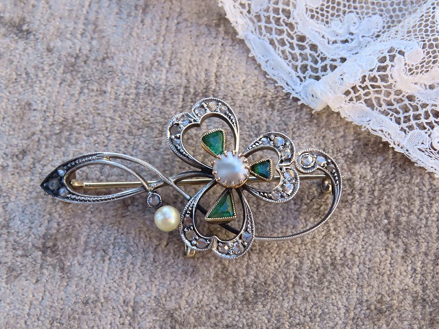 | 1910-20年頃の、エメラルドとダイヤモンドで出来たクローバーのブローチです。 アシンメトリーなデザインが、エドワーディアン(リバティスタイル)よりも自由な表現になってきています。 小さな天然真珠の粒が、柔らかい印象にしてくれています。*^^* |