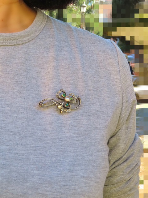 D-093 エメラルドのクローバーのブローチ &ダイヤ&天然真珠&真珠母貝 |