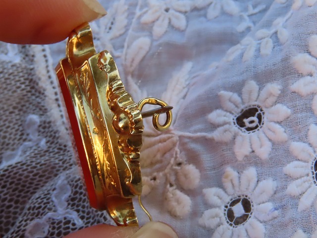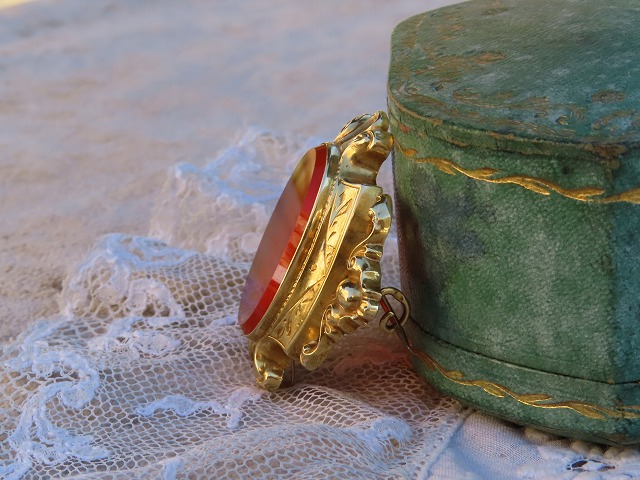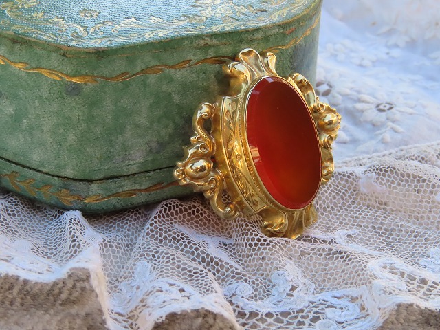 | 1870-80年頃の、フランス製の18Kとカーネリアンのブローチです。 美しい意匠の金の枠が印象的です。 本来はこのカーネリアンに、モノグラムなどが刻まれたものかもしれません。 |