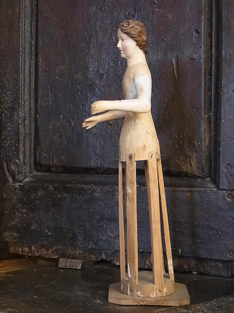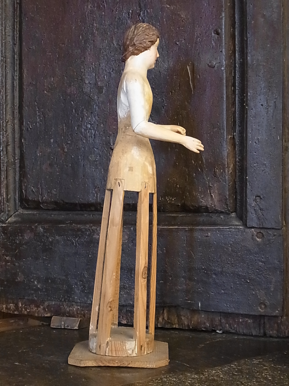 | 18世紀中期・イタリアの北部の港町・ジェノバ(Genova)の彫像。 当時は、絹のドレスを着せて、淑女のお部屋に飾られたもの。 オリジナルのペチコートのみ残っています。 付属しています。 両手には、お花を持っていました。 |