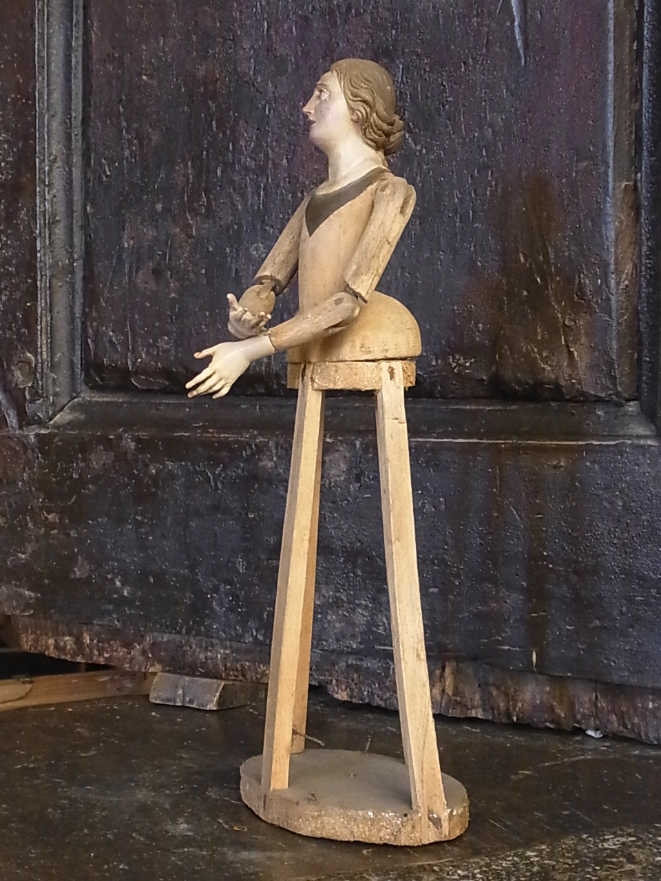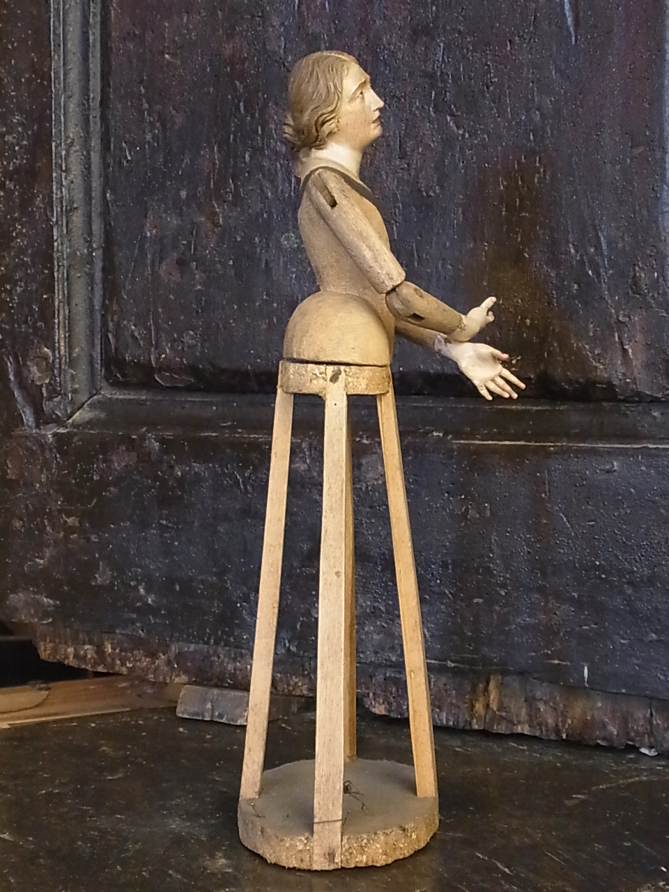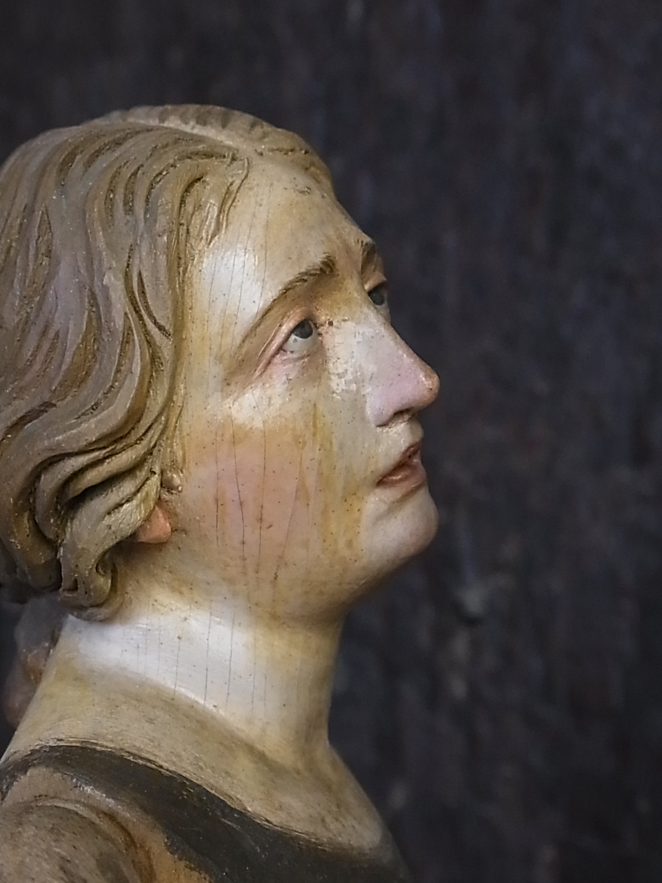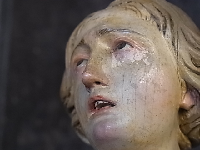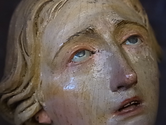 1730年頃に、イタリアのナポリで作られた彫像。 当時は、絹のドレスを着せて、淑女のお部屋に飾られたもの。 ドラマチックな表現は、ナポリの彫像の特徴。 誰を想って・・・ 嘆き悲しみ、天を仰ぐような、憂いのあるお顔。 ※カーソルを画像に置くと、拡大写真がご覧になれます。 |