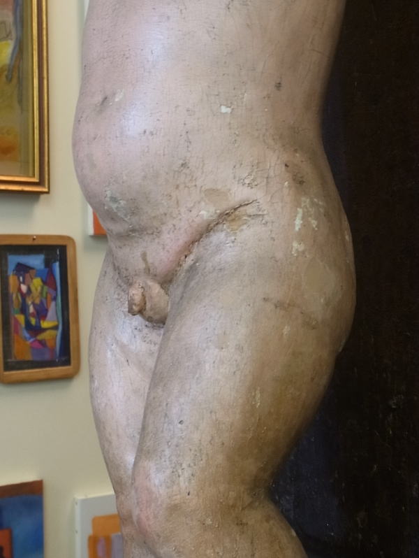| 台座の部分から彫像まで一体ですが、腕は失われています。 肩幅は、18cmです。 |