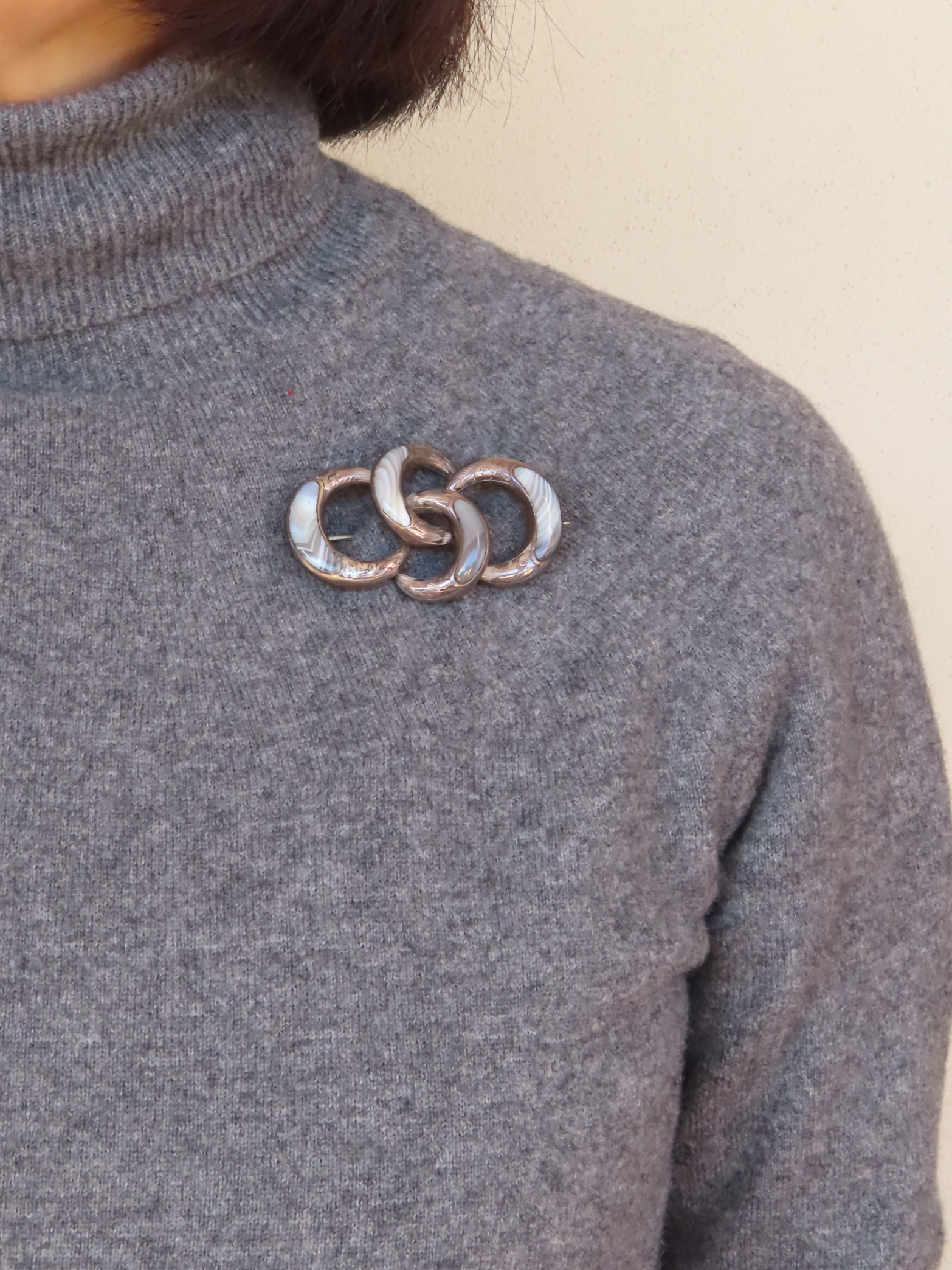 | かっこいいでしょう?*^^* 様々な色石ではなく、グレーの縞瑪瑙のみに銀という、モノトーンな世界が渋いです。 ピンもしっかりしているので、厚目のコートなどにもきちんと留まります。 ※カーソルを画像に置くと、違う角度からの写真がご覧になれます。 |