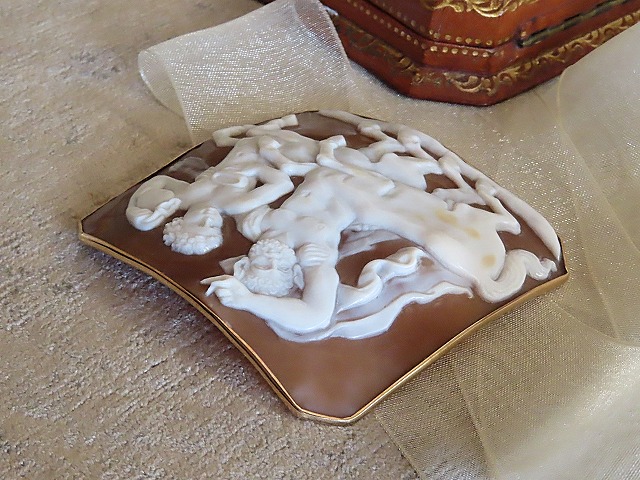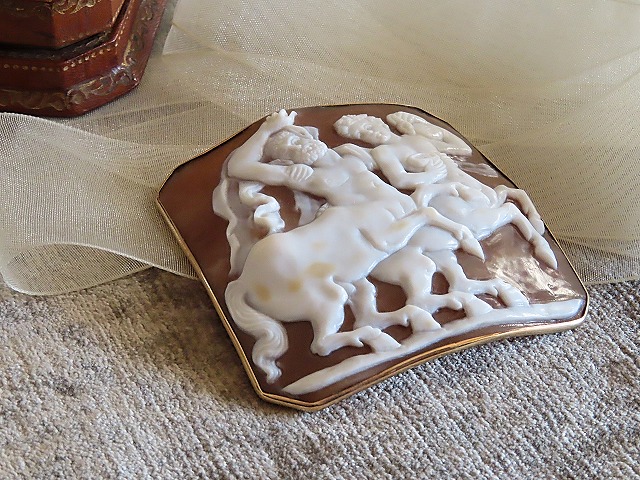 1850-60年頃の堂々とした、風格のあるカメオです。 二人のケンタウルス。ギリシャ神話の半人半獣です。 コルネリアンシェルという、キャラメル色と白色の層の貝のカメオ。 |