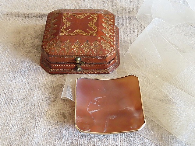 カメオのみの大きさは、6.5cm×6.5cmで、周りにはハイキャラットゴールドの枠が付いています。 ブローチなどの金具は付いていませんが、、このカメオの為に制作された、アンティークの特注金押し皮革箱付きです。 こんな箱も、金箔押しの職人さんがいなくなって、アンティークのみのお品物になりました。 ※カーソルを置くと、箱の裏側の写真がご覧になれます。 ローマの専門店の刻印があります。 |