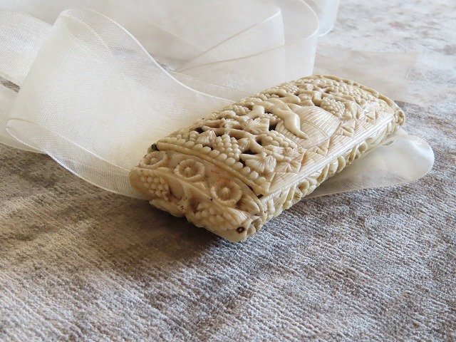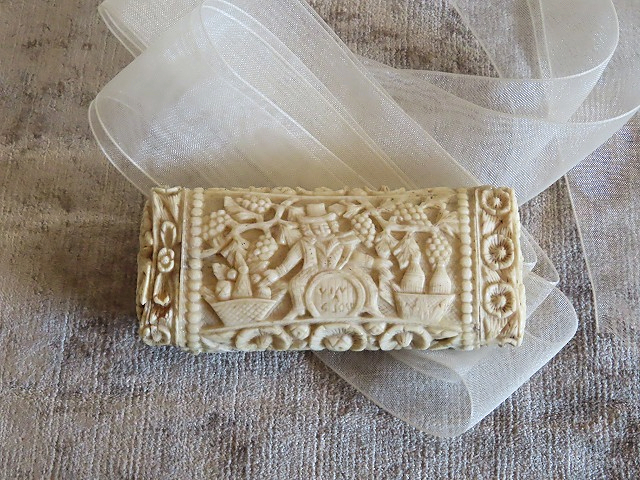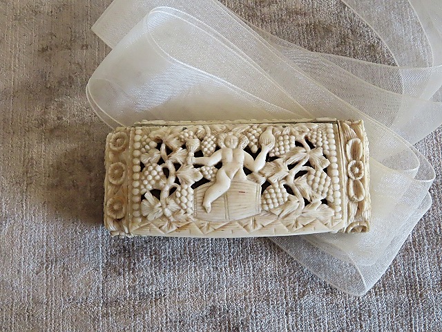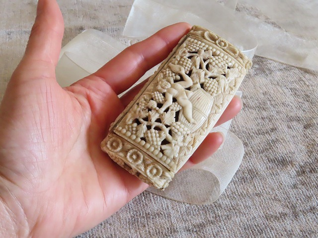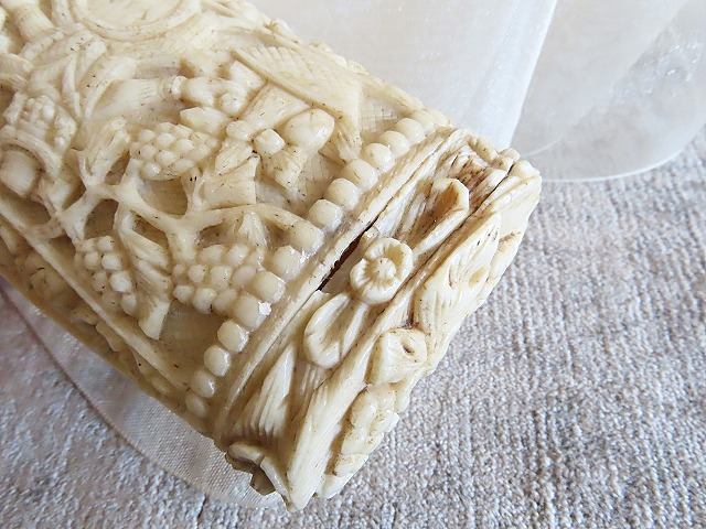 | 18世紀末期(1780-1800年頃)のフランスのスナッフボックスです。 骨素材に、素朴な浮彫り。 これはお酒の神様、バッカスのお祭を描いたもの。 葡萄に囲まれ、葡萄樽にまたがってワインを飲んでます。(笑) ※カーソルを画像に置きますと、違う角度の写真がご覧になれます。 |