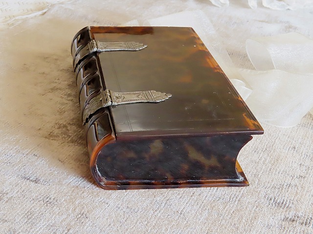 | 英国・18世紀(1700年代)の、鼈甲の祈祷書入れです。 革張りの重厚な書籍を模しています。 英国らしい、カチッと厳格な印象。 ※カーソルを画像に置くと、反対側の写真がご覧になれます。 |