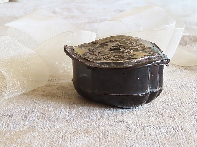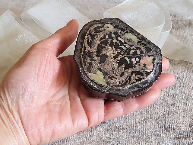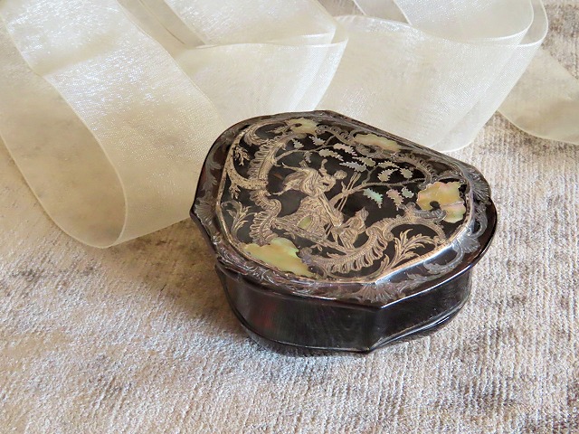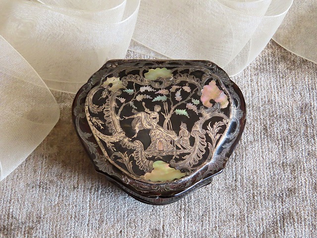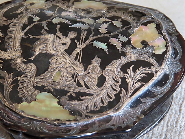 | 象眼には、真珠母貝と銀とが使われています。 真珠母貝の虹色の輝きが、ロココらしいフォルムで嵌め込まれ・・・ ※カーソルを画像に置くと、底面の写真がご覧になれます。 |