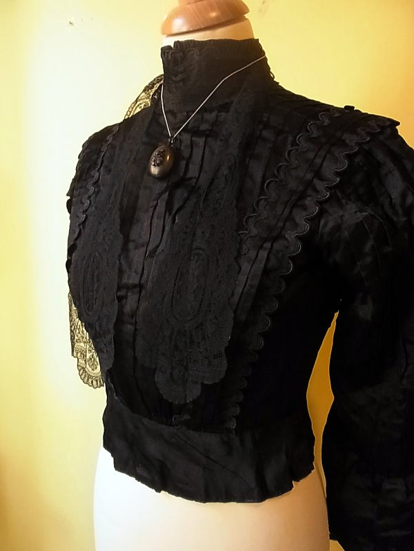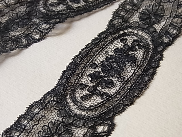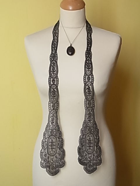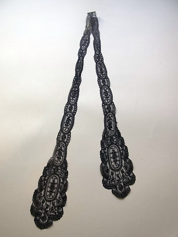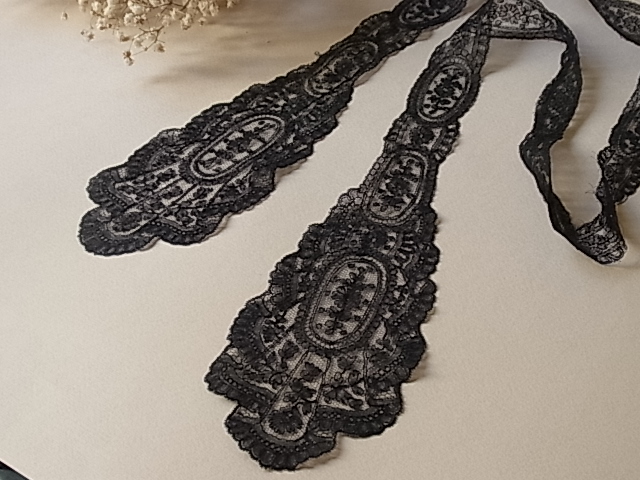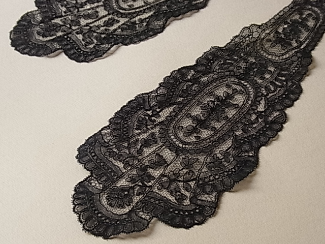 | 黒絹のシャンティーレース、19世紀中-後期のラペットです ひらめくレースのドレープを表現した、気品溢れる美しい意匠。 ※カーソルを画像に置きますと、拡大写真がご覧になれます。 |