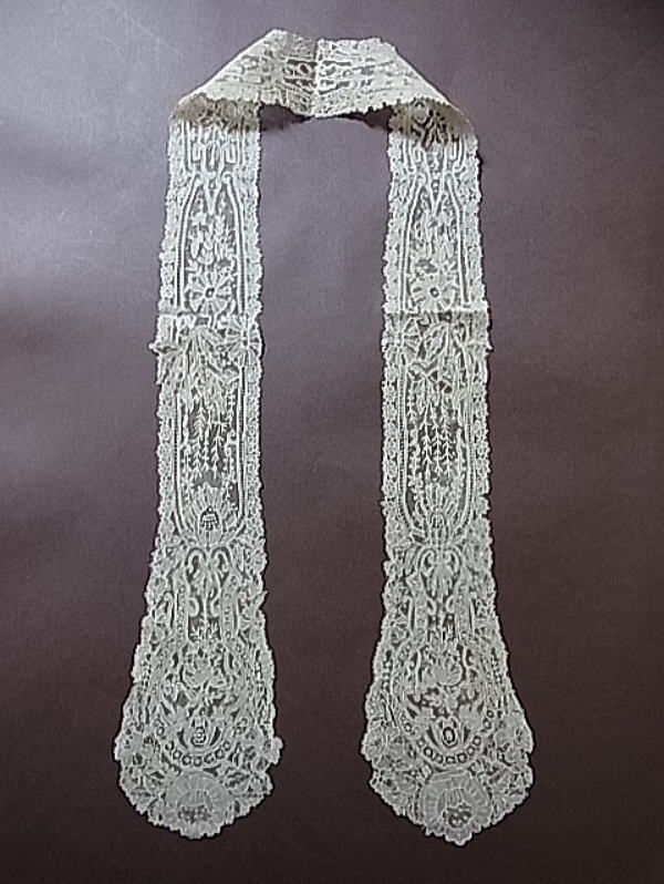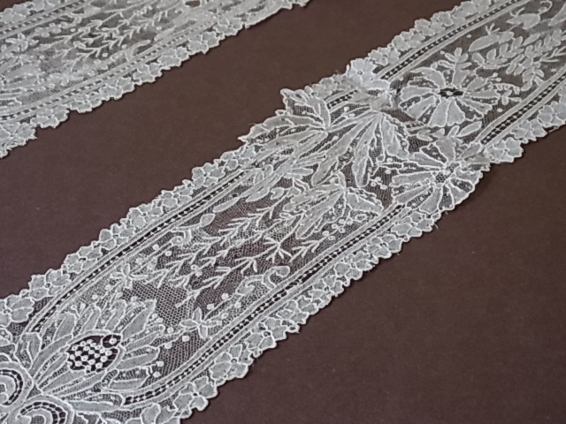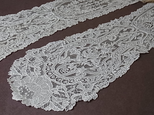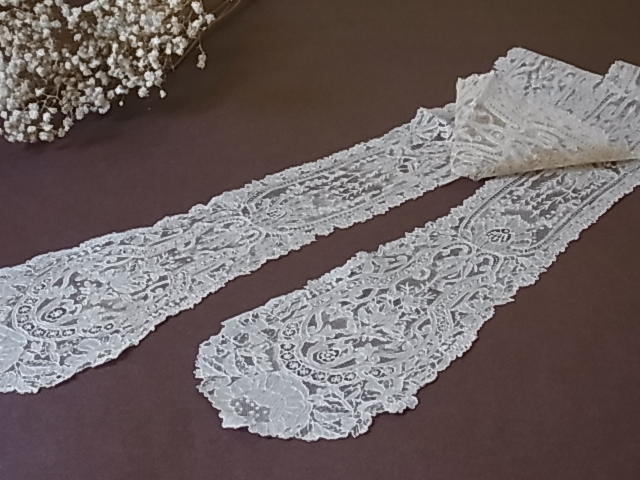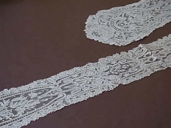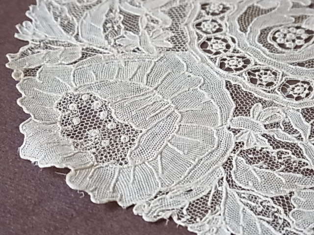| 麻糸のポワントガーズレース、 19世紀後期のラペットです。 百花繚乱と幾何学が調和した、気品溢れる美しい意匠。 |