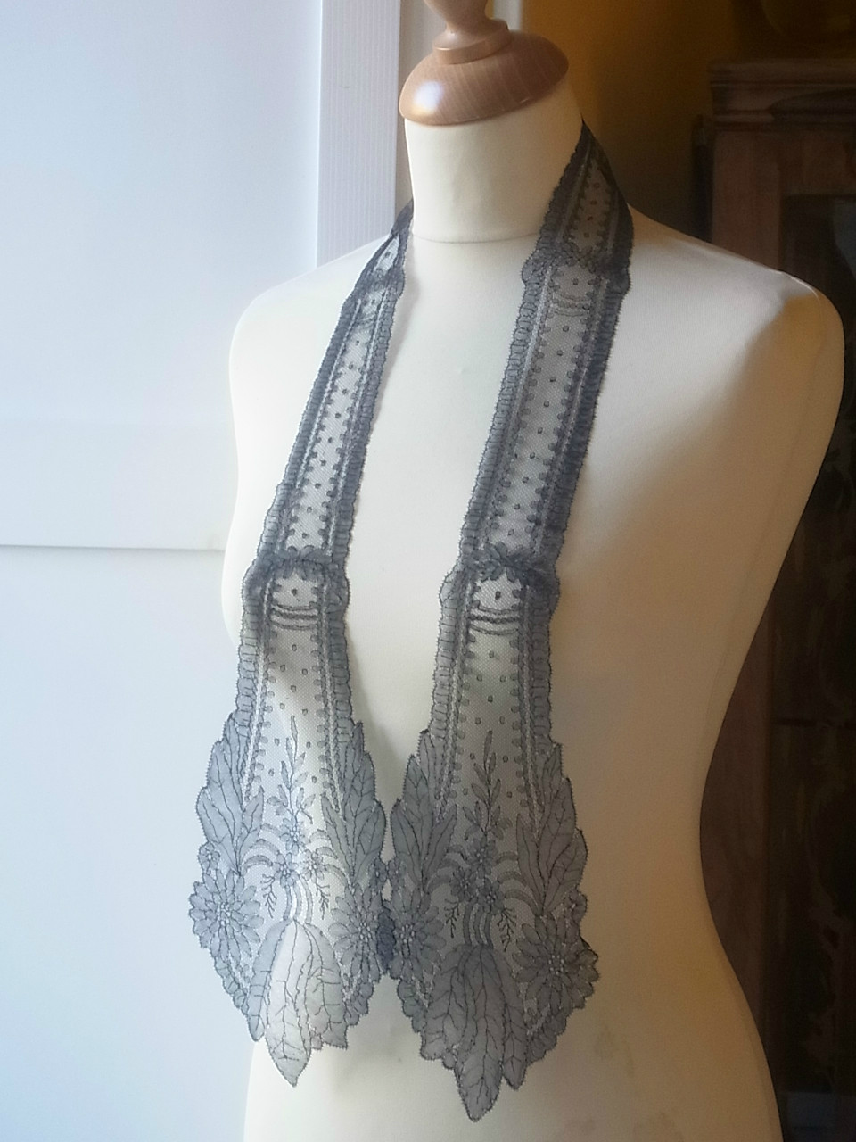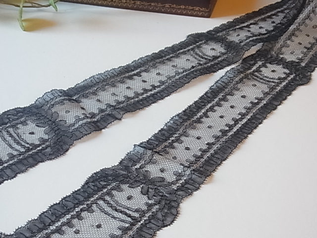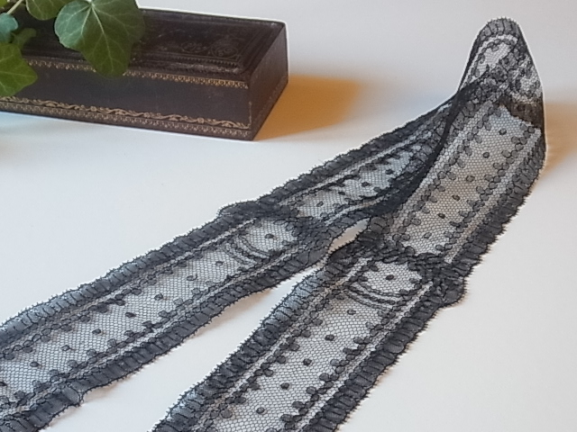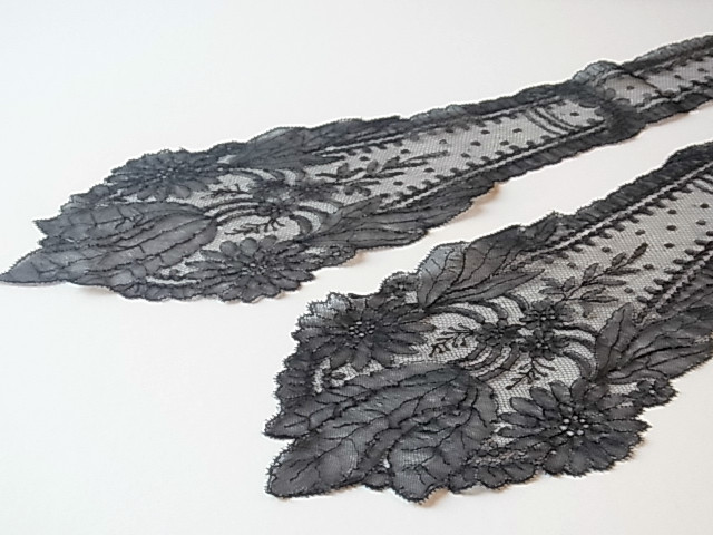 | 黒のシャンテリーレース、 1850-70年頃のラペットです。 フィレンツェのお屋敷からのもので、ご先祖がフランスからお嫁入りの際に持参したコレード(嫁入り用具)で、長らく収納箱の中に眠っていました。 おそらく未使用品。 ※カーソルを画像に置きますと、拡大写真がご覧になれます。 |