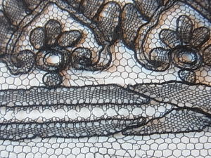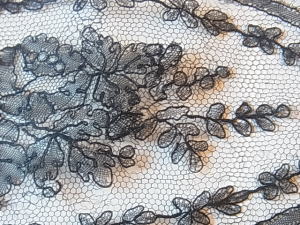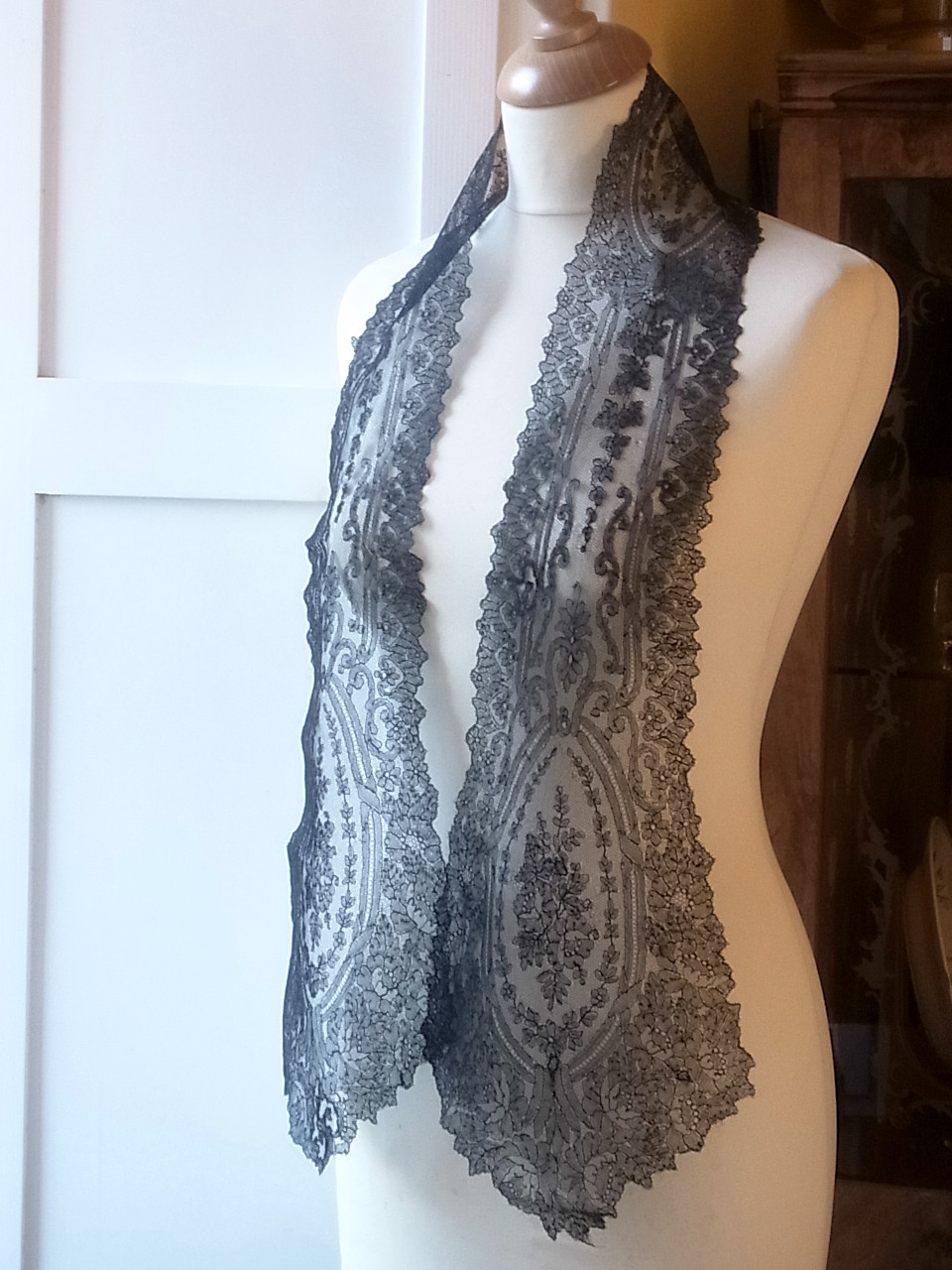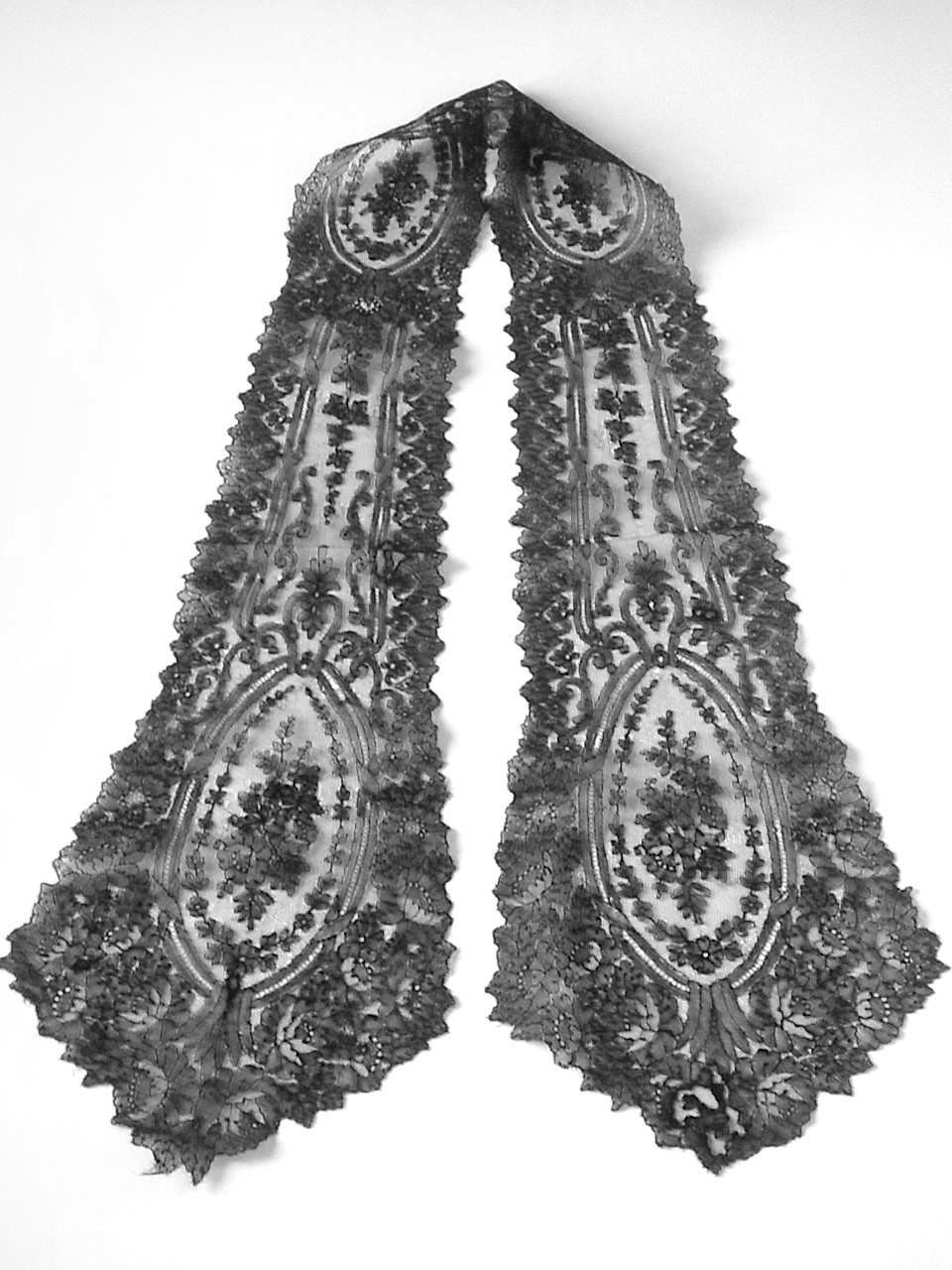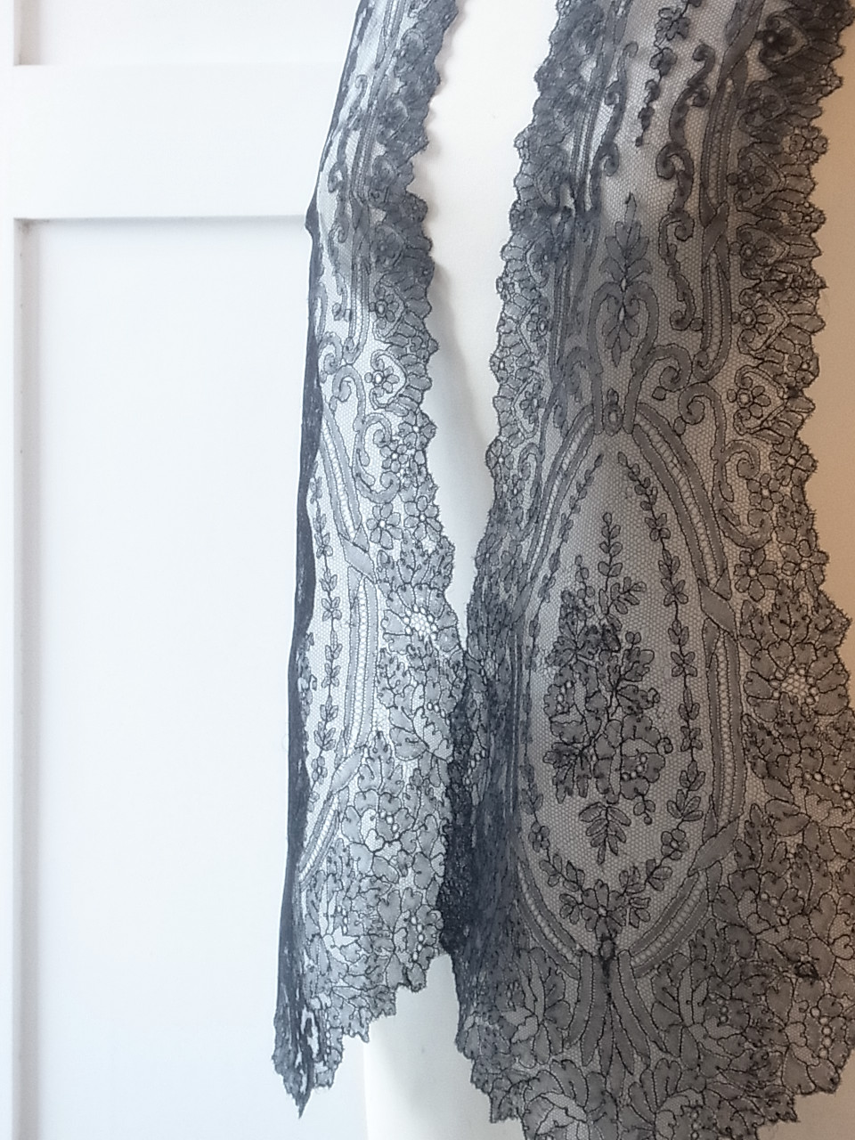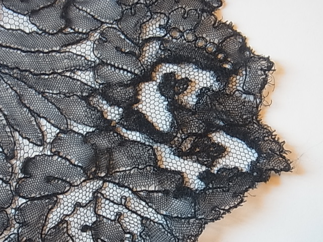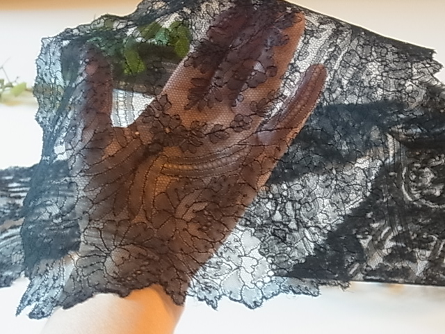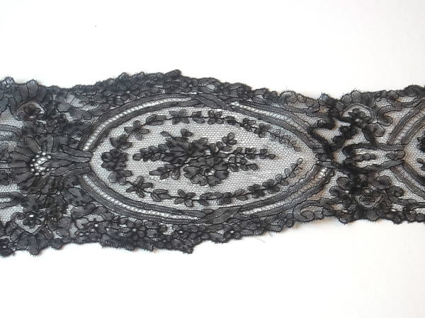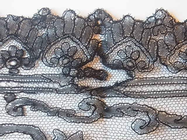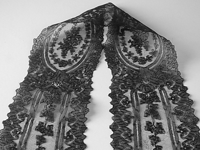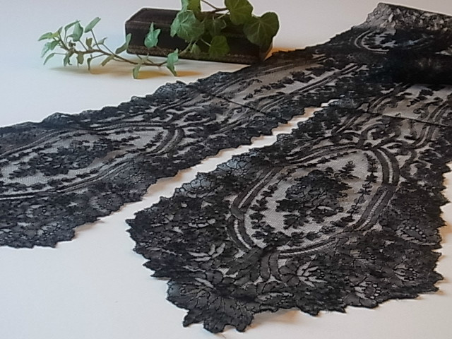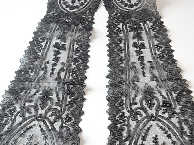 | 黒のシャンテリーレース、 1850-70年頃のラペットです。 豪奢な大判のメダリオン、気品溢れる美しい意匠。 ※写真に撮ると、部分的にモアレ状に写ってしまいますが、ここにダメージがある訳ではないです。 |