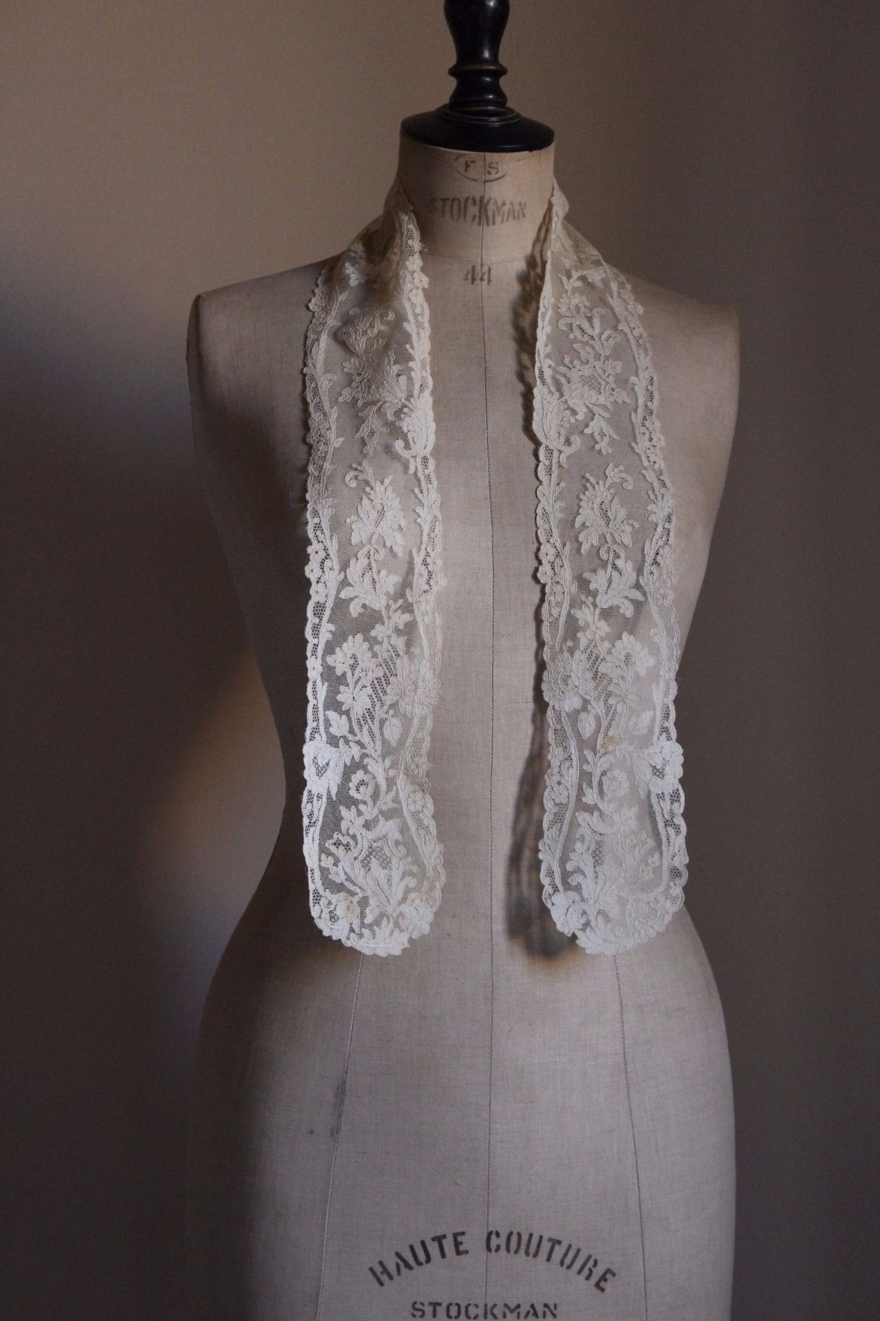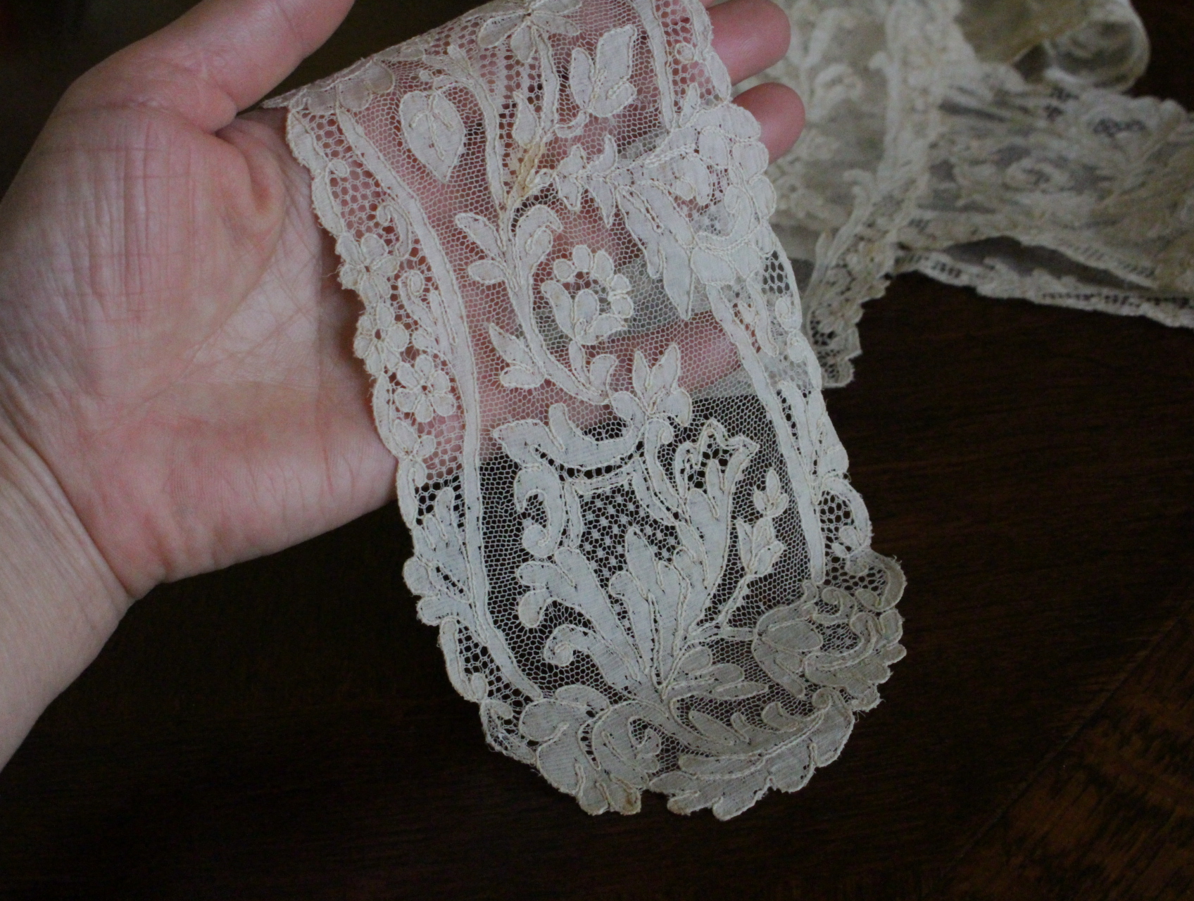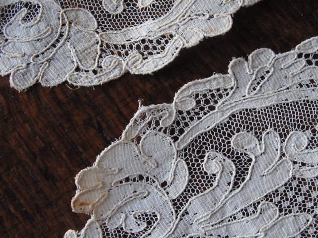 ボビンレースの技法で作られたメッシュ(編み目)の上から、ニードルワークで輪郭が縁取りがされています。