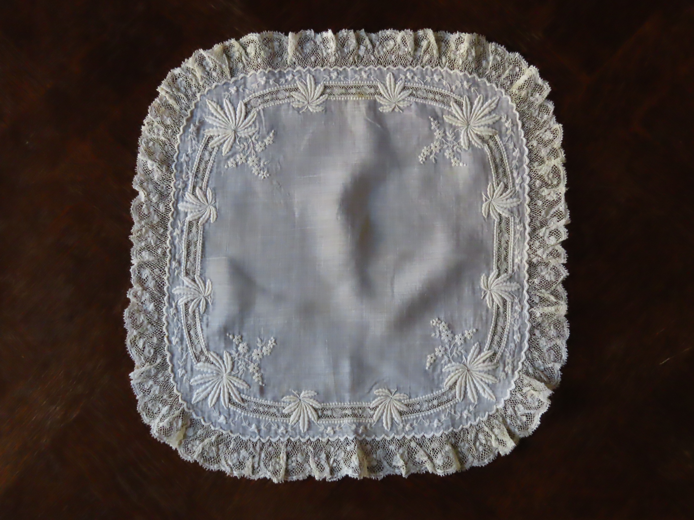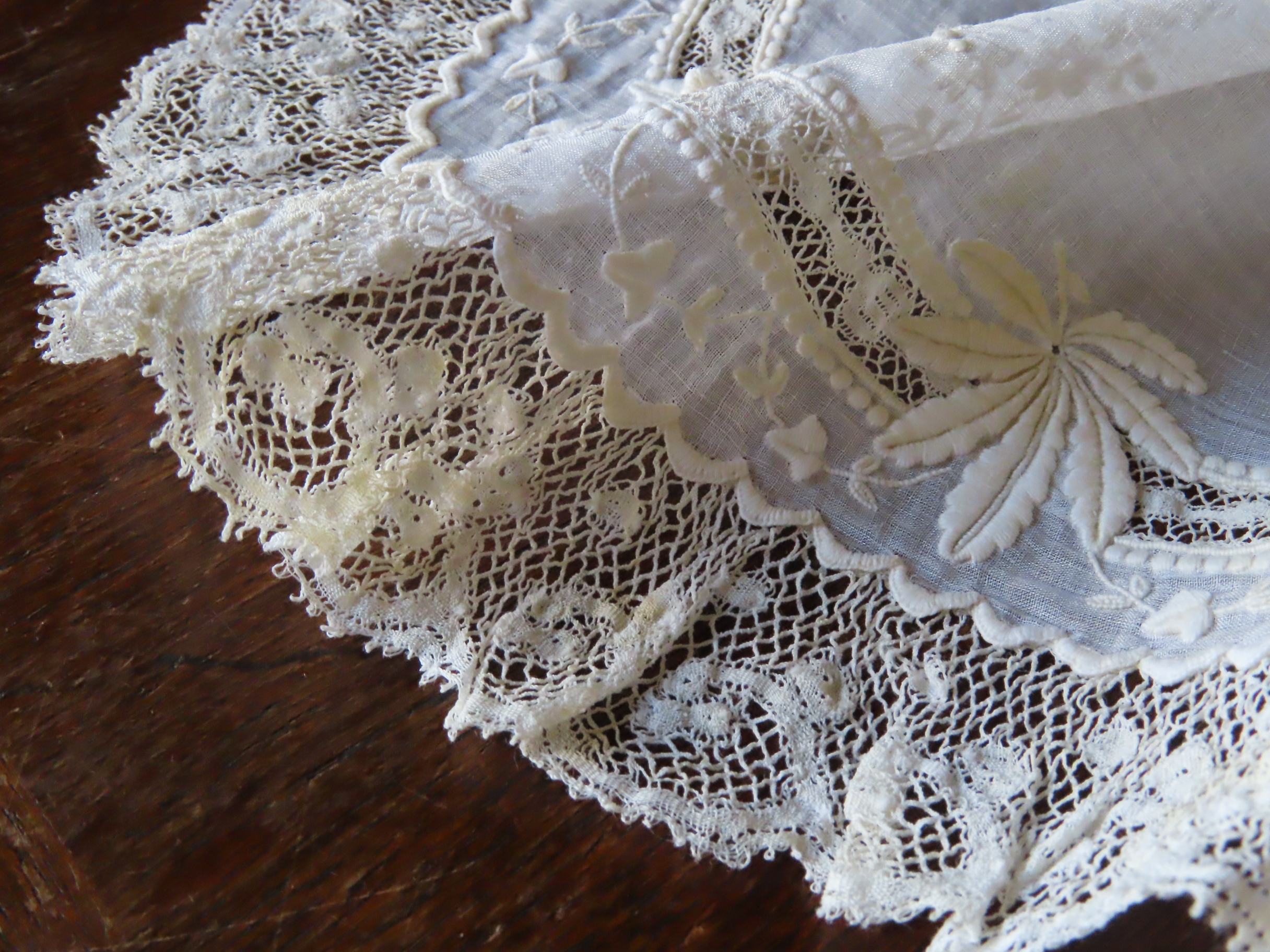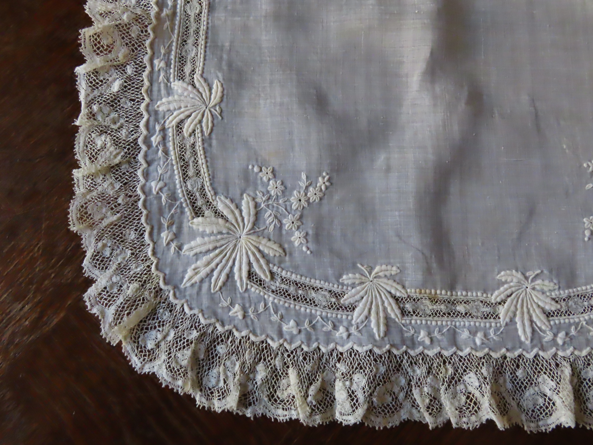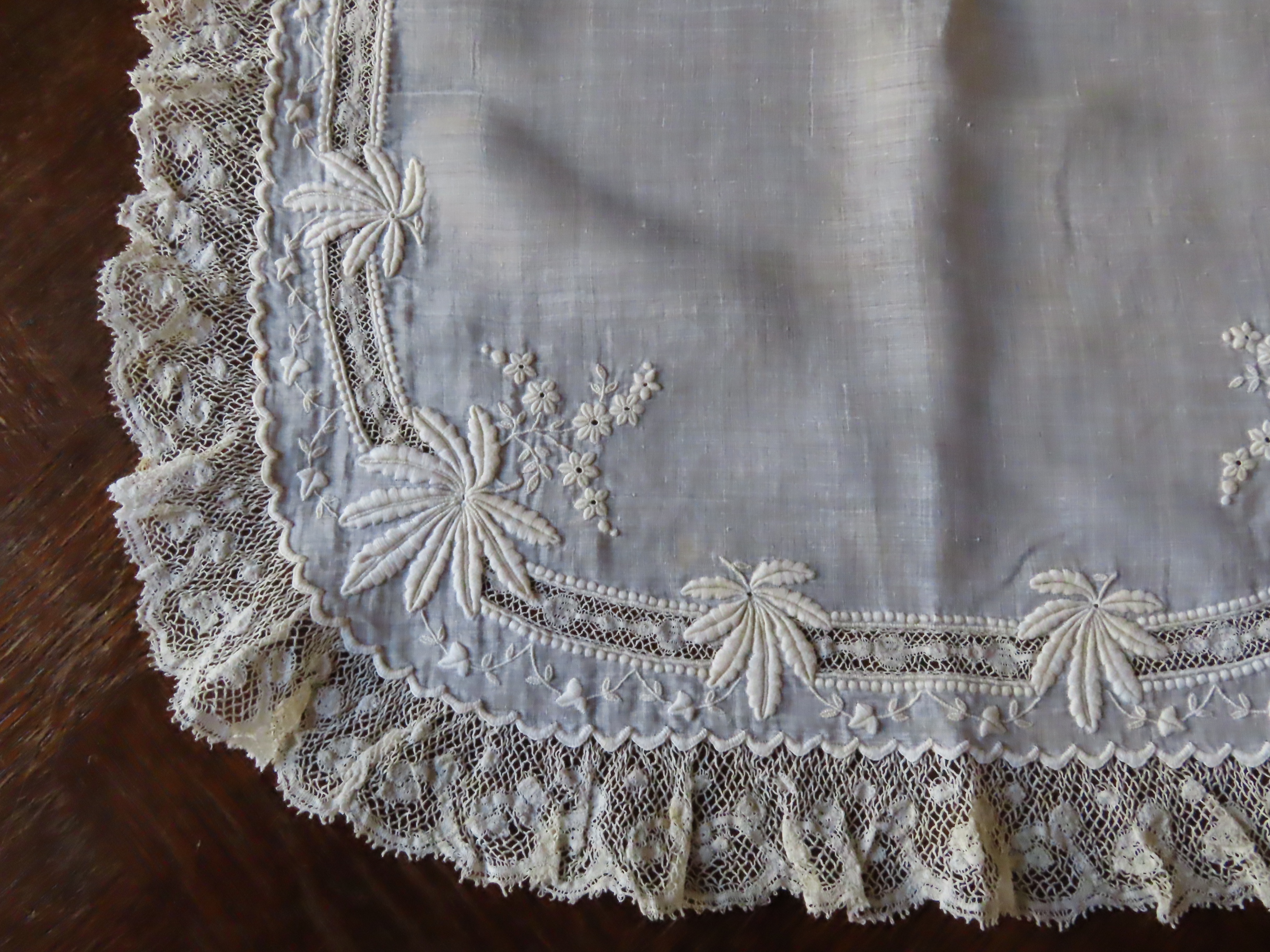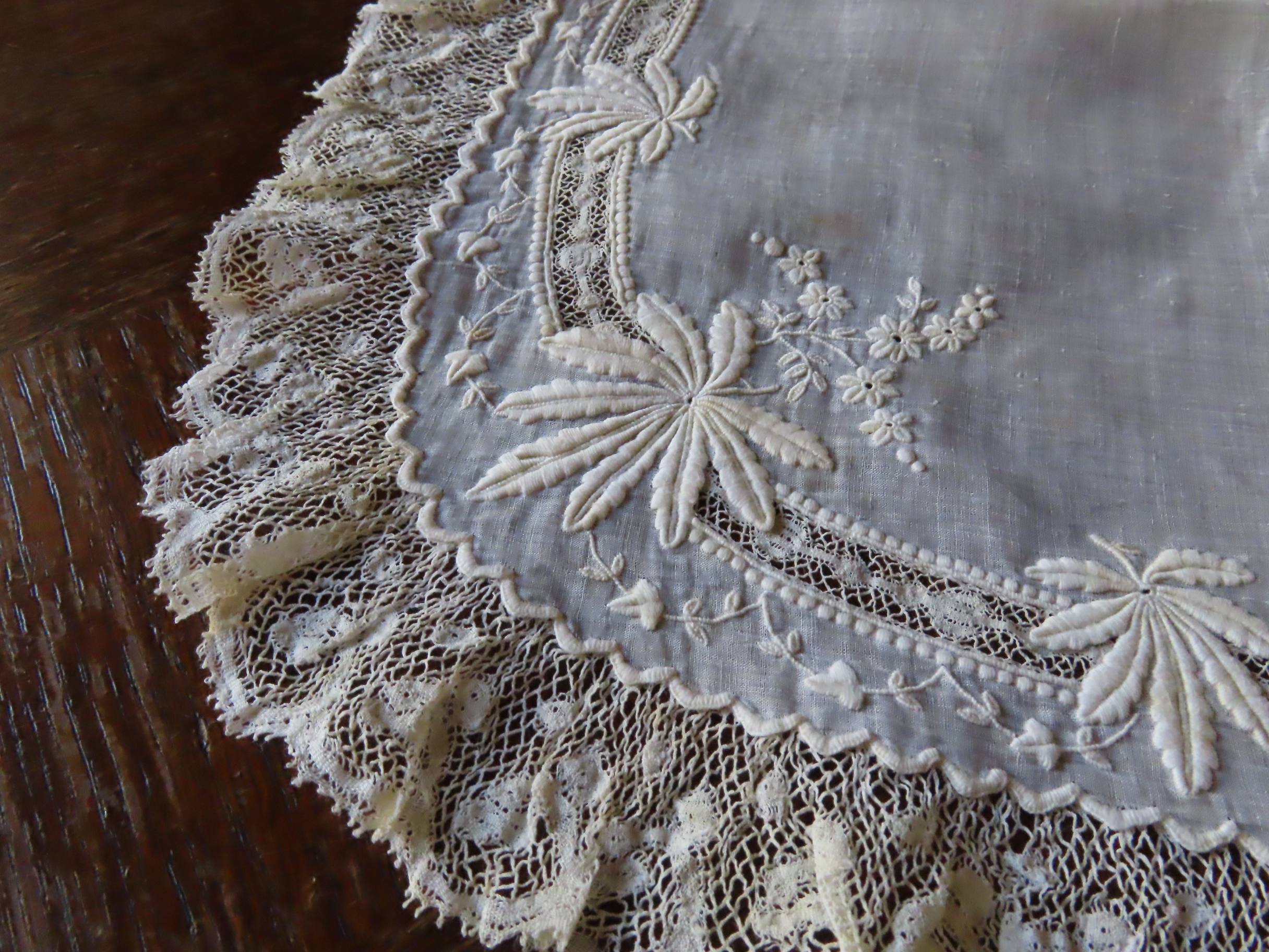 19世紀後期の、極薄いモスリンリネン地に白刺繍とヴァランシェレースのハンカチです。