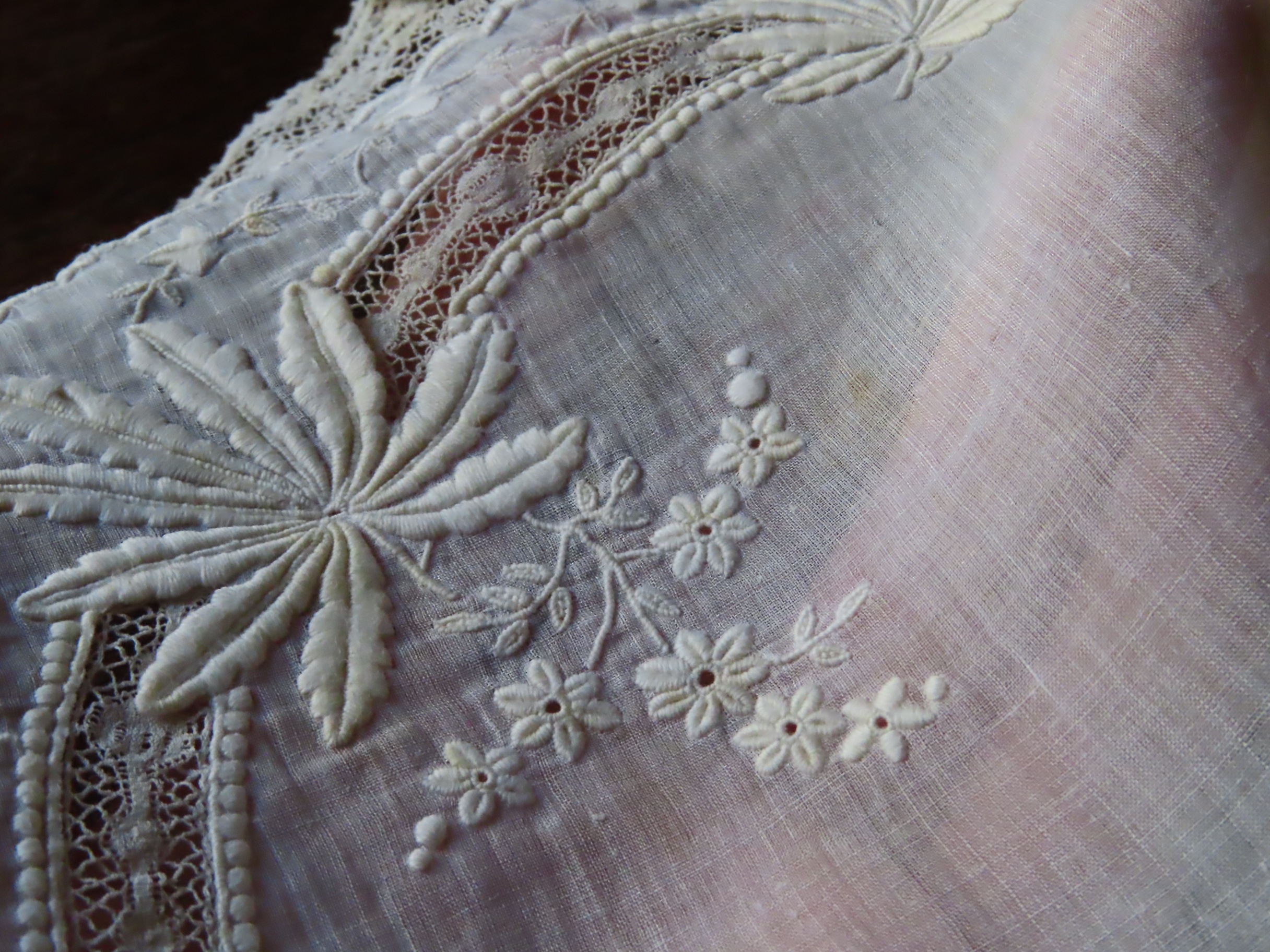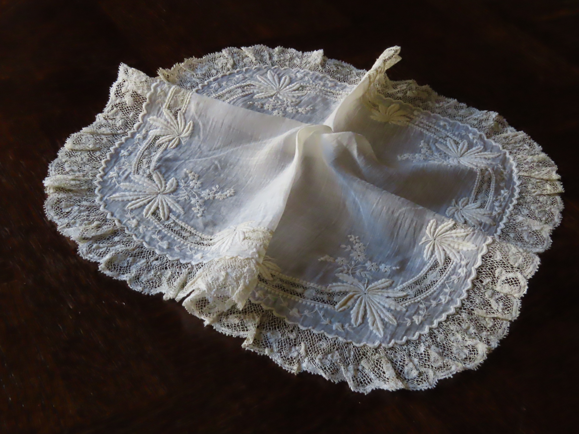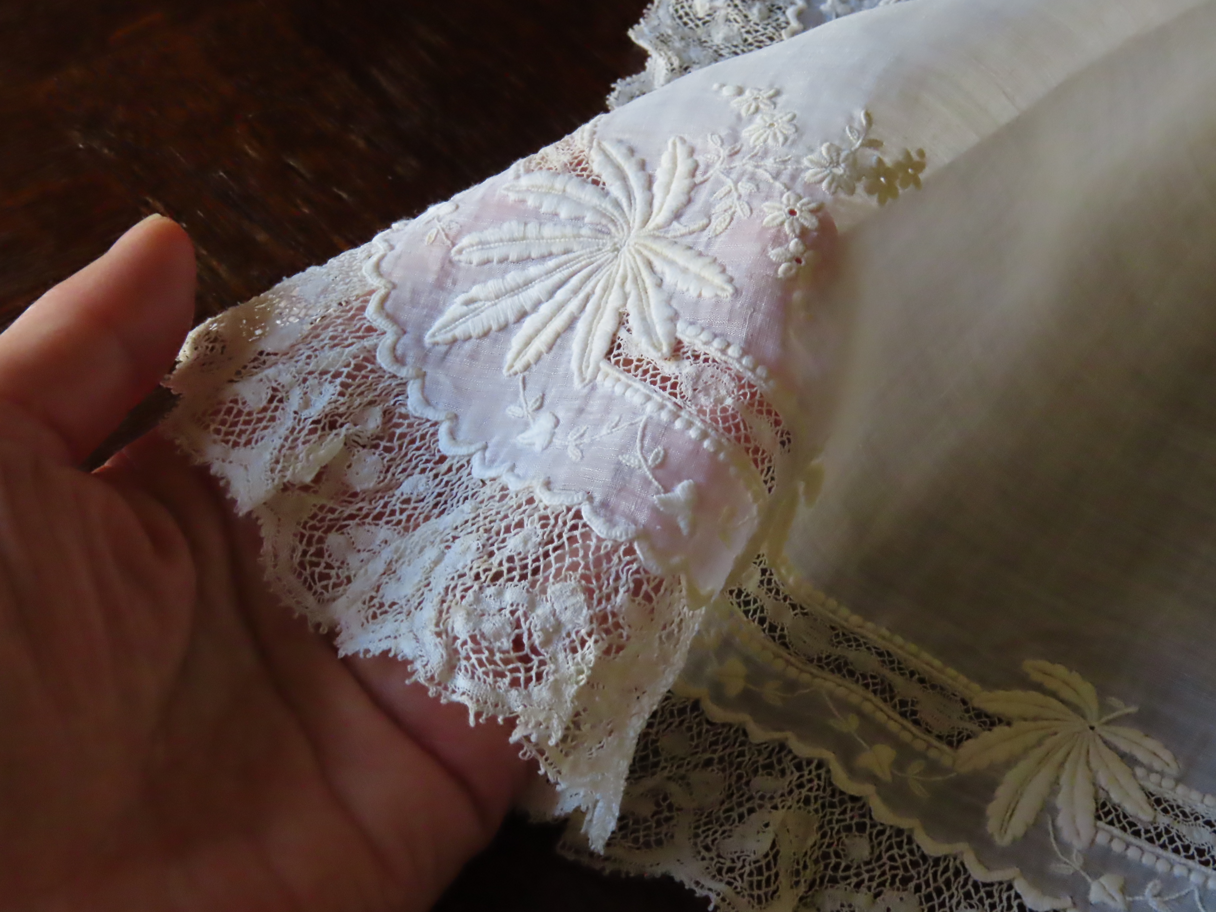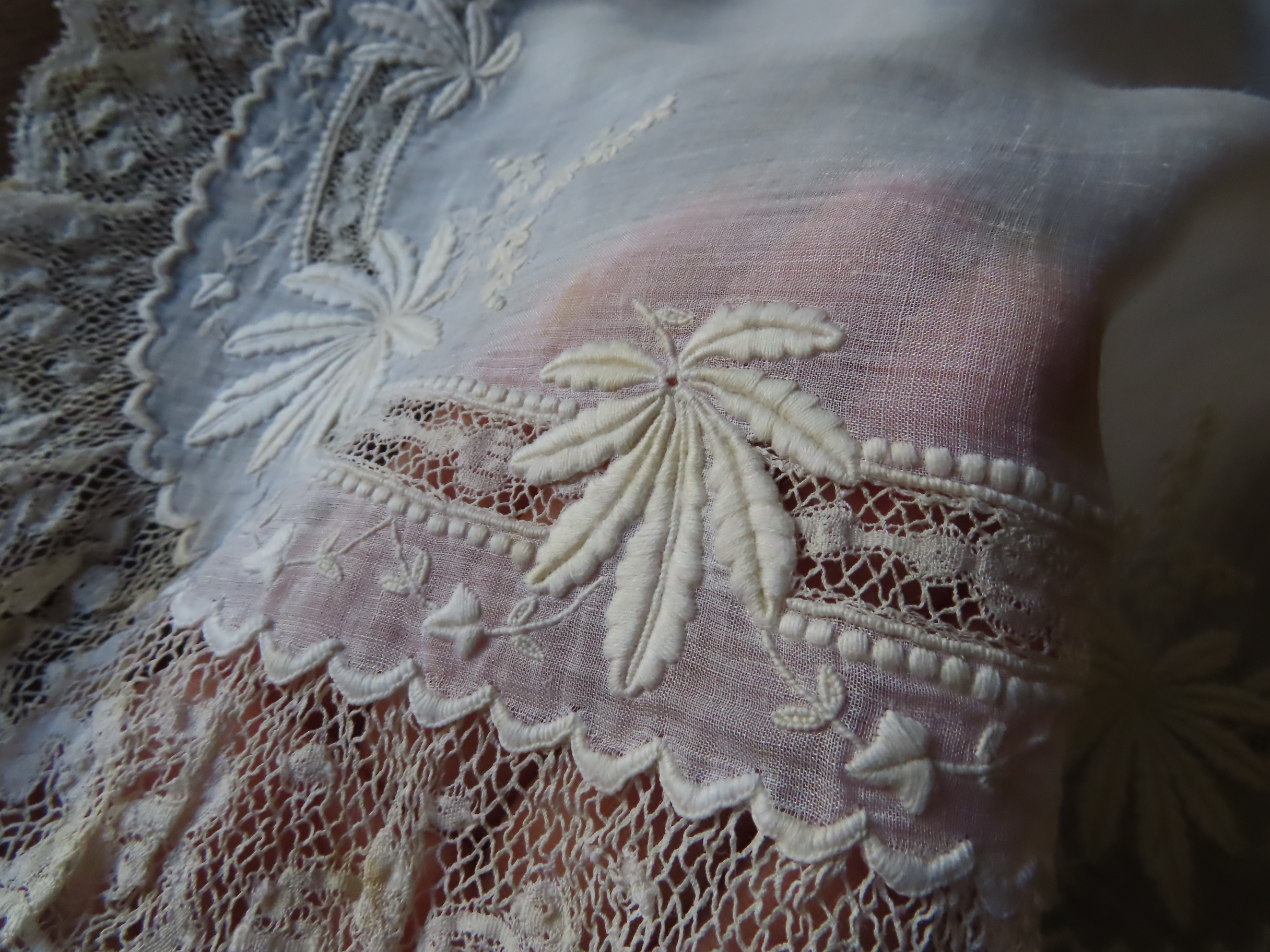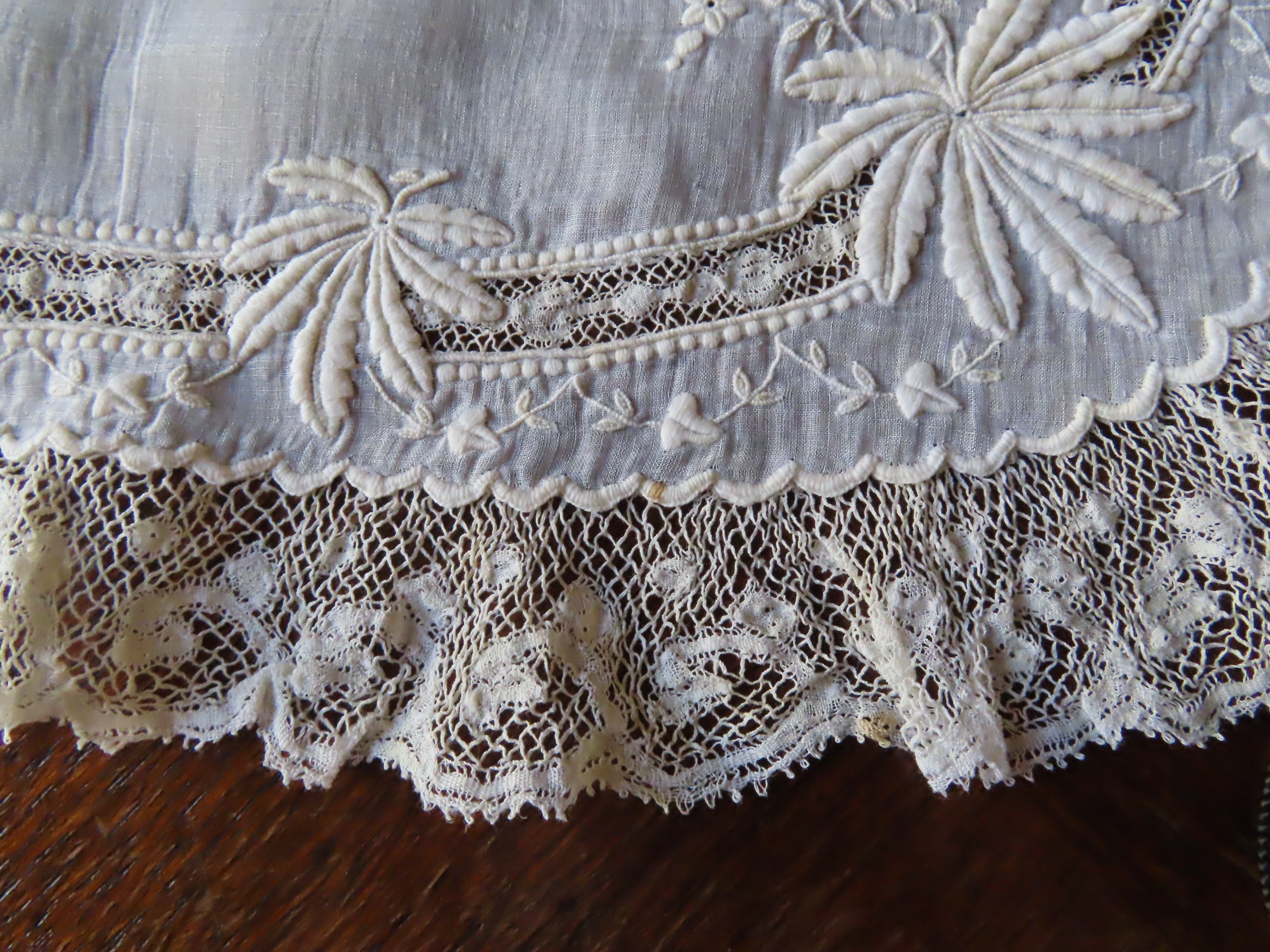 19世紀後期の、極薄いモスリンリネン地に白刺繍とヴァランシェレースのハンカチです。
