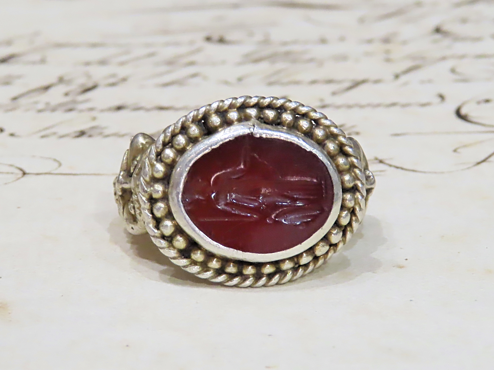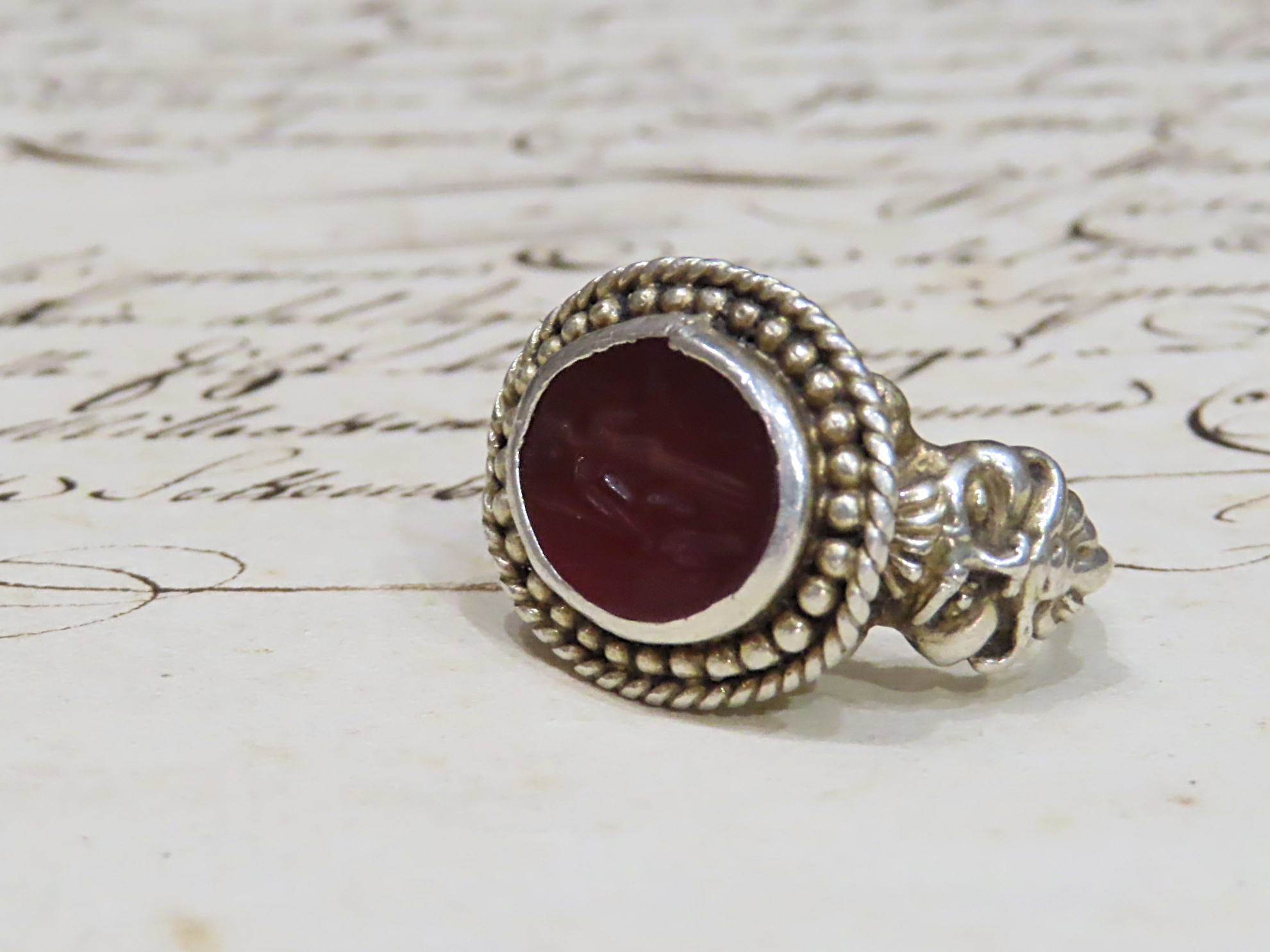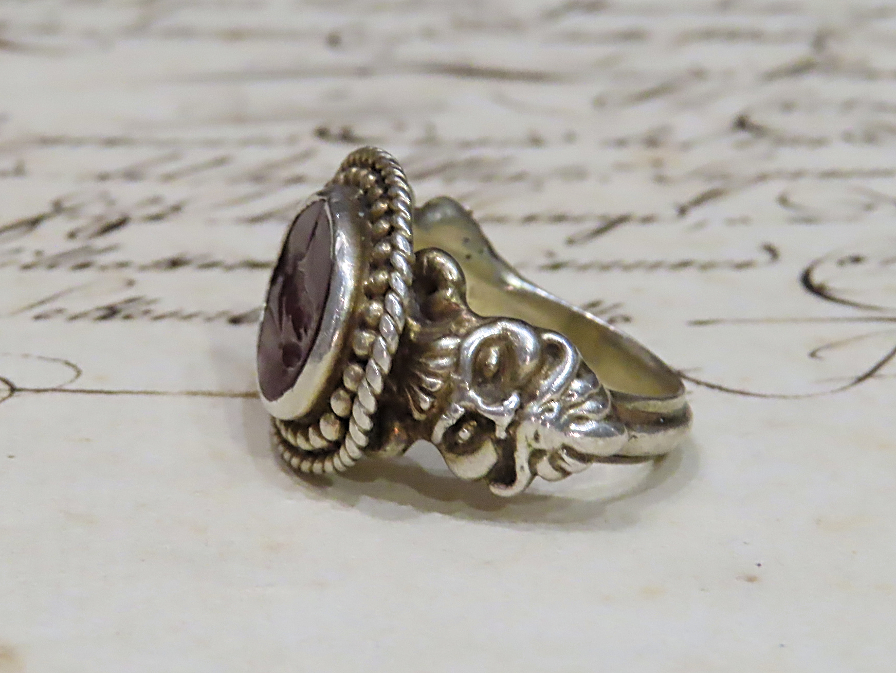 1世紀から2世紀頃と推測される古代ローマの、ミネルバ・メディカがインタリオ(沈み彫り)されたカーネリアンを、近代の銀のシャンク(推定1890-1910年代)にマウントしたリング。