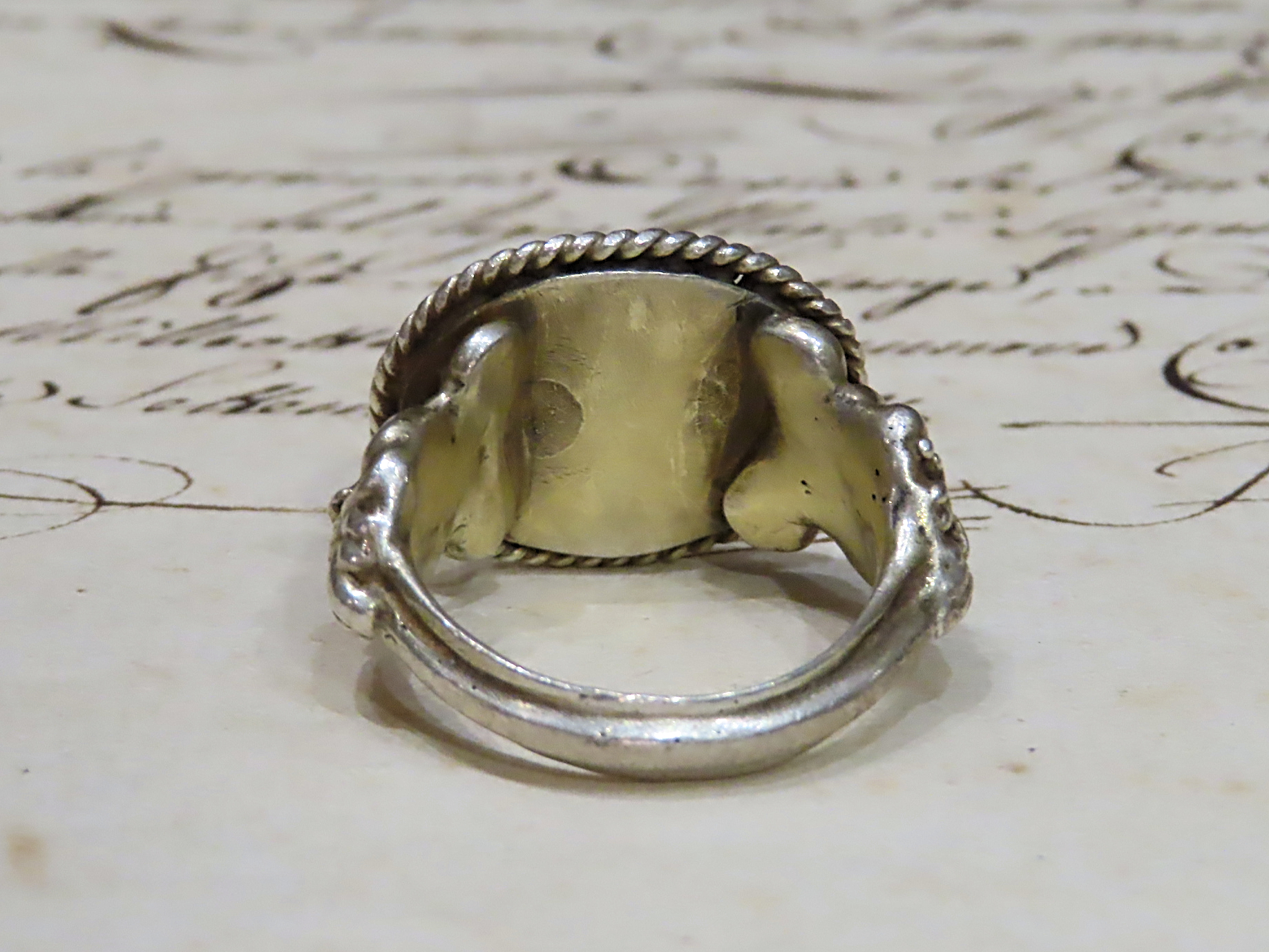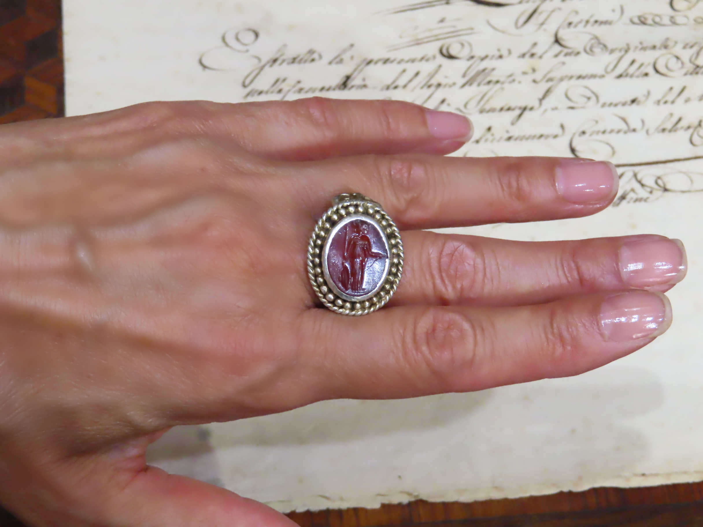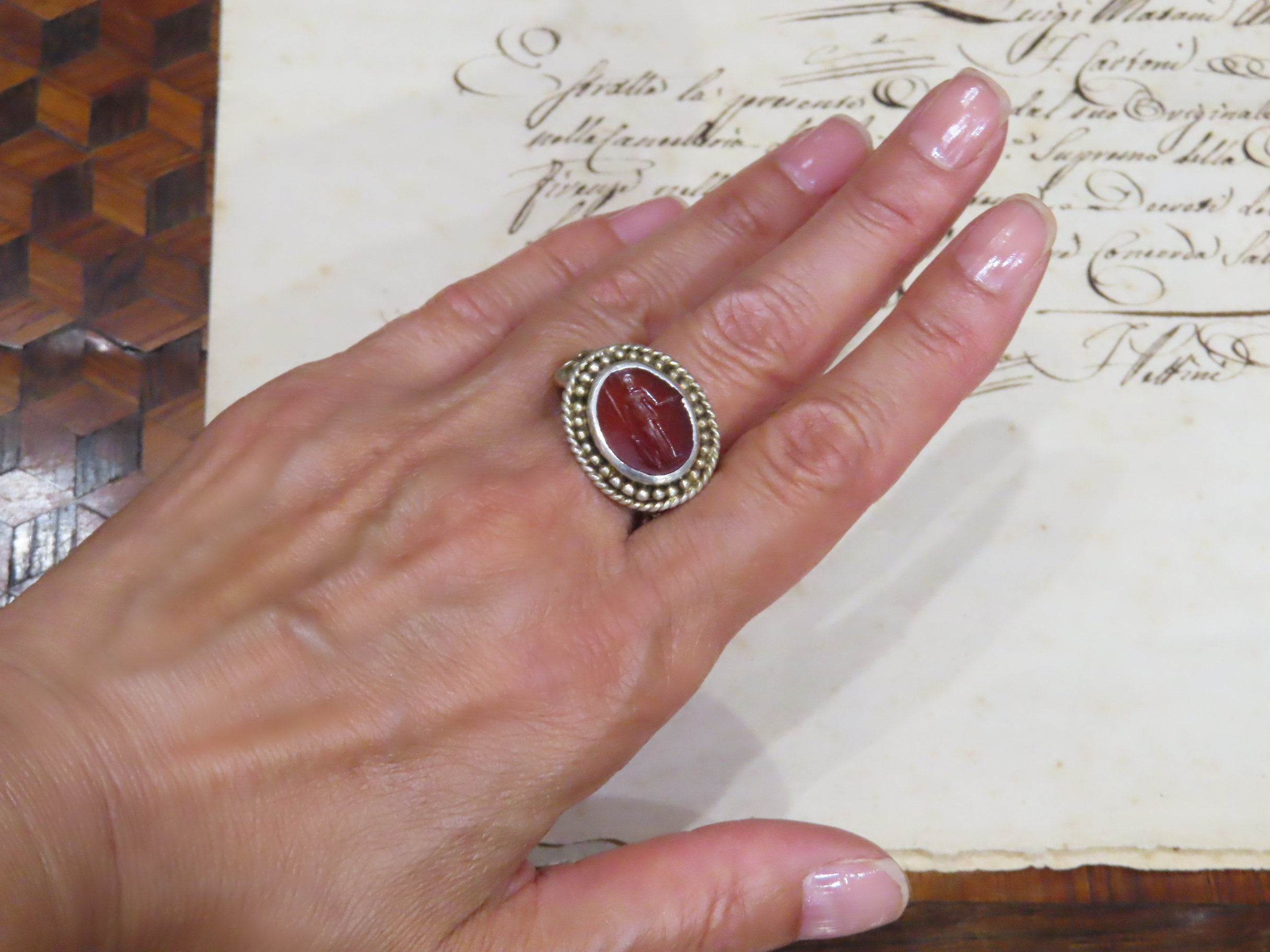1世紀から2世紀頃と推測される古代ローマの、ミネルバ・メディカがインタリオ(沈み彫り)されたカーネリアンを、近代の銀のシャンク(推定1890-1910年代)にマウントしたリング。