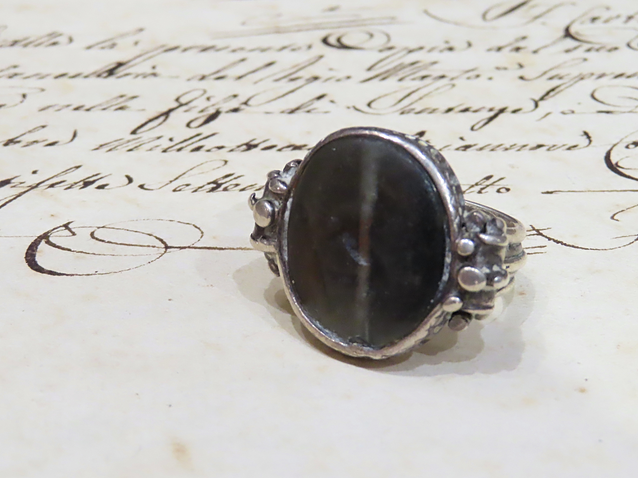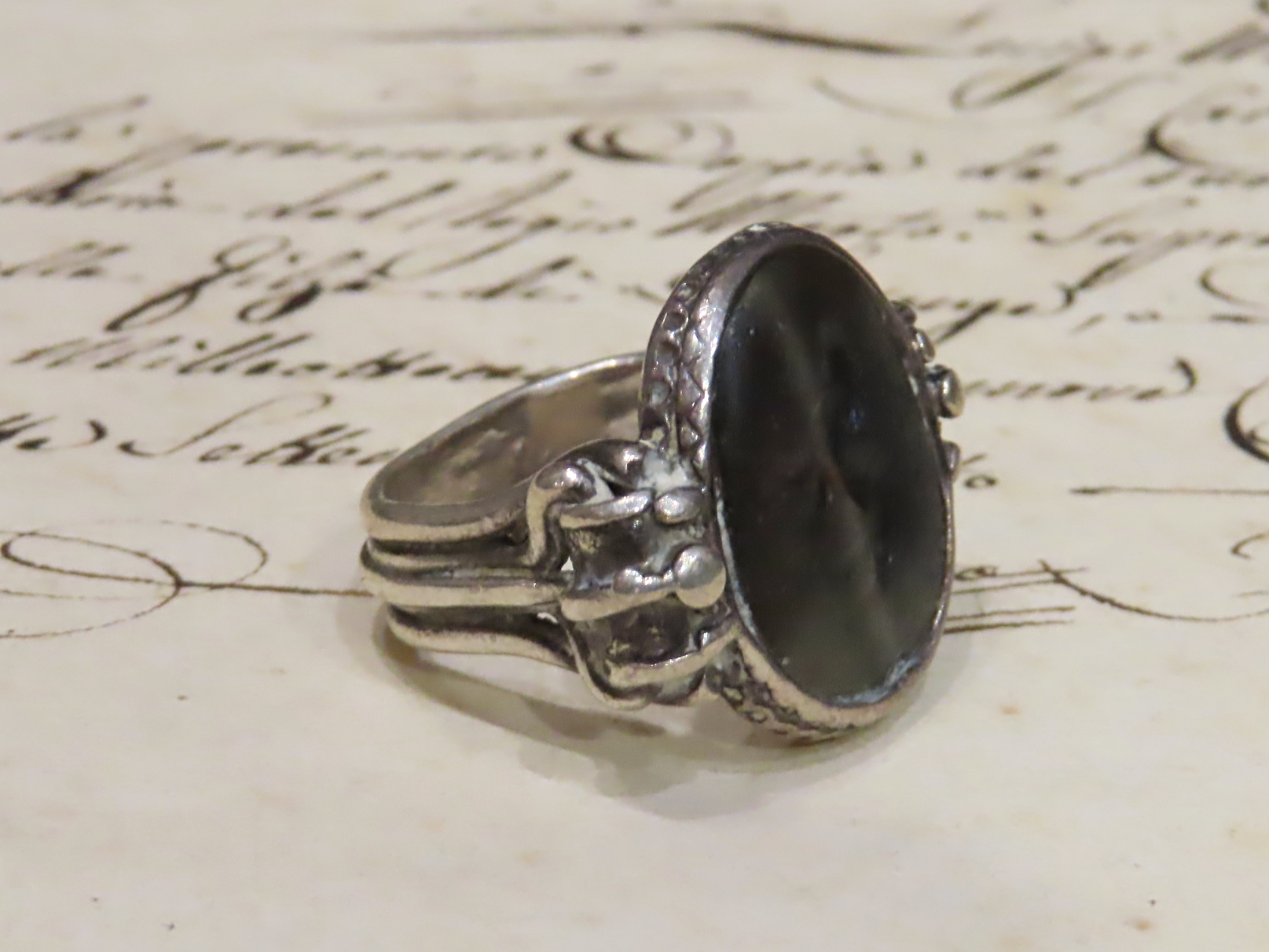 紀元前1世紀頃と推測される古代ローマの、躍動的なライオンがインタリオ(沈み彫り)されたペーストガラスを、近代の銀のシャンク(推定1880-90年頃)にマウントしたリング。