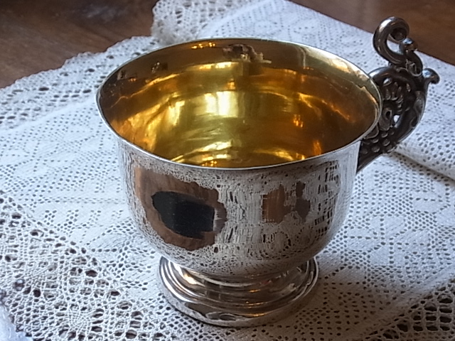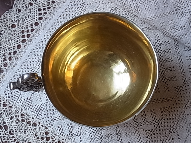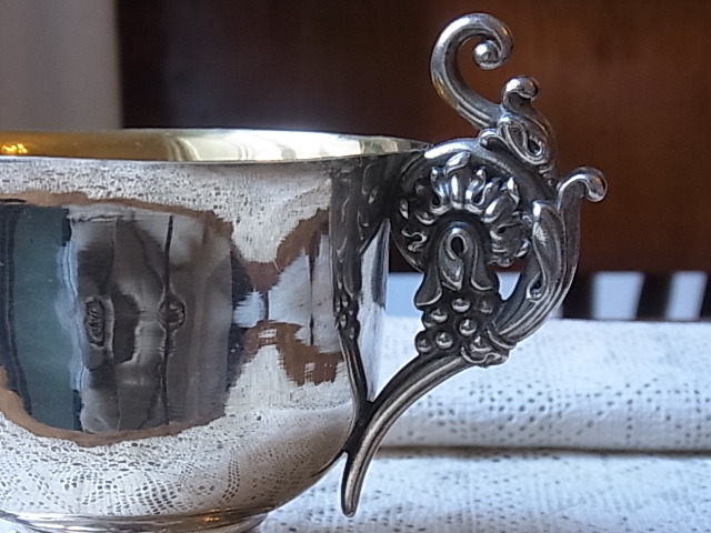 | どこか古代ローマの彫刻を思い出させるハンドルのデザイン。 地中海沿岸の天の恵み・・・ 葡萄の意匠。 カップ部分が鏡面で、このハンドルのみが立体的で古美色、このコントラストが美しいです。 ※カーソルを画像に置きますと、少し違う角度の写真がご覧になれます。 |