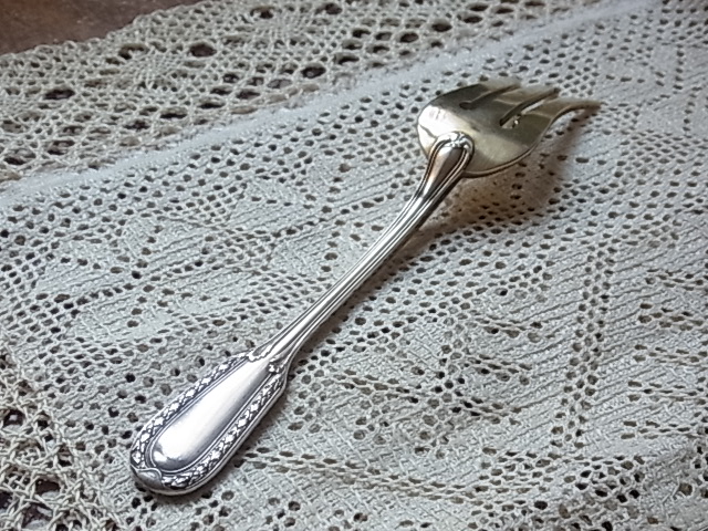 | サラミなどの取り分け用の、小さめのフォーク。 長さ(Length):13cm フランスの銀の刻印である「ミネルバの横顔」が見て取れます。 ※カーソルを画像に置くと、その拡大写真がご覧になれます。 |