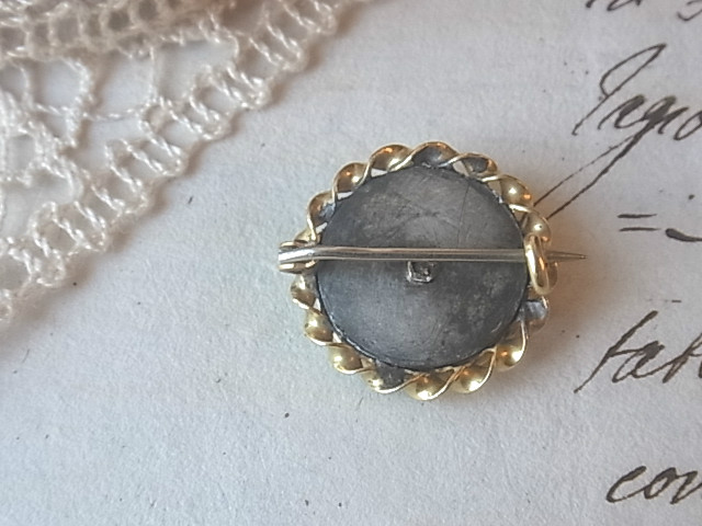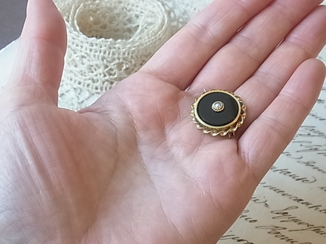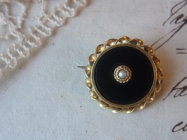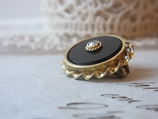 | ハイカラットゴールドのフレームに、艶やかなオニキス、天然のグレーパールを配した、19世紀後半期のブローチです。 おそらくイタリア、もしくは英国のもの。 |