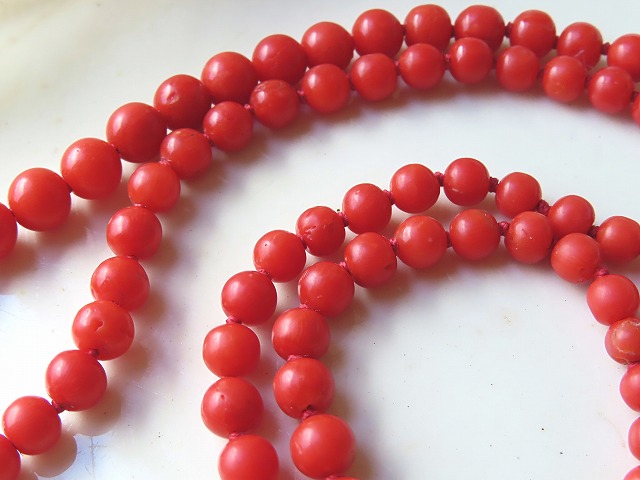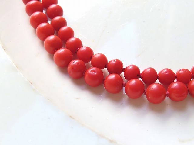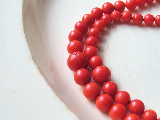 この頃は未だ、手作業で丸くしていたので、全くの正円でない粒もあります。 また、珊瑚独特の小さな穴などもありますが、身に着けて目に付くものでは無いです。 |