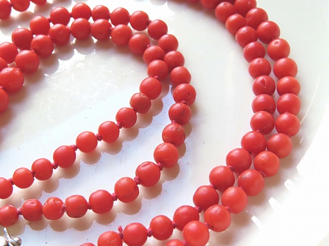 | ナポリ湾の地中海の珊瑚です。 外側が大きめ、内側が小さめの粒のグラデーションになっています。 糸替えは、近年にオールノットで済ませてあります。 ※カーソルを画像に置くと、ひっくり返した側の写真がご覧になれます。 |