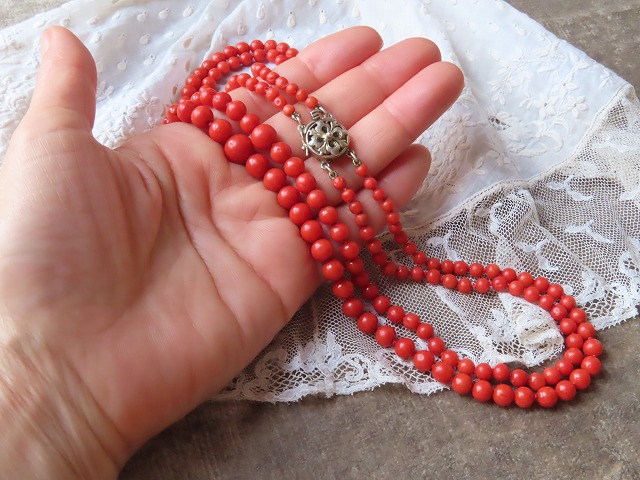 | 粒の大きさは、 Max 9ミリφと7.5ミリφ その左右の粒は6.6ミリφと6ミリΦほど。 Min3.5ミリφほど。 長さは、外側の連が49.5cm。 内側の連は、47cm。 アンティークらしい落ち着いた艶、ブラウザによっても色は違って見えますが、典型的な地中海珊瑚の明るいお色目。 |