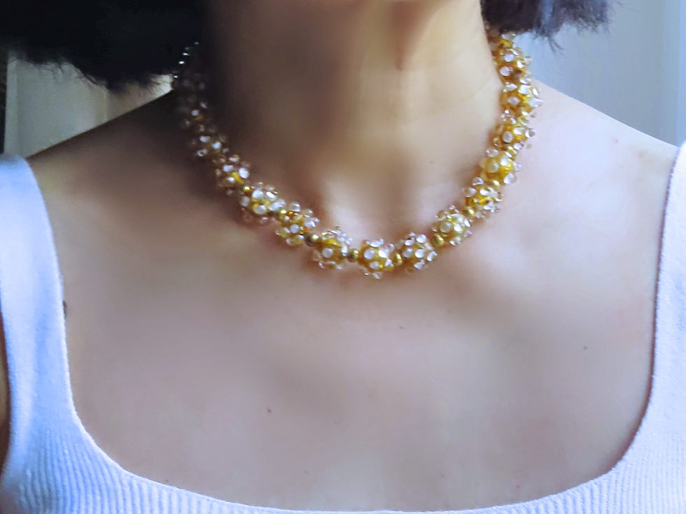 金箔を被せた球体に透明のガラスを乗せ、その上に乳白と透明ガラスを混ぜたドットが付けられています。