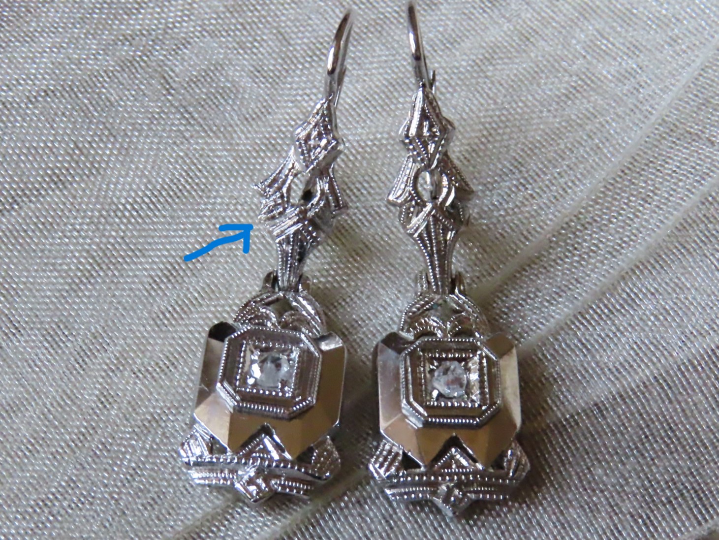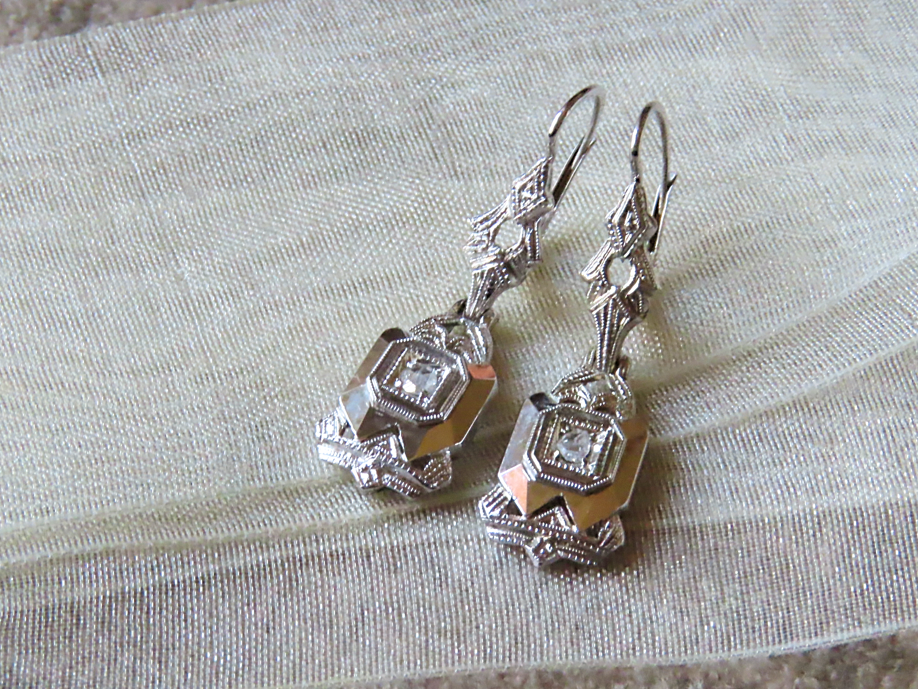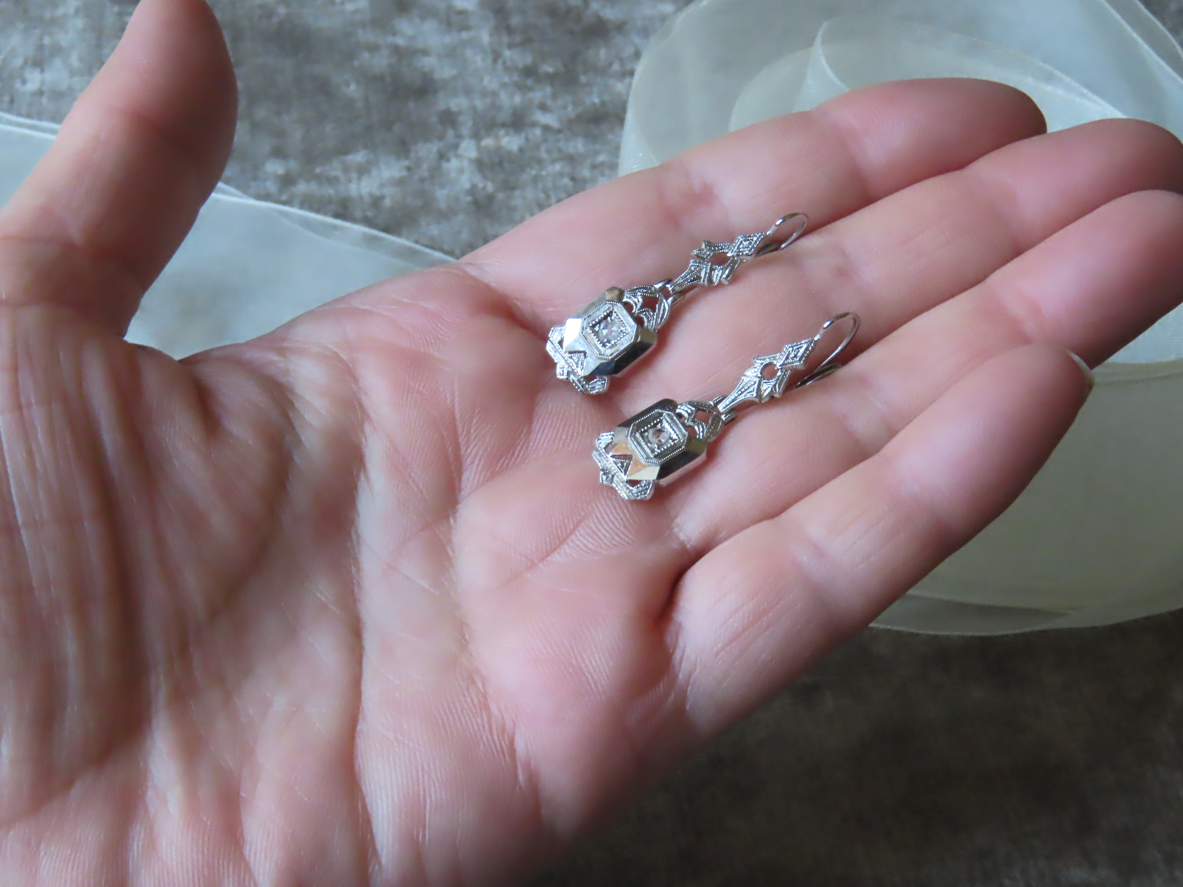 | 真ん中のダイヤは、やや不定形のローズカット。 フェザーや極小黒点もありますが、このピアスの重要な点はデザインです! エンパイアステートビルディングやクライスタービルを思い起こさせる、アメリカン・アールデコの要素を含んでいます。 フラットな面の周りを飾る、手彫りのミルグレインが、従来の意匠とはまた別の効果を上げています。 厚みは、3.5ミリ、重さは2.5gです。 |
