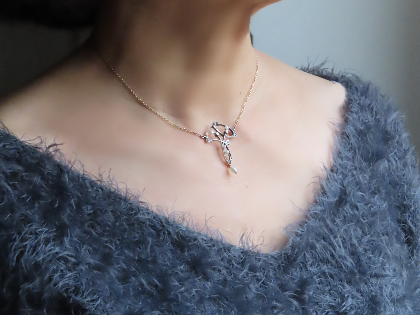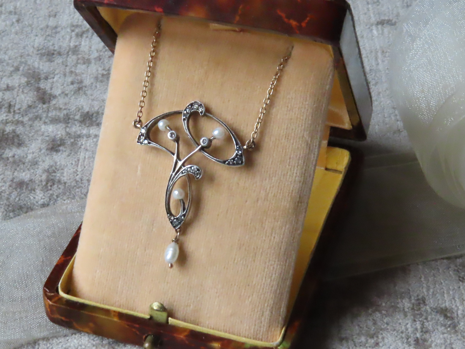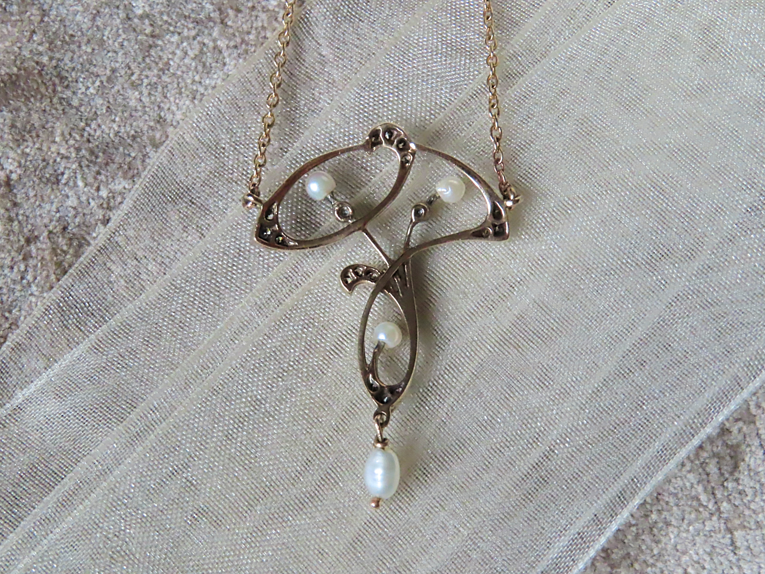 | 20世紀初頭のイタリアの、天然真珠とダイヤモンドのペンダントネックレス。 装いも白が基本になり、ジュエリーも白いものが好まれた、優雅なリバティ時代(=エドワーディアン)。 やや小ぶりで繊細。 このタイプのデザインはブローチが多いですが、こちらはペンダントで使いやすいと思います。 12Kのチェーン付です。*^^* |