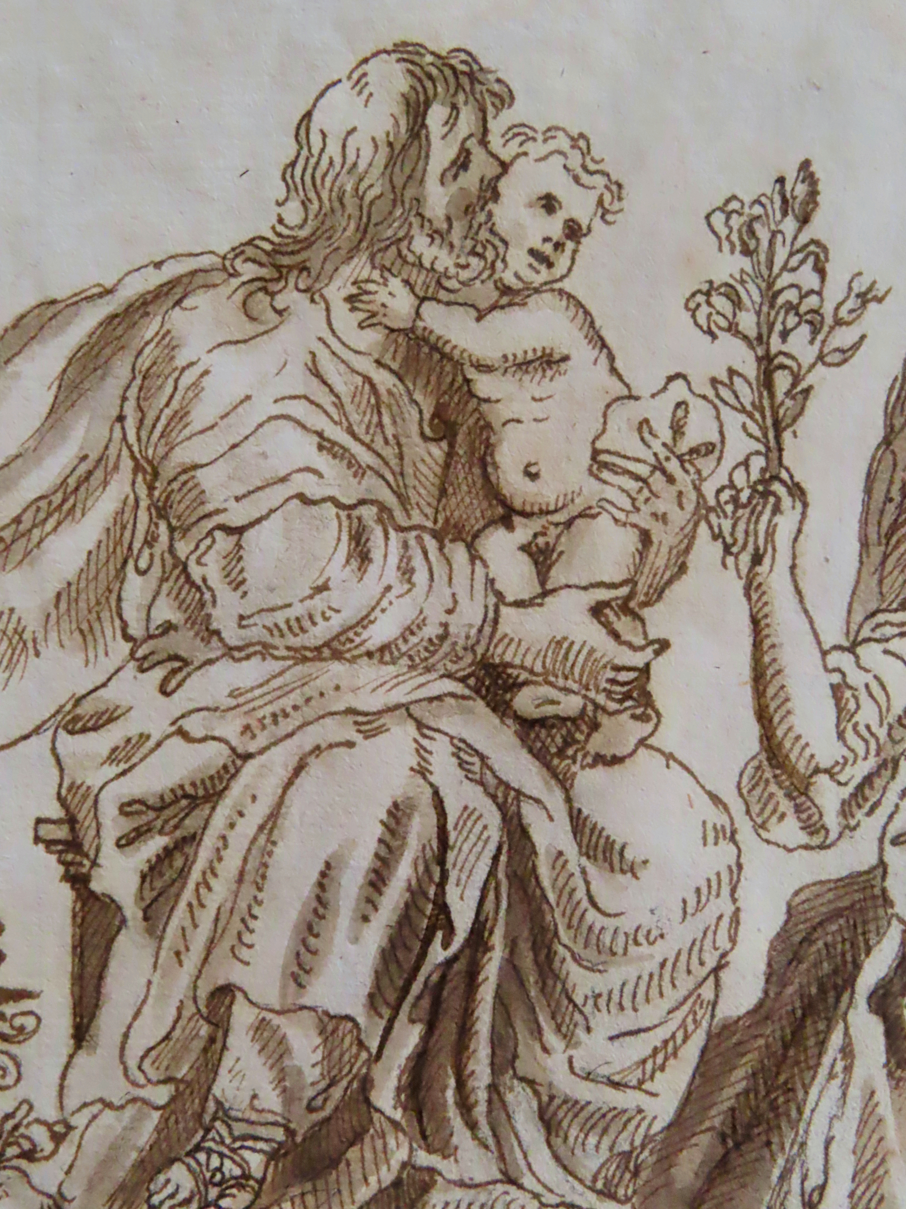 | フィレンツェのコレクターの収集品からの作品。 羽根ペンで描かれた、18世紀(推定)の素描です。 直筆のペンの強弱。 的確なデッサン力。 詳しくは分からないのですが、天使が幼子を、清らかさを洗わず百合の花で祝福しています。 |