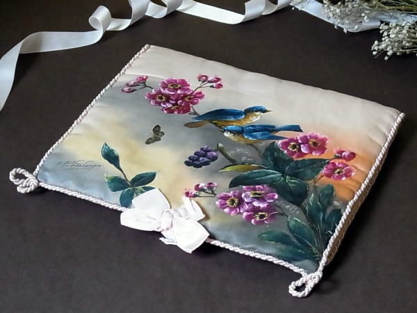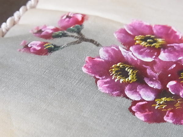 ピンクのサテン地に、蝶を見つめる小鳥と、咲き誇る杏(かな?)の花。