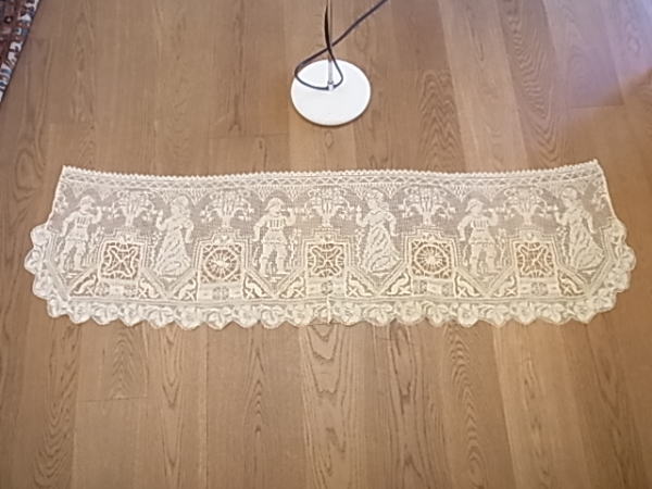 | 田舎のお祭りかしら? 楽しそうに向かい合って踊る二人の、フィレレース。 本来は、『マントバーナ』と呼ばれるカーテンレールを隠すボックスの上に、装飾として取り付けられたものですが、カフェカーテンとしてもぴったりで、またピアノのカバー等にリメイクしても、美しいです。 |