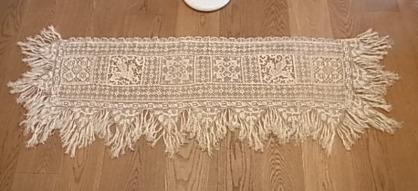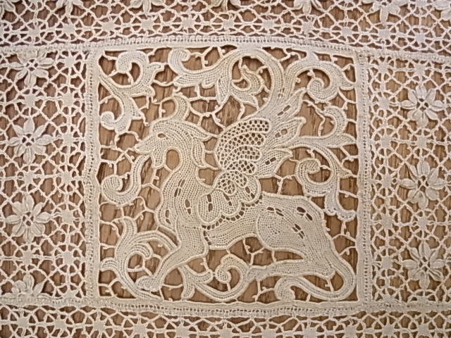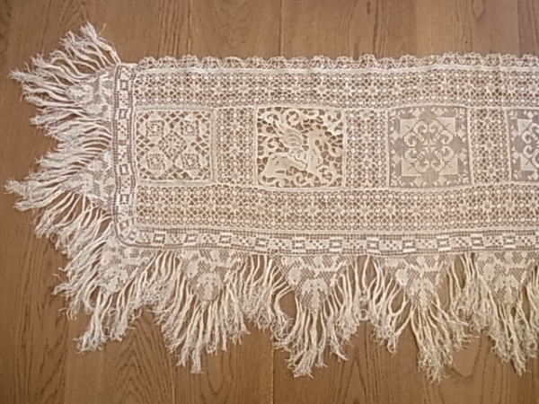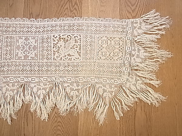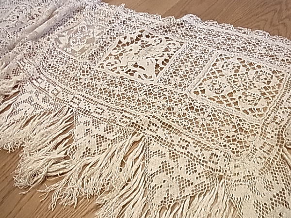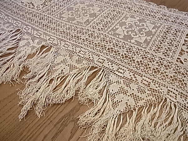 | モチーフの周りの、みっしりと施されたボビンレースも見事です。 その下に付けられた、たっぷりとしたフリンジが、ゴージャスさを醸し出しています。 ※カーソルを画像の上に置くと、拡大写真がご覧になれます。 |