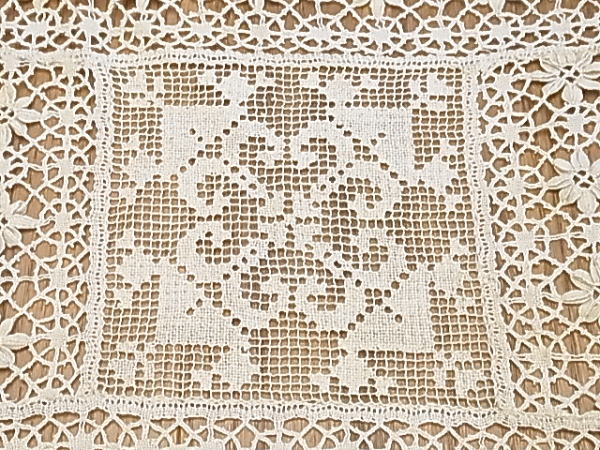 | その周りの4つのモチーフは、フィレレースで、やや軽やかさと抜け感を加えています。 額装しても、またソファの背もたれなどにも映えます。 完品です。 価値のあるハンドメイドのレース。 佳いものをひとつ、、、とお思いだった方に・・・・ ※カーソルを画像の上に置くと、拡大写真がご覧になれます。 |