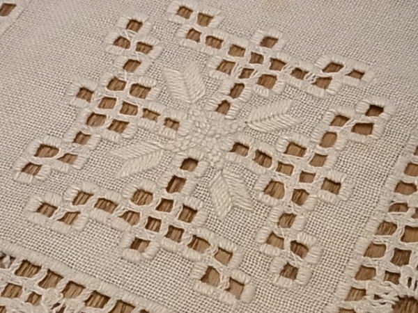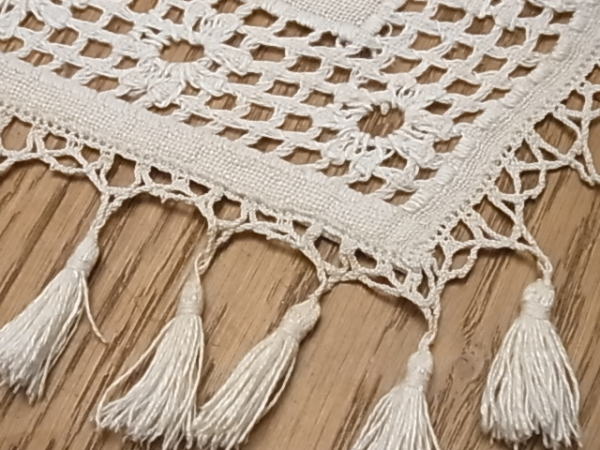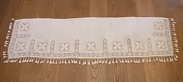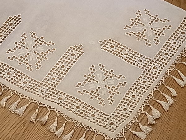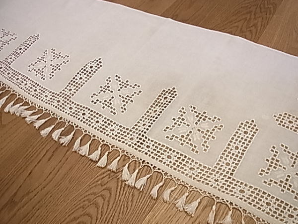| イタリアのトスカーナ地方、特にフィレンツェ近辺の伝統技法、PUNTO ANTICO、プント・アンティーコです。 本来は、『マントバーナ』と呼ばれる、カーテンレールを隠すボックスの上に、装飾として取り付けられたものですが、カフェカーテンとしてもぴったりで、またピアノのカバー等にリメイクしても、美しいです。 |