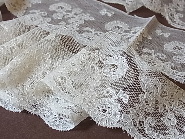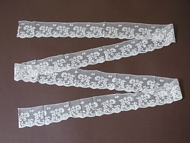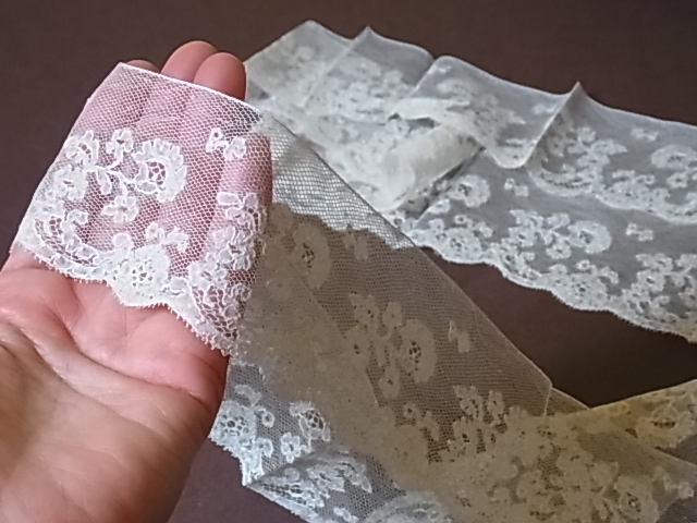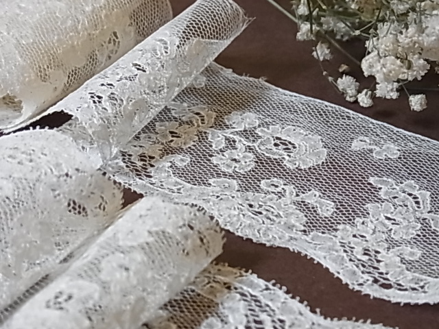 | お色は爽やかな白。 ボビンレースの技法で作られる、ヴァランシェレース。 カタカタとボビンを交差させながら織られたものです。 19世紀〜20世紀初頭には、女性の繊細なボディスやドロワーズ用にも、人気がありました。 |