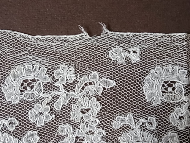 | 1箇所のみ、レースのダメージがあります。 上部には切れが複数見られますが、縫い付ければわからなくなります。 |