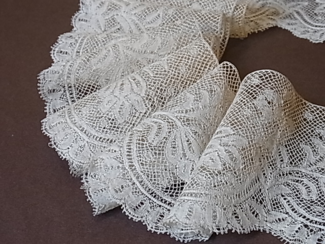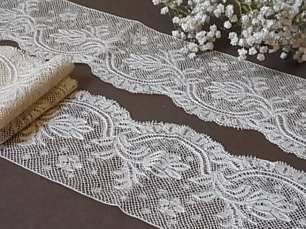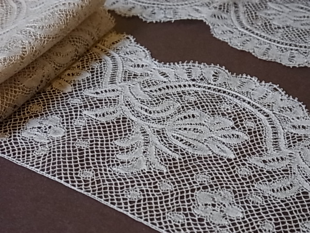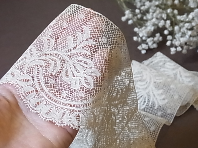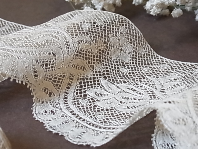 | ボビンレースの技法で作られる、ヴァランシェレース。 カタカタとボビンを交差させながら織られたものです。 19世紀〜20世紀初頭には、女性の繊細なボディスやドロワーズ用にも、人気がありました。 ※カーソルを画像に置きますと、拡大写真がご覧になれます。 |