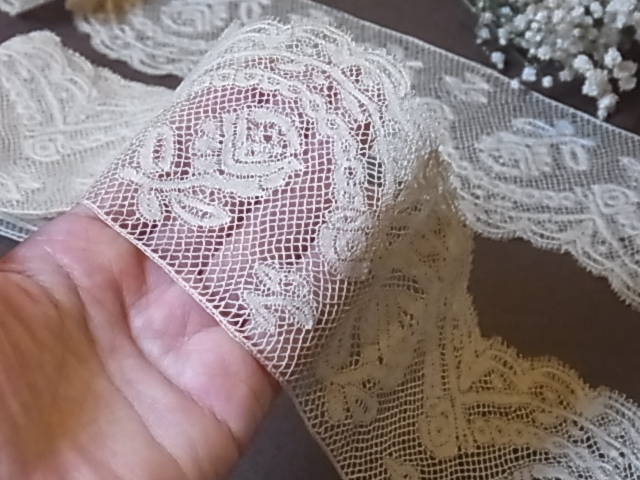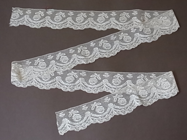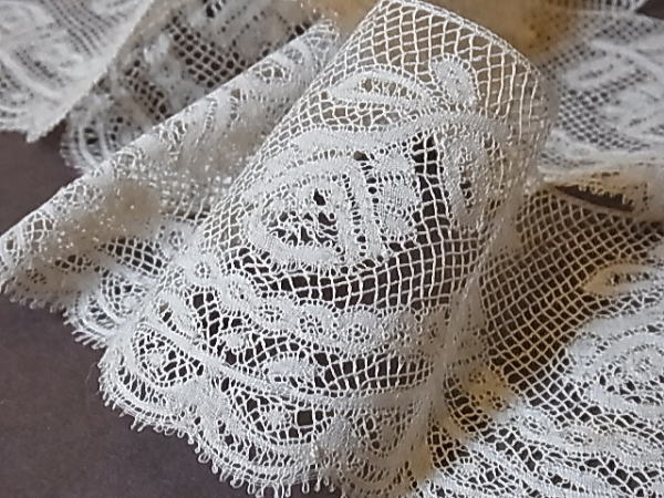 ボビンレースの技法で作られる、ヴァランシェレース。 カタカタとボビンを交差させながら織られたものです。 19世紀〜20世紀初頭には、女性の繊細なボディスやドロワーズ用にも、人気がありました。 |